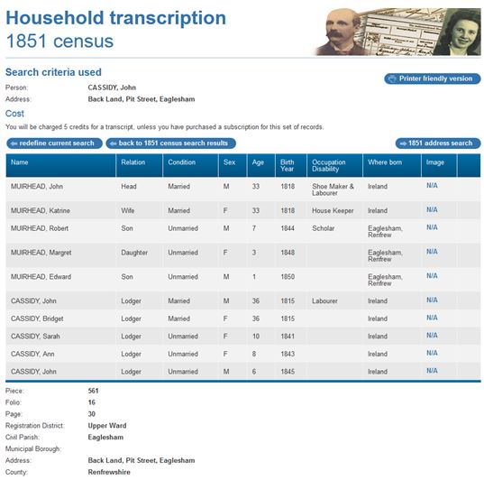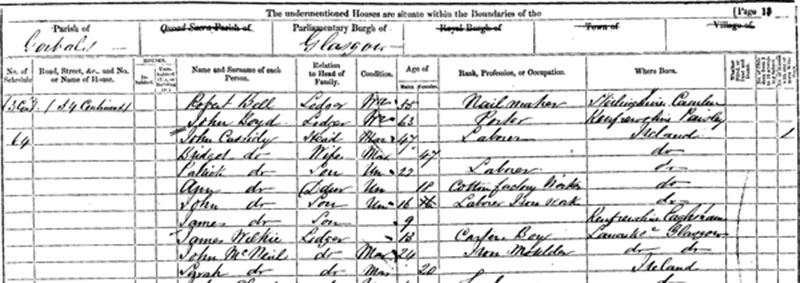 Comparing these images I concluded that John and Bridget Cassidy were recorded as “lodgers” because John was not the head of the household – the family lived in the household of John and Katrine Muirhead. It is reasonable, of course, to think that they were husband and wife since both are said to be married and they are the same age. It is also clear that they have three children, Sarah aged 10, Ann aged 8 and John aged 6. All are said to have been born in Ireland.