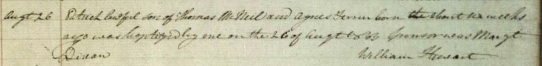 In researching the Neils (unlike the Ramsays), it soon becomes apparent that the surname, Neil, is very fluid. People can be referred to as Neill, Neil, O’Neil, McNeil, MacNeil and any number of variations of the spelling of these names. There are even examples in this narrative of the same person being referred to by all these name variations during their lifetime. The variations are sometimes the inventions of the officials who recorded the information, spelling names as they heard them or as they expected them to be spelled. Sometimes, at least in the earlier years of this story, the person who was being recorded was illiterate or could read but could not write. It was only when people could write their own names that they started to be more fixed in their spelling. In general, though, names were more fluid in the past than they are now. When an Irish person referred to someone, they could be an O’Neill; if it was a Scottish person that referred to that same person, they could be a McNeil or a MacNeill. A general discussion of the O’Neil/Neil issue can be found here but my approach to this problem on this site has been to quote names as they are actually written in the documents but, for the sake of clarity in telling the story, I have settled on a sort of common denominator name as seen above in the generational links where they are all Neils unless there is a specific reason to mention a variation.