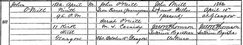 At the 1861 Censes John and Sarah were living with Sarah’s parents at 54 Main Street, Gorbals where they were recorded as John and Sarah McNeil. John was a 24 year-old iron moulder and Sarah was recorded as aged 20. By the time of the next census they have their own household at 151 Main Street, Gorbals, Glasgow. (At the 1871 Census the Cassidy’s were living at 11 Kirk Street, Glasgow).
