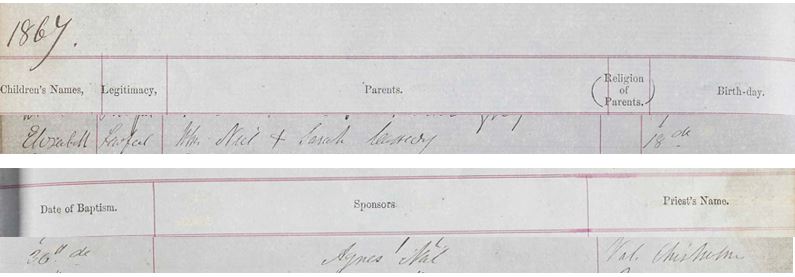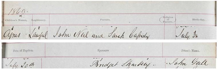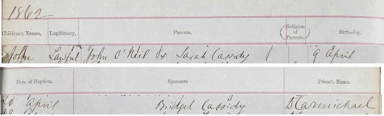 “John Neill was the lawful son of Thomas Neill and Agnes Feran. He was born 14th April 1836 and baptised 4th July 1836. The name of Sponsors were Felix McPake and Helen Edmund and the clergyman was Peter Forbes.”