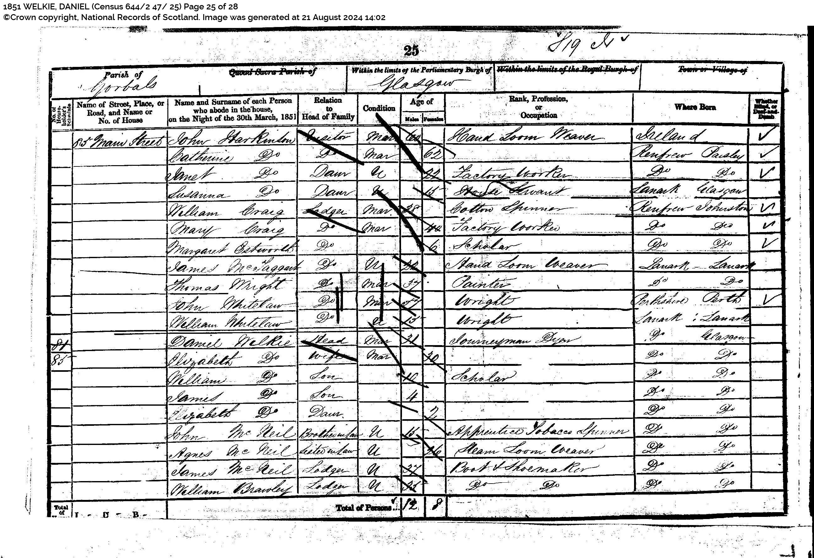 1851 Census Return for 85 Main Street, Gorbals, Lanarkshire, Scotland. Scotland’s People 1851 WELKIE, DANIEL (Census 644/2 47/ 25) Page 25 of 28