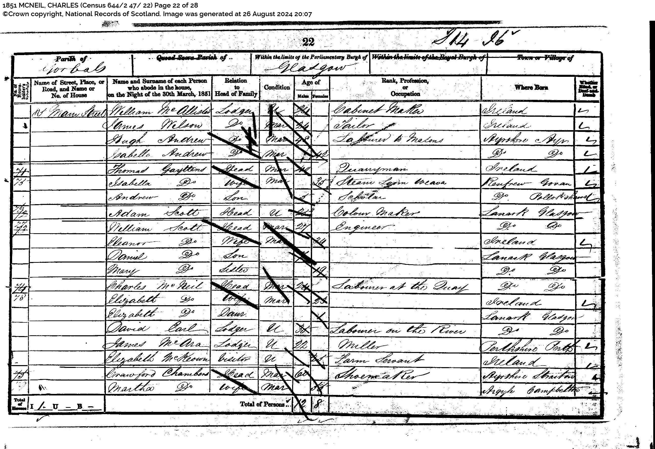1851 Census Return for 84 Main Street, Gorbals, Glasgow. Scotland’s People – 1851 MCNEIL, CHARLES (Census 644/2 47/ 22) Page 22 of 28