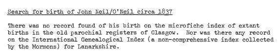 “John Neill was the lawful son of Thomas Neill and Agnes Feran. He was born 14th April 1836 and baptised 4th July 1836. The name of Sponsors were Felix McPake and Helen Edmund and the clergyman was Peter Forbes.”
