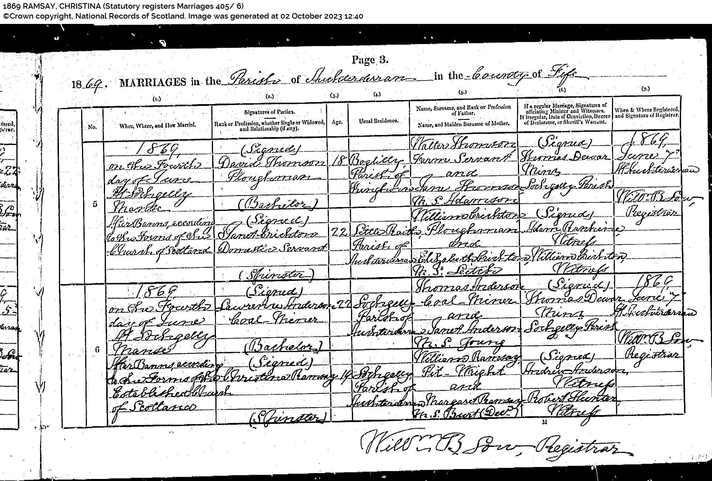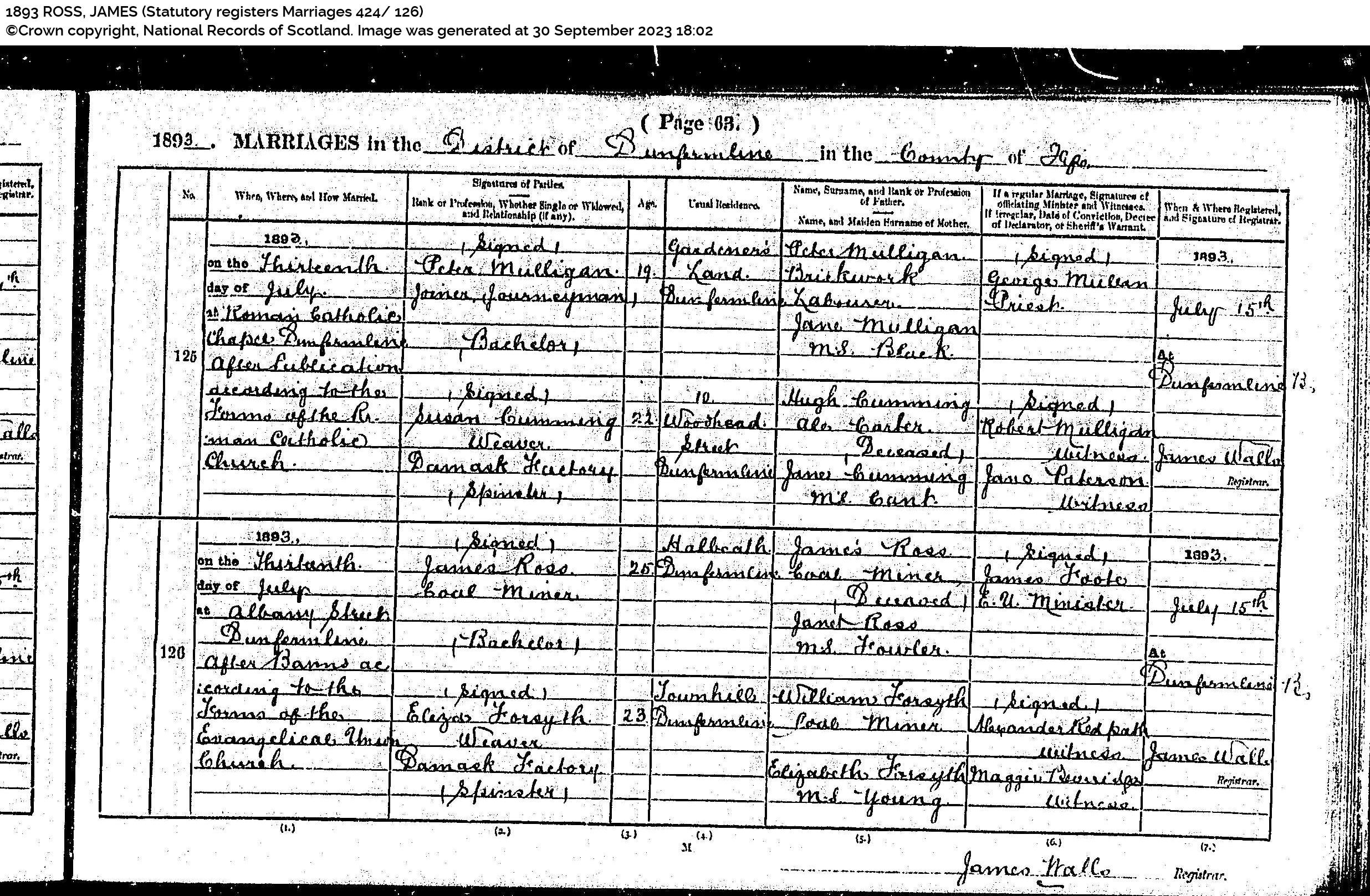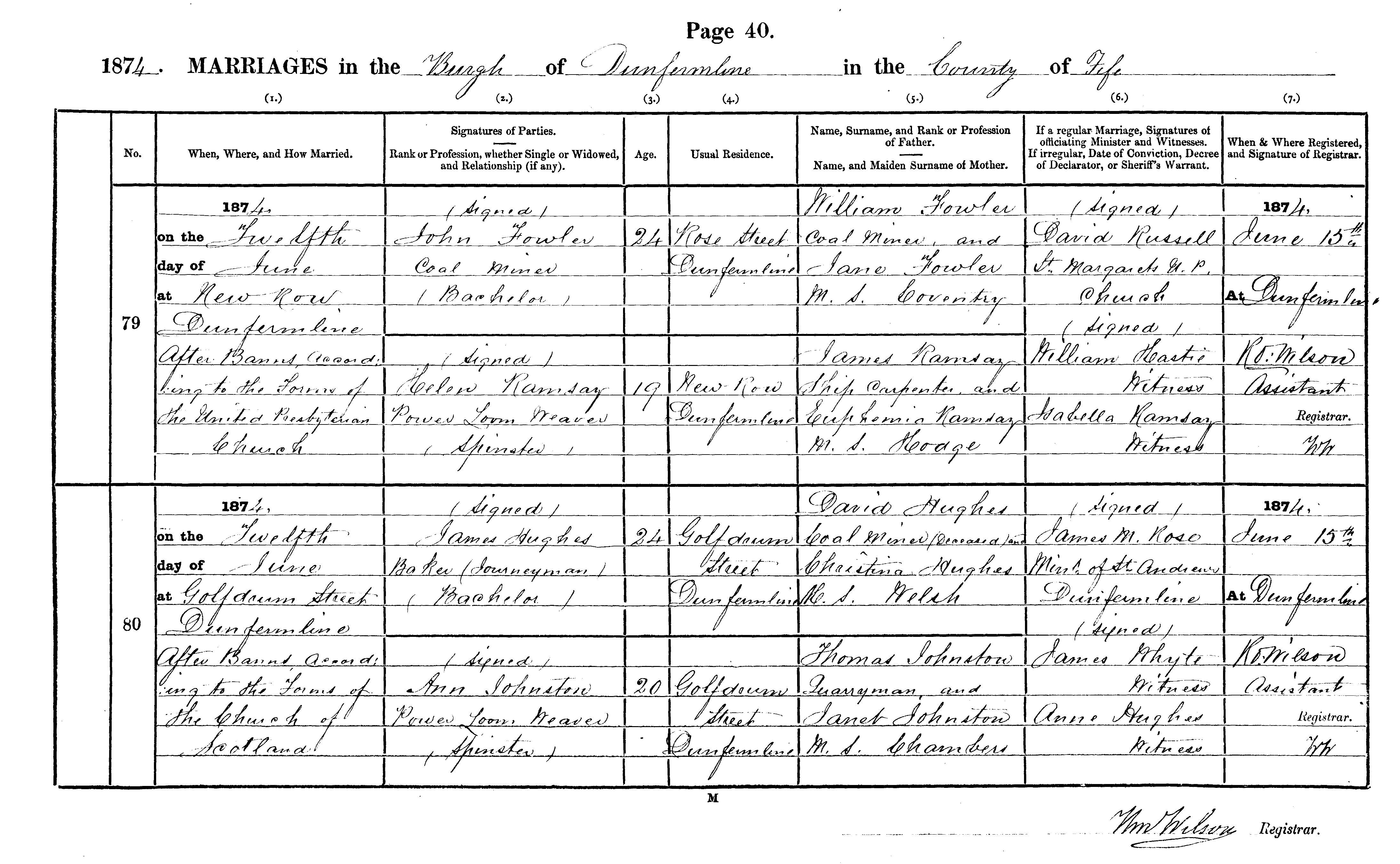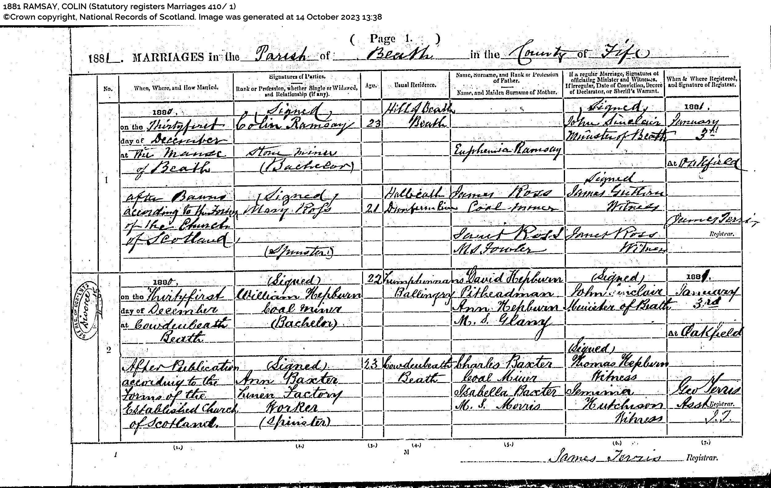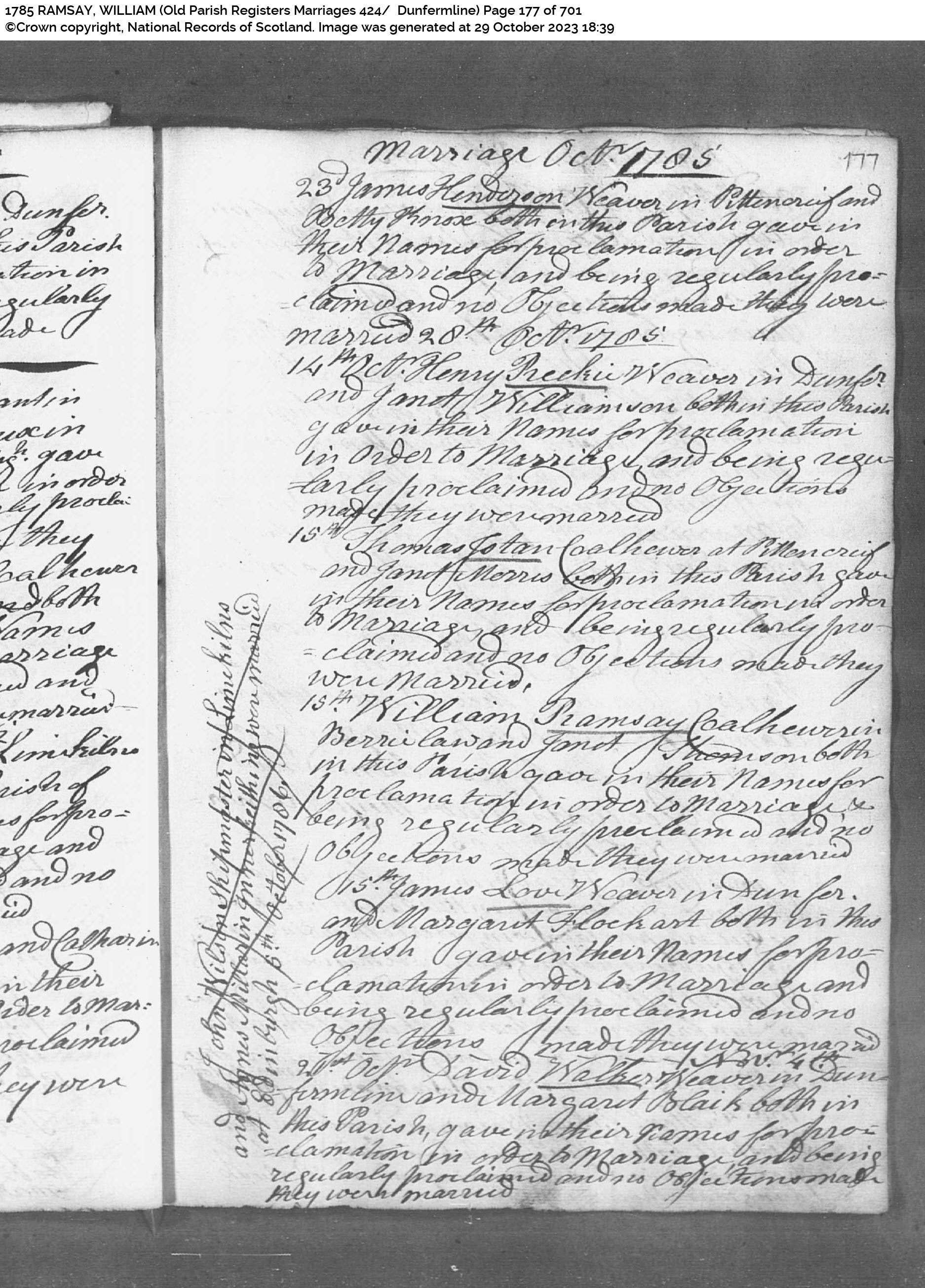 | 2 | SP | CH | MAR | 1785 | R002.jpg | 1785-10-15 MAR William Ramsay + Janet Thomson – Dunfermline [[R002]] | LOCAL | ONLINE |