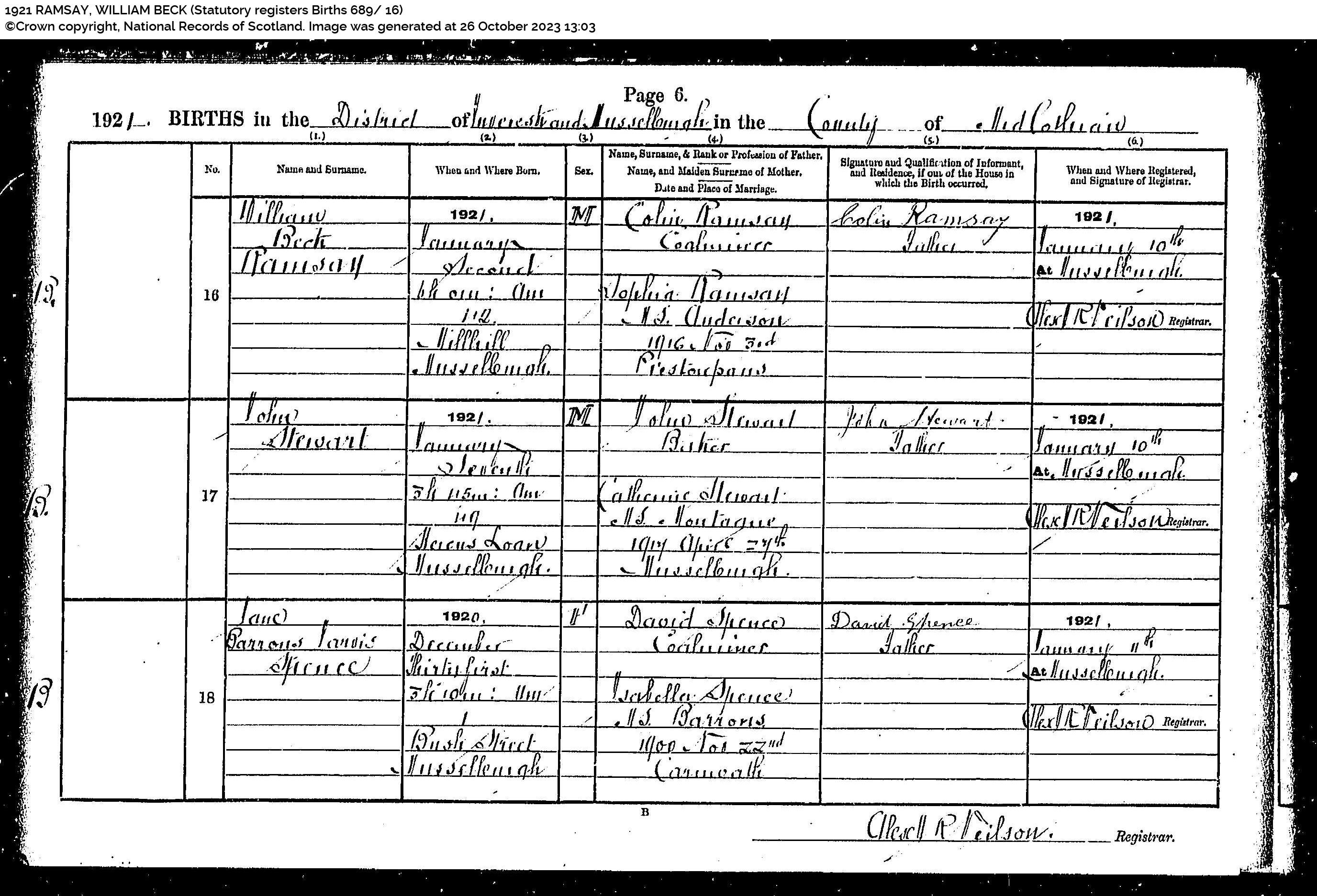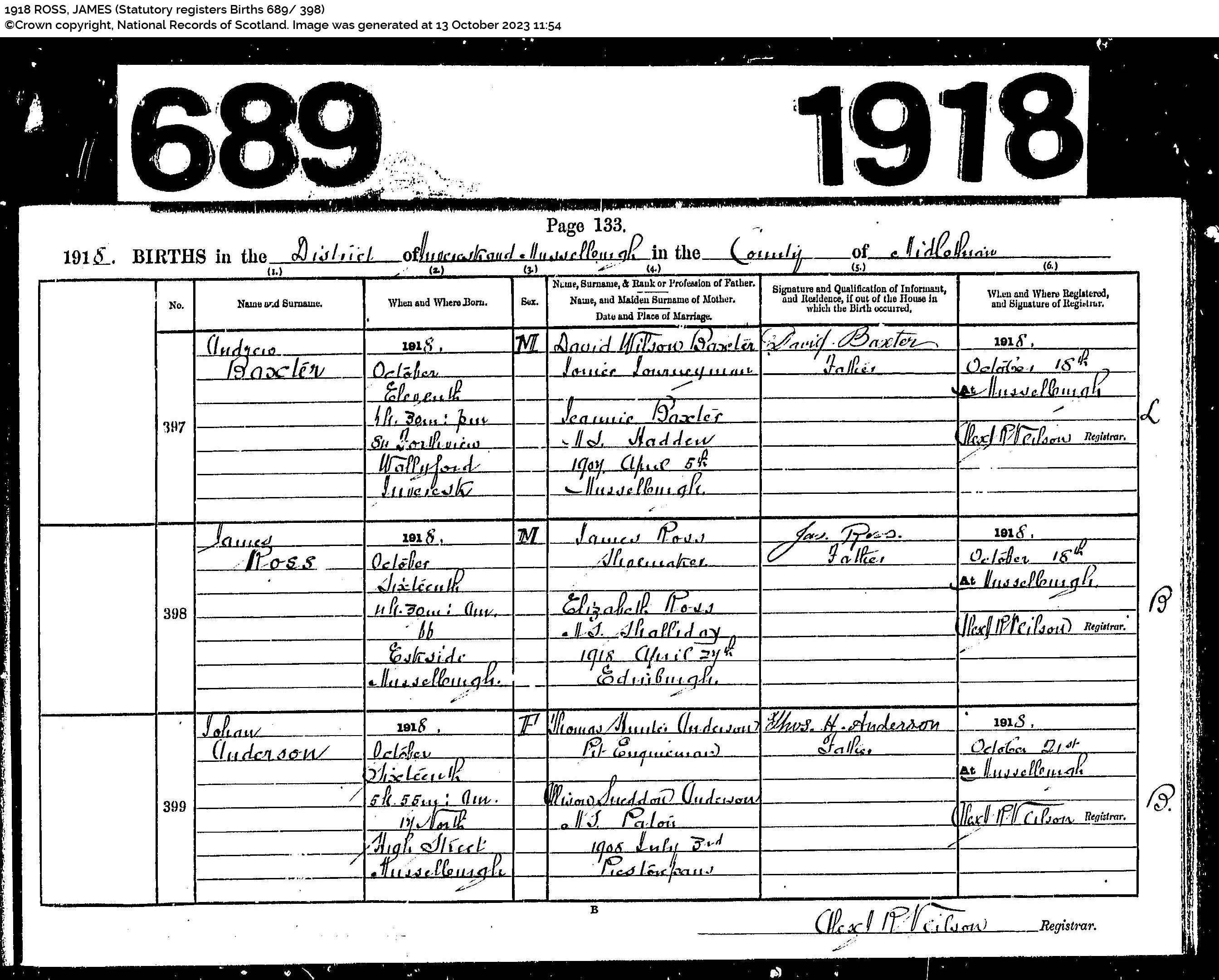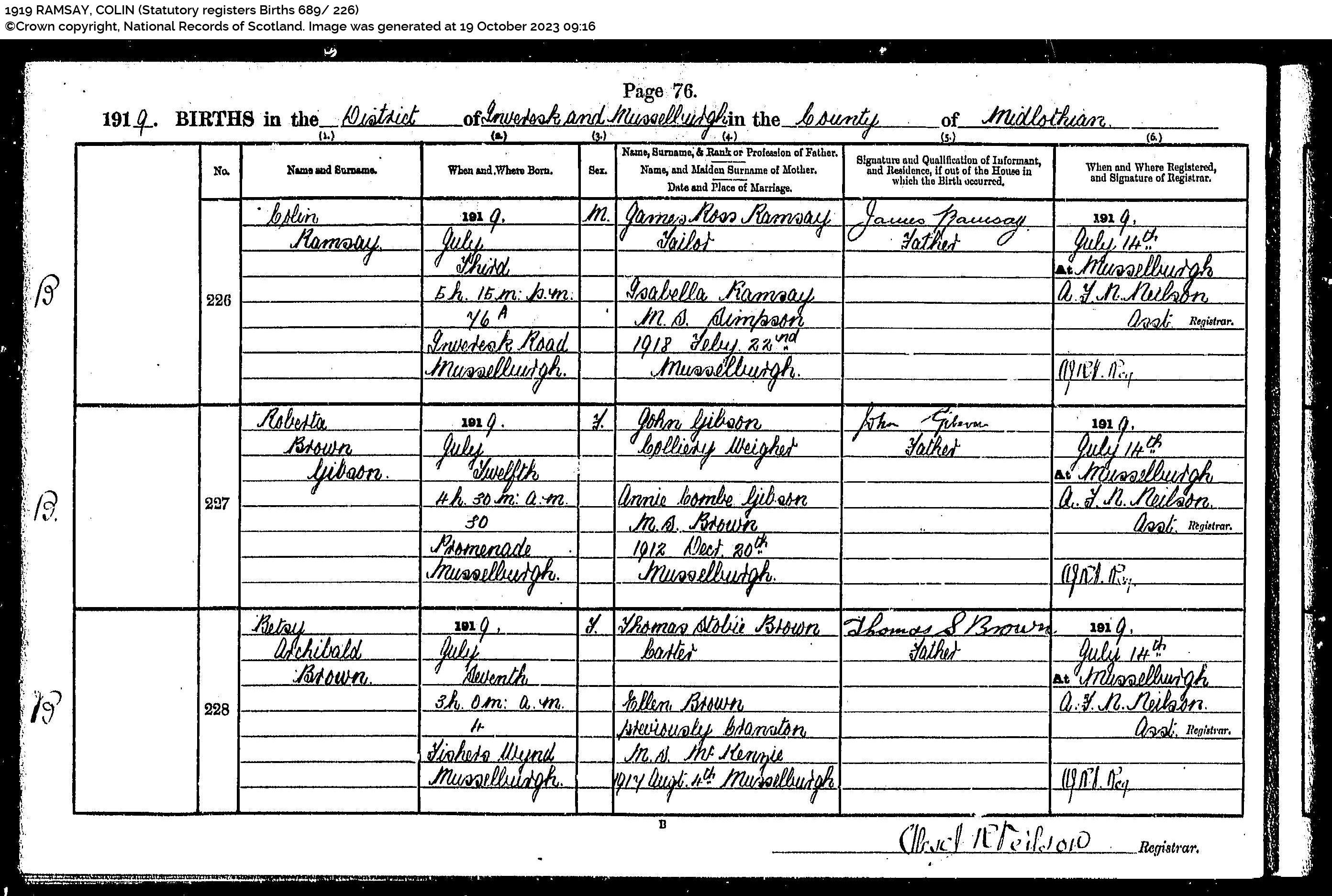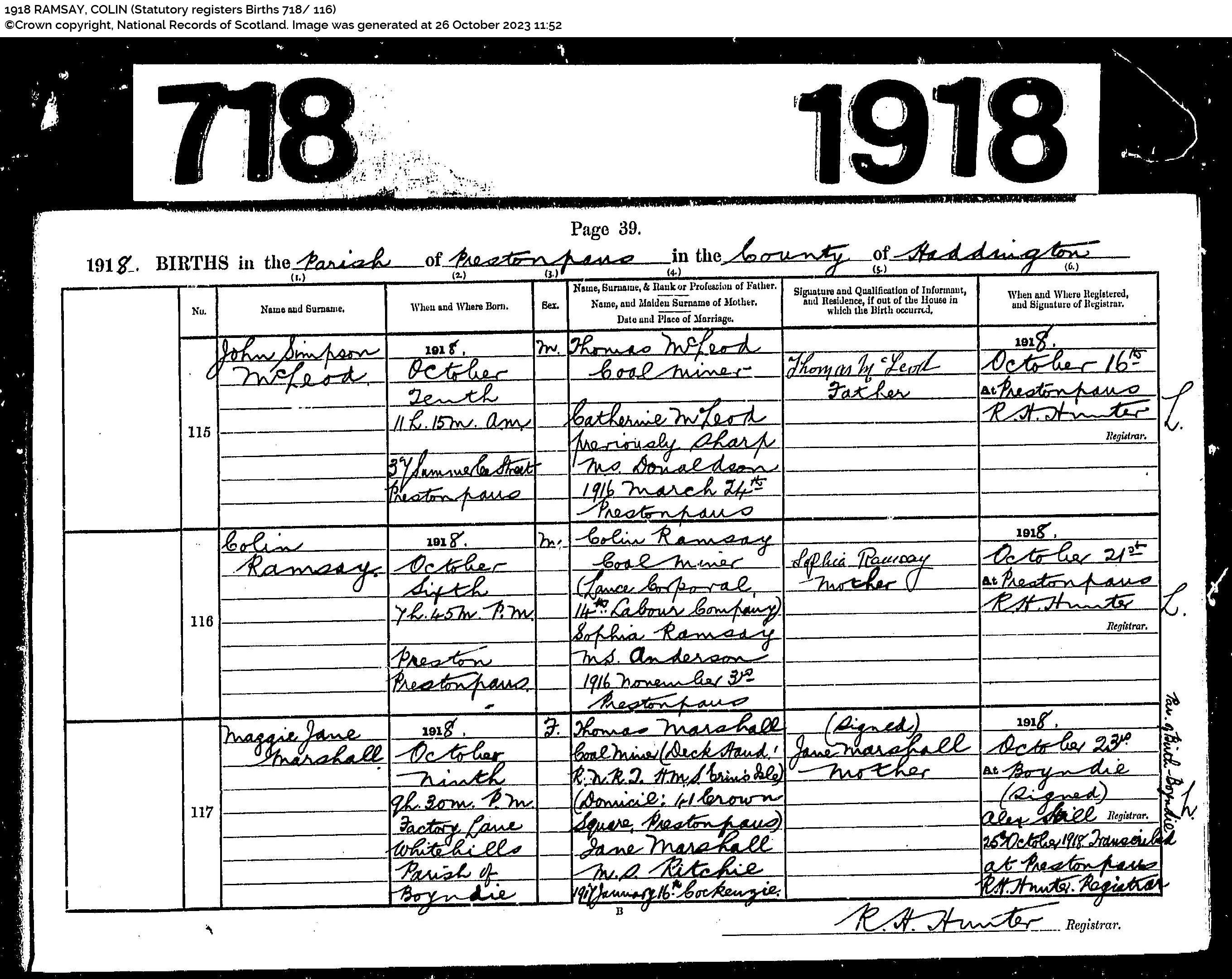 | 323 | SP | STAT | DEA | 1969 | R293.jpg | 1969-07-06 DEA Colin Ramsay son of Colin Ramsay + Mary Hunter Ross – Musselburgh [[R293]] | LOCAL | ONLINE |
