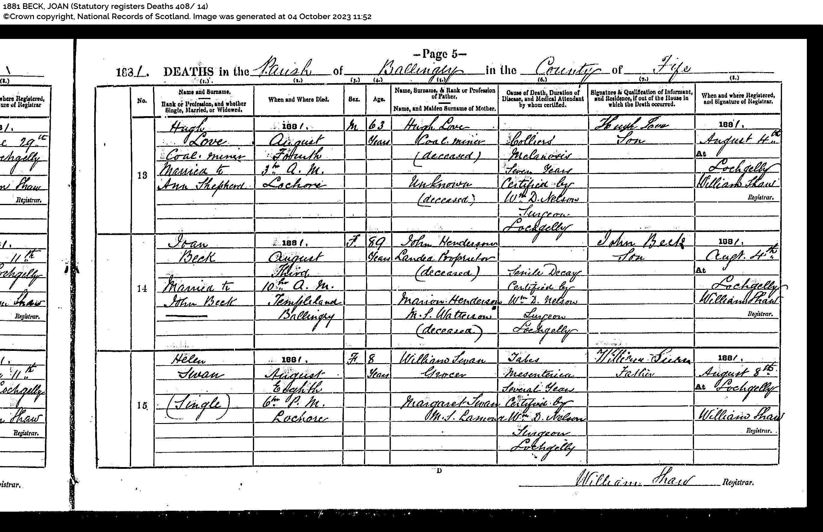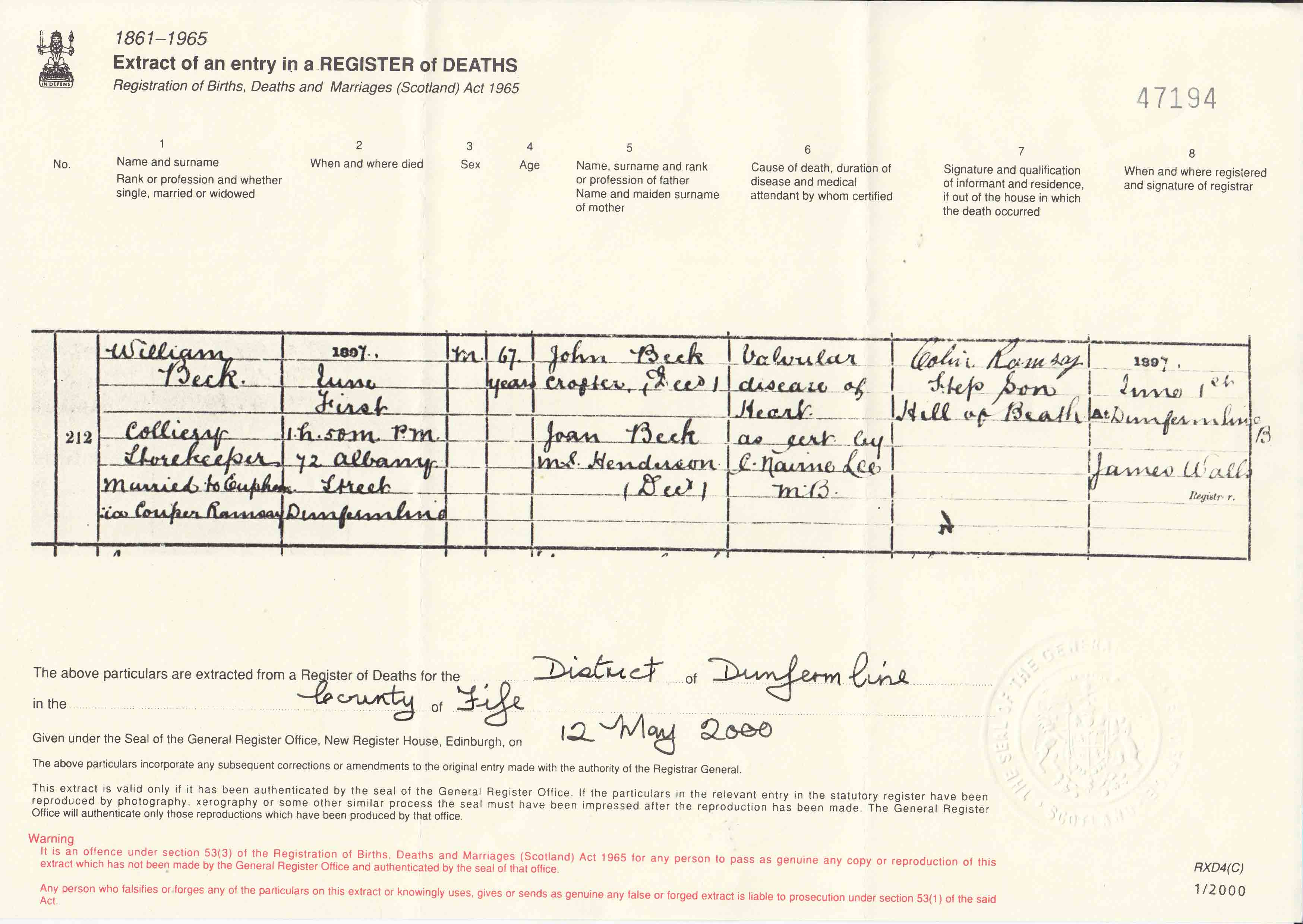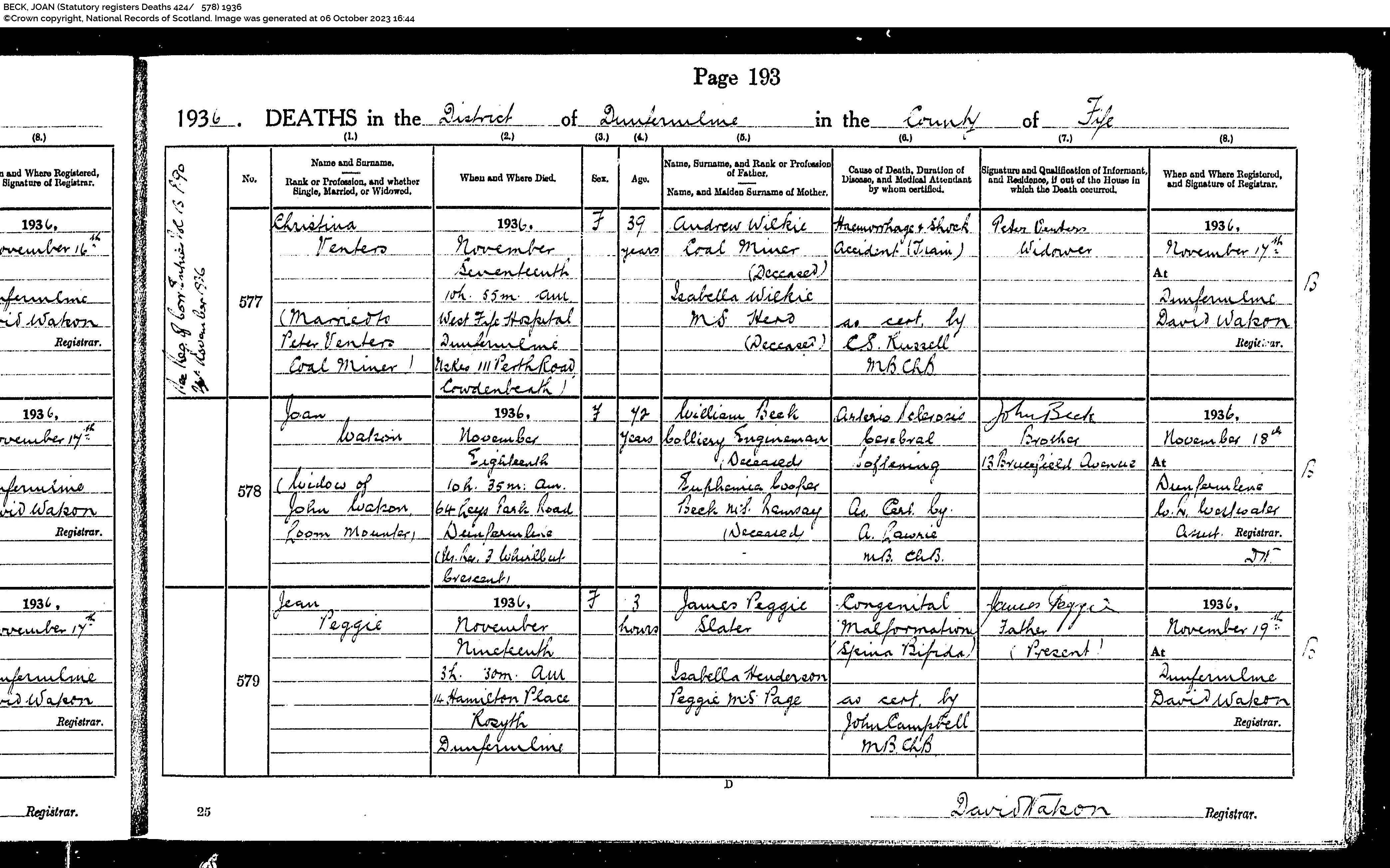 | 147 | SP | STAT | DEA | 1955 | R136.jpg | 1955-12-21 DEA John Beck husband of Elona Curley – Dunfermline [[R136]] | LOCAL | ONLINE |
