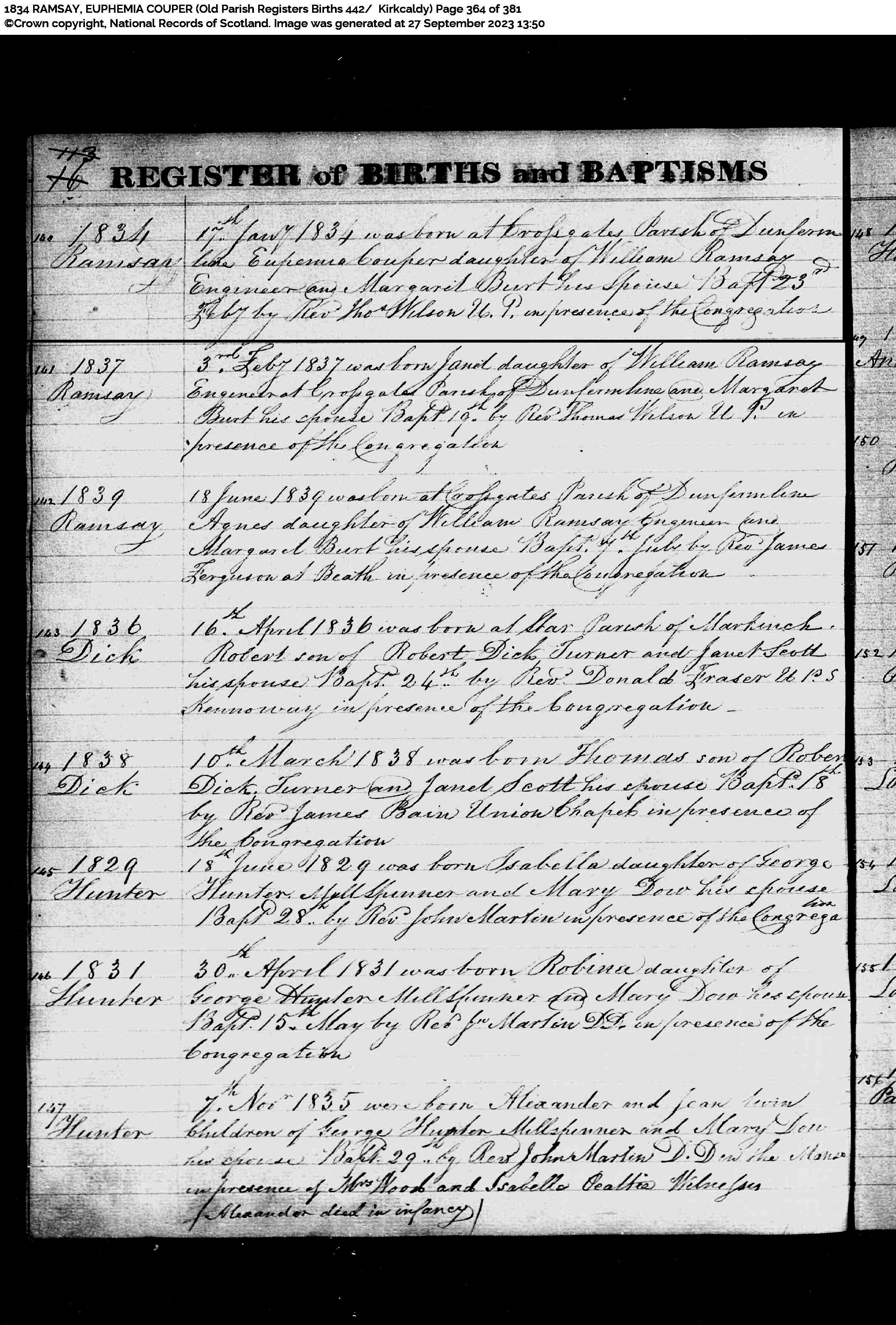 | 23 | SP | CH | BIR BAP | 1834 | R022a.jpg | 1834-01-17 BIR BAP Euphemia Ramsay, dau of William Ramsay + Margaret Burt [[R022a]] | LOCAL | ONLINE |