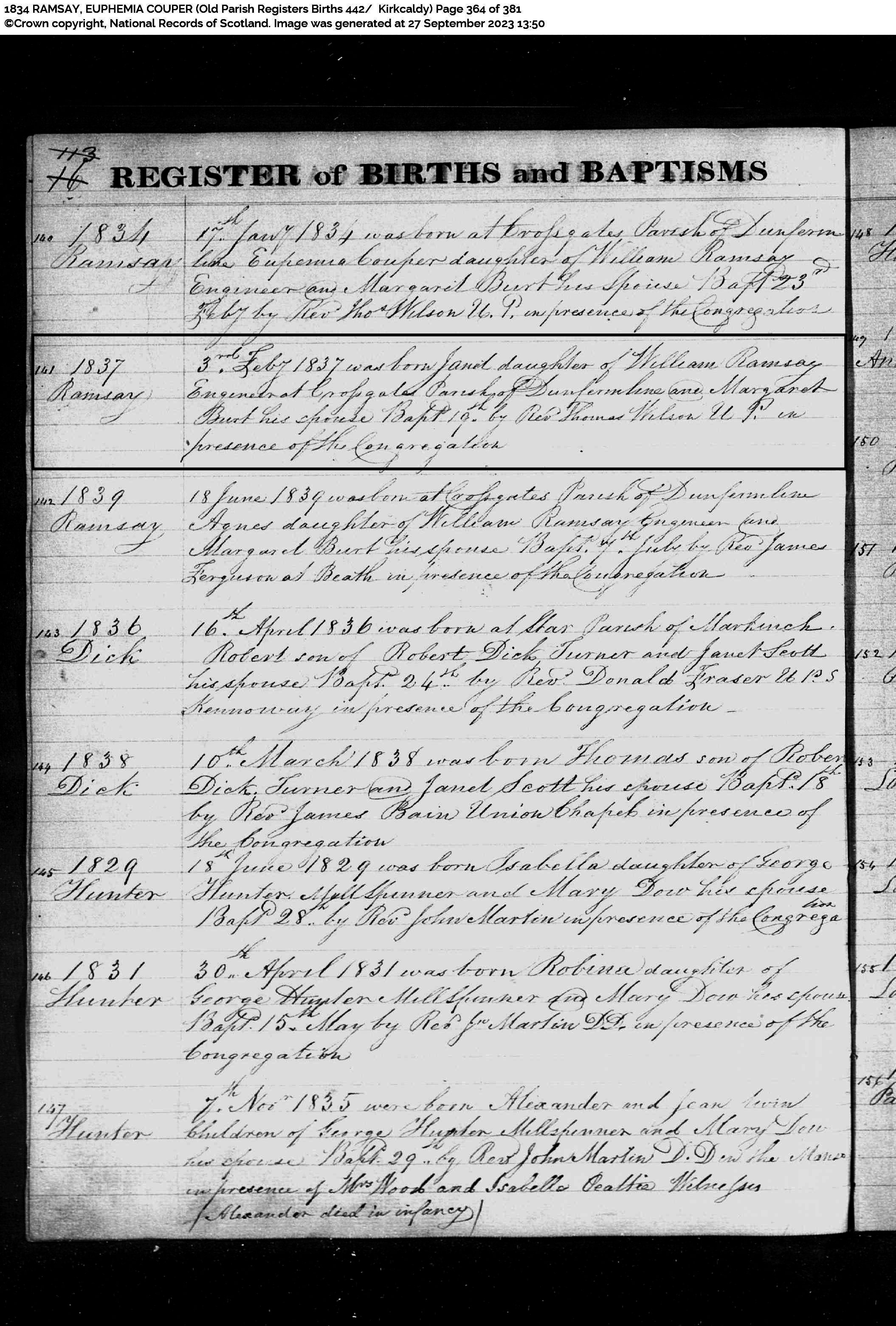 | 24 | SP | CH | BIR BAP | 1837 | R022b.jpg | 1837-02-03 BIR BAP Janet Ramsay, dau of William Ramsay + Margaret Burt [[R022b]] | LOCAL | ONLINE |