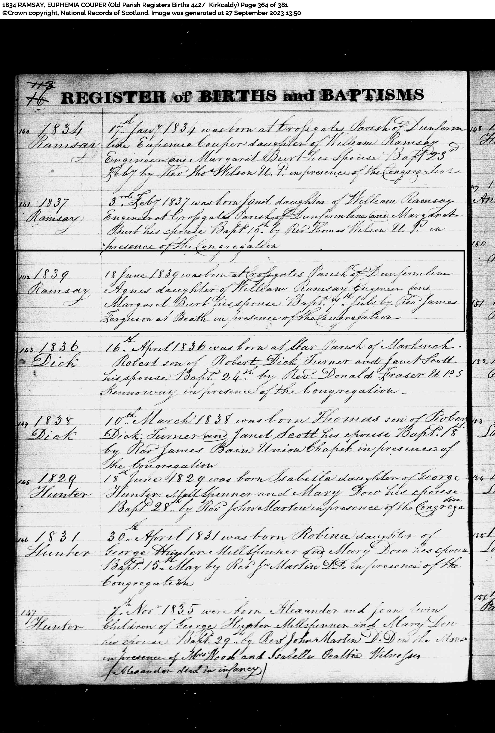 | 25 | SP | CH | BIR BAP | 1839 | R022c.jpg | 1839-06-18 BIR Agnes Ramsay, dau of William Ramsay + Margaret Burt [[R022c]] | LOCAL | ONLINE |