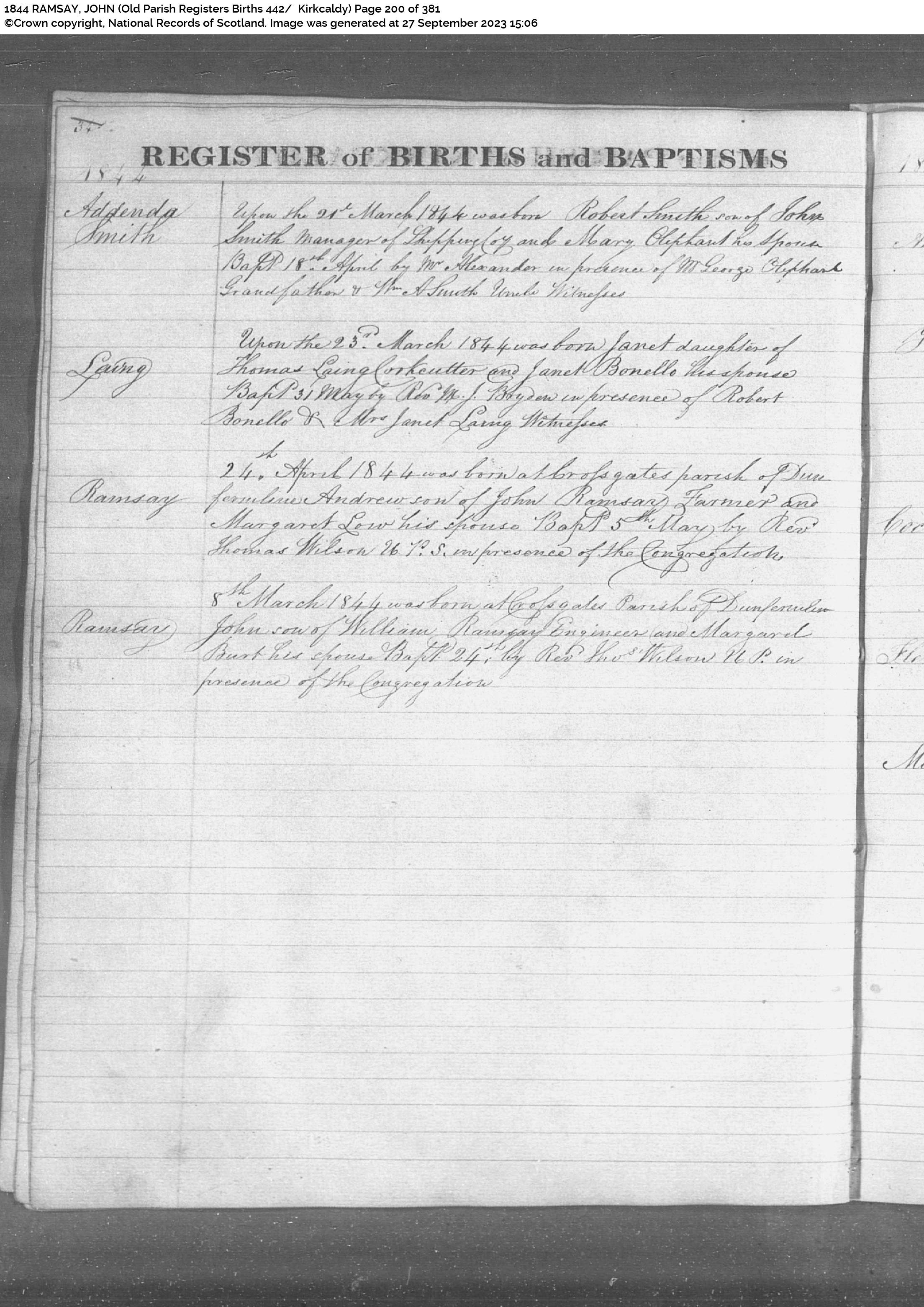 | 26 | SP | CH | BIR BAP | 1844 | R023.jpg | 1844-03-08 BIR BAP John Ramsay, son of William Ramsay + Margaret Burt [[R023]] | LOCAL | ONLINE |