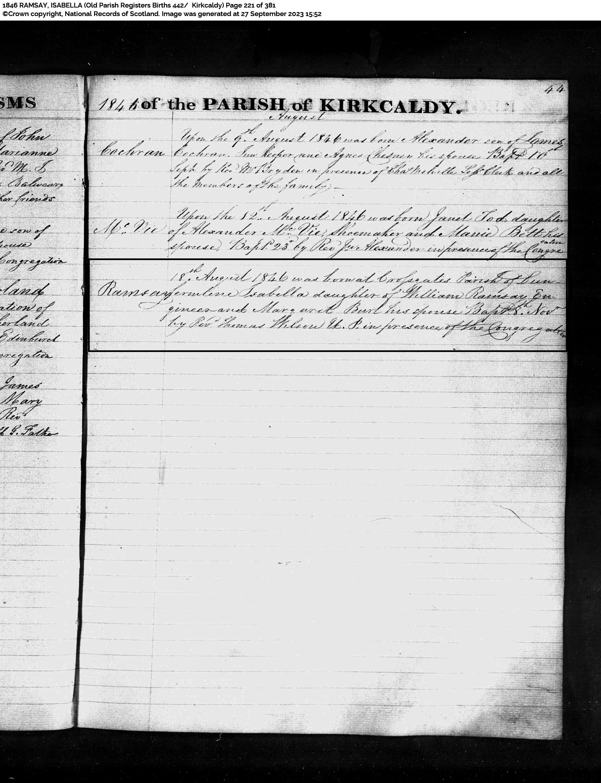 | 18 | FS | ISR | BIR | 1846 | R017.jpg | 1846-08-18 BIR Isabella Ramsay Family Search Internet search result | LOCAL | n/a |