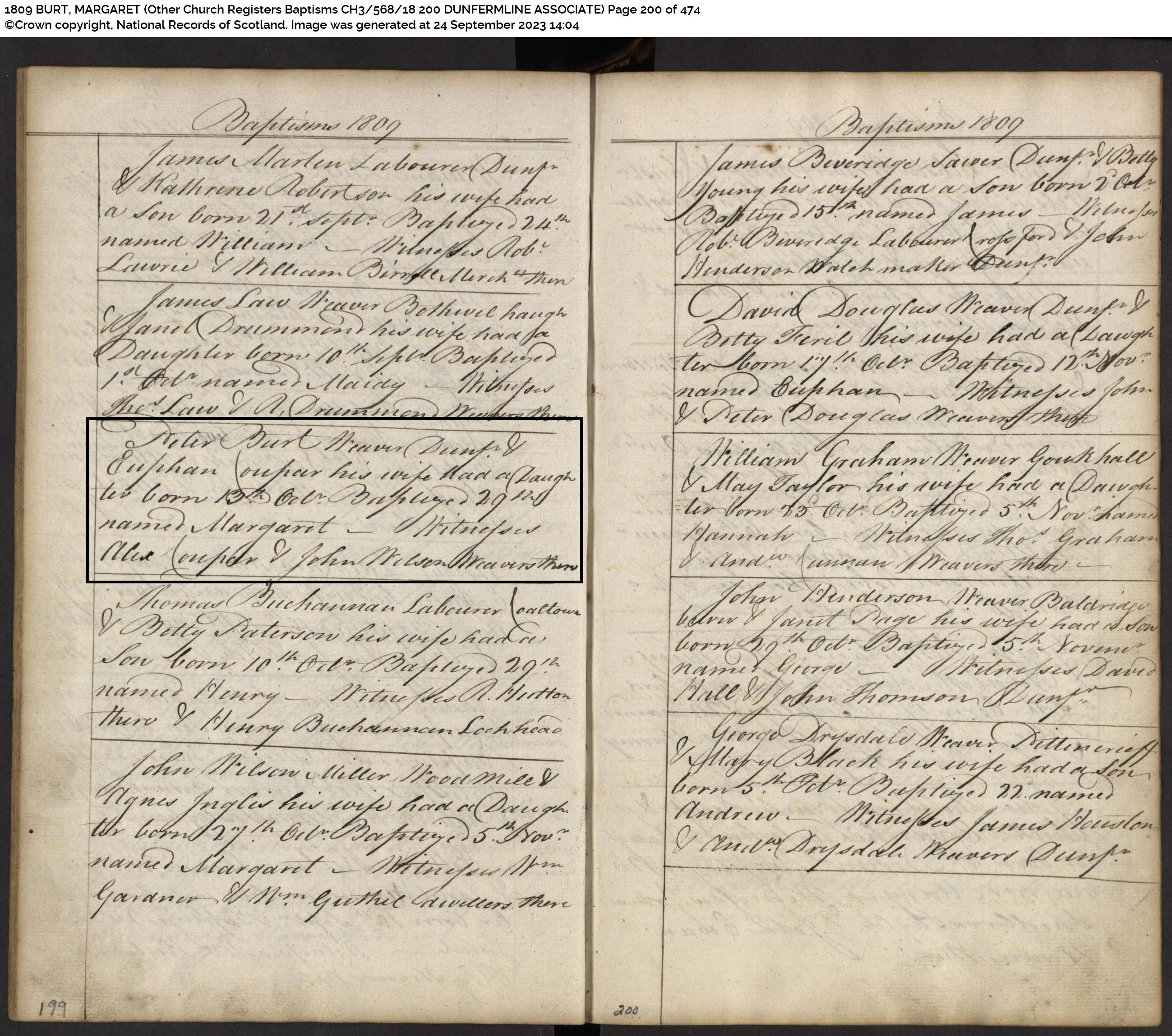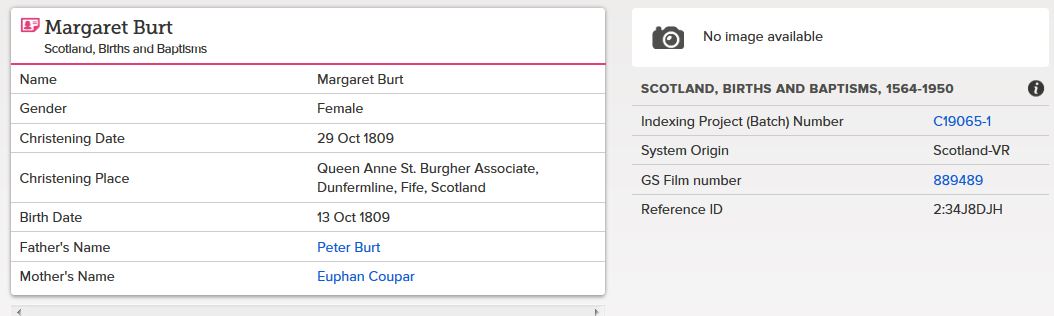 | 38 | SP | CH | BIR BAP | 1809 | R035.jpg | 1809-10-29 BIR BAP Margaret Burt – dau of Peter Burt + Euphan Couper [[R077]] | LOCAL | ONLINE |