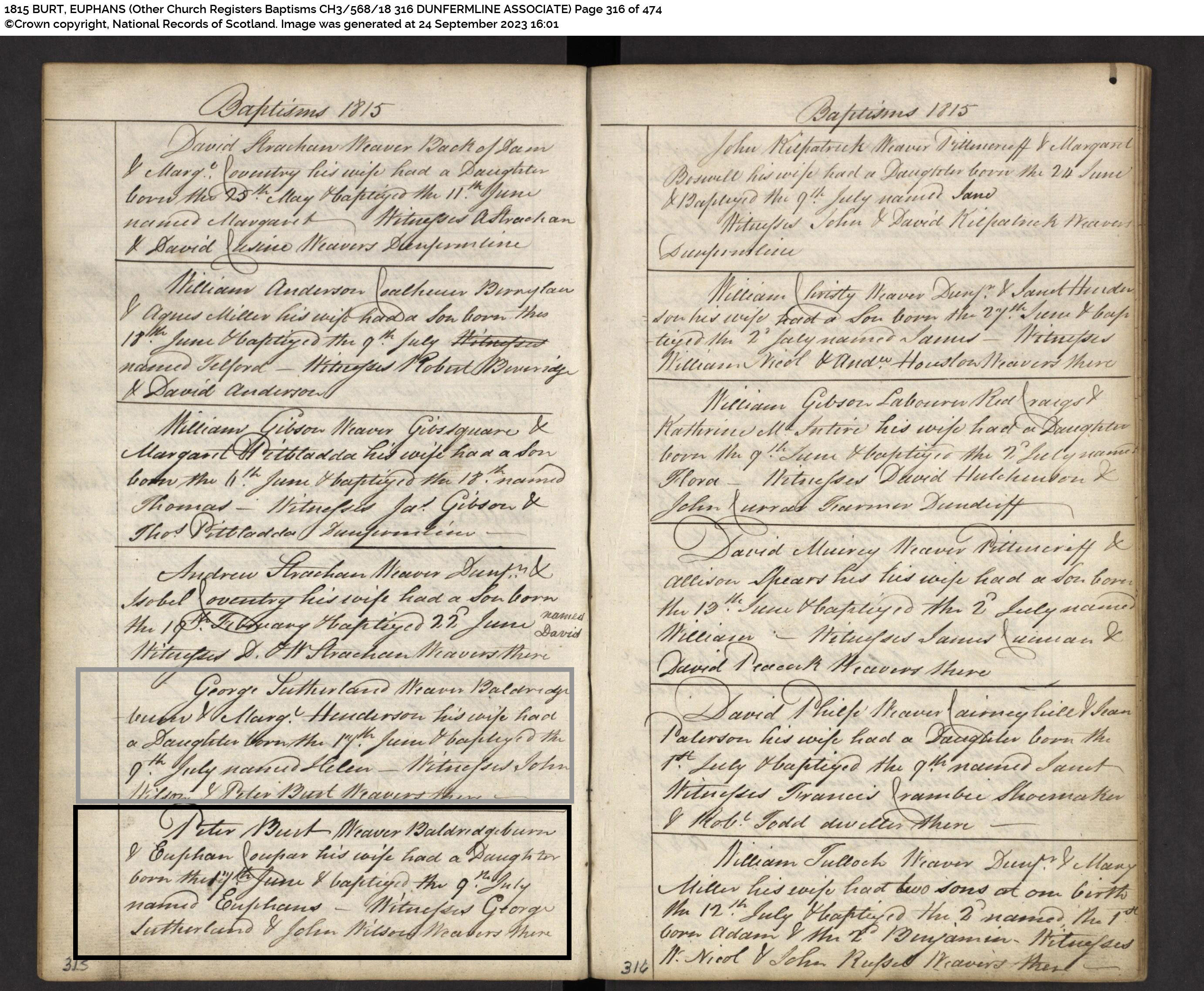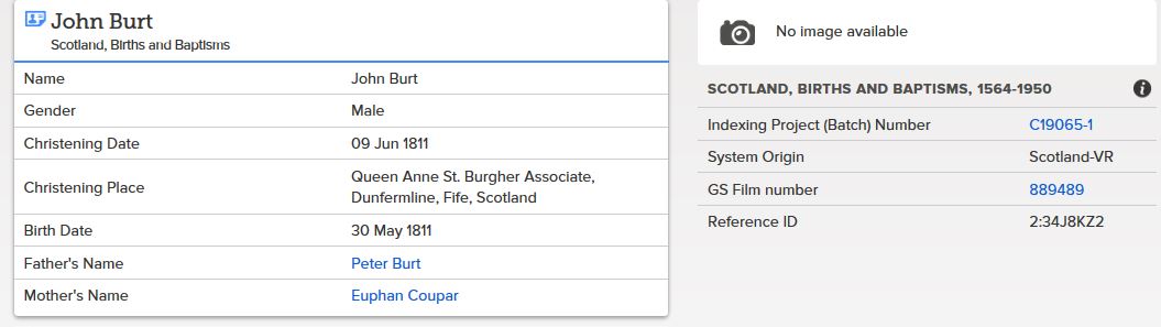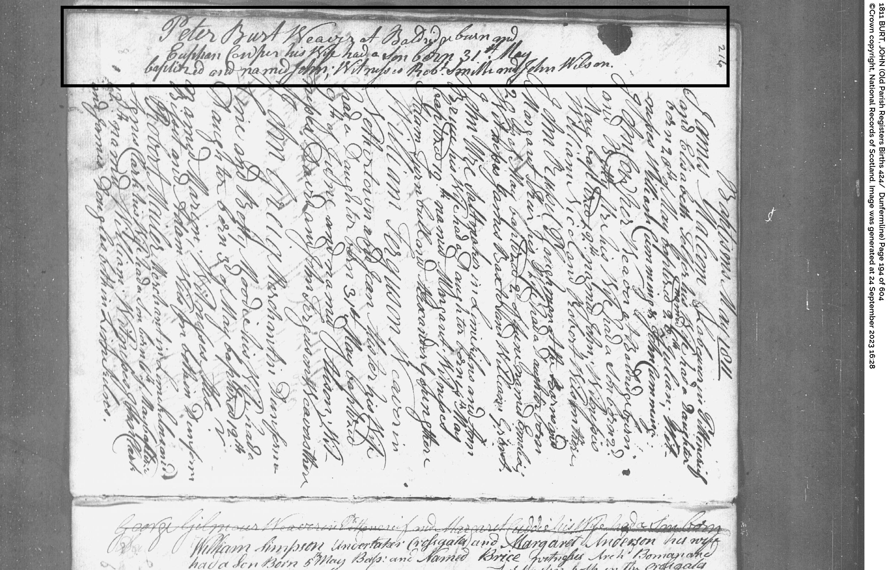 | 83 | SP | CH | BIR BAP | 1811 | R075.jpg | 1811-05-30 BIR BAP John Burt – son of Peter Burt + Euphan Couper [[R075]] | LOCAL | ONLINE |