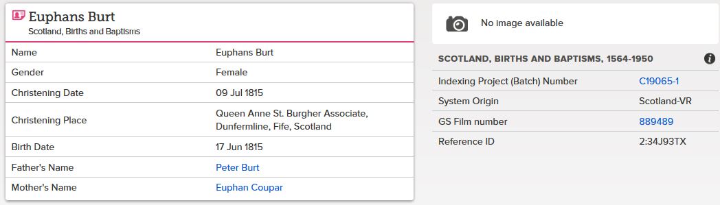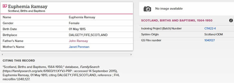 | 40 | FS | FS | ISR | 1815 | R038.jpg | 1815-05-01 BIR Euphemia Ramsay – dau of John Ramsay + Janet Penman Family Search Internet search result | LOCAL | n/a |
