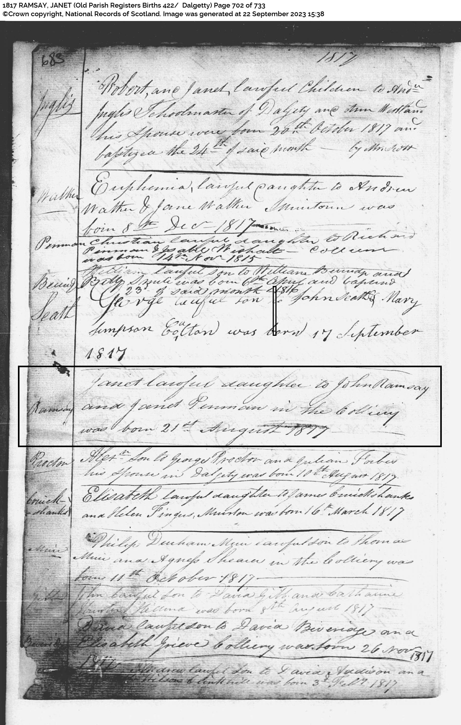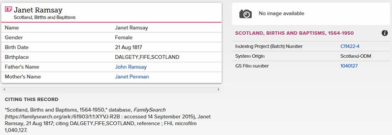 | 41 | FS | FS | ISR | 1817 | R039.jpg | 1817-08-21 BIR Janet Ramsay – dau of John Ramsay + Janet Penman Family Search Internet search result | LOCAL | n/a |