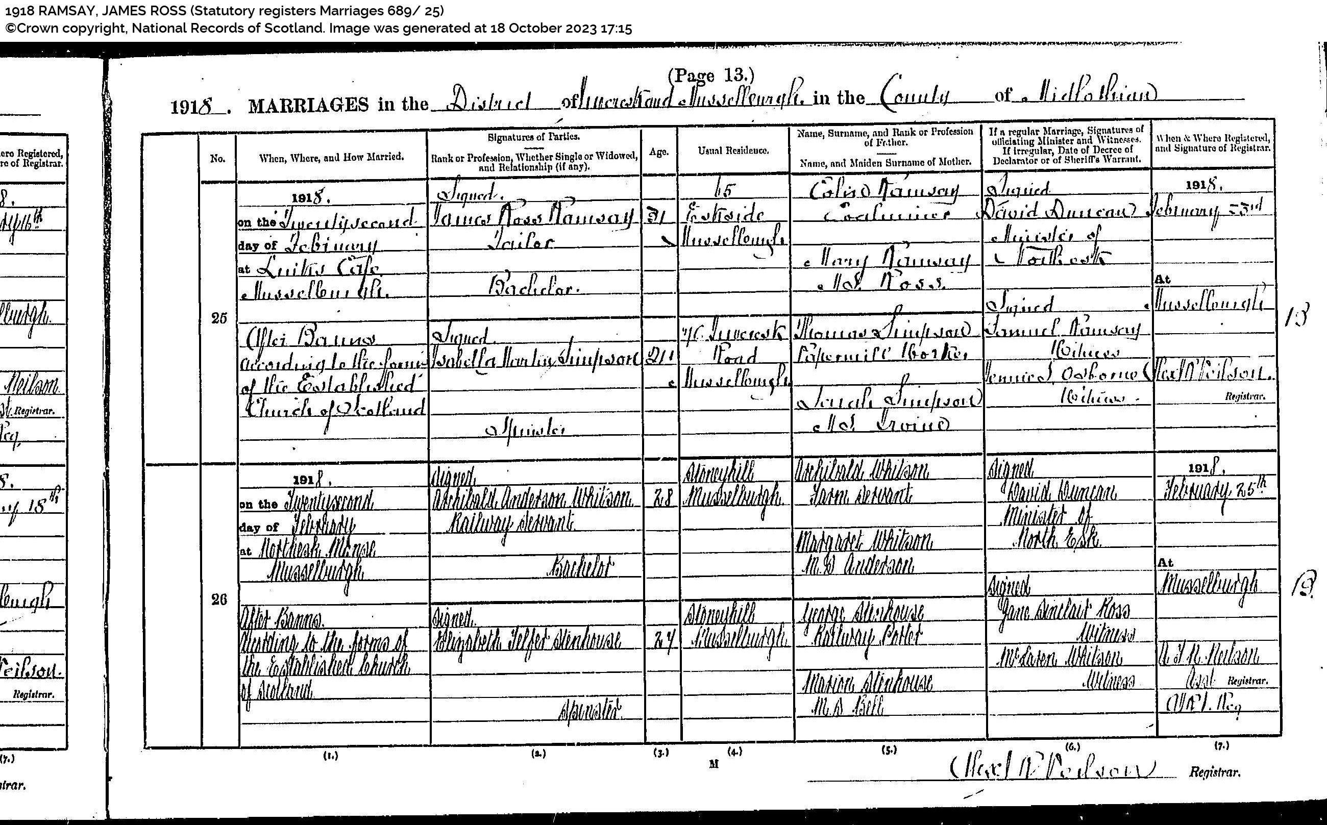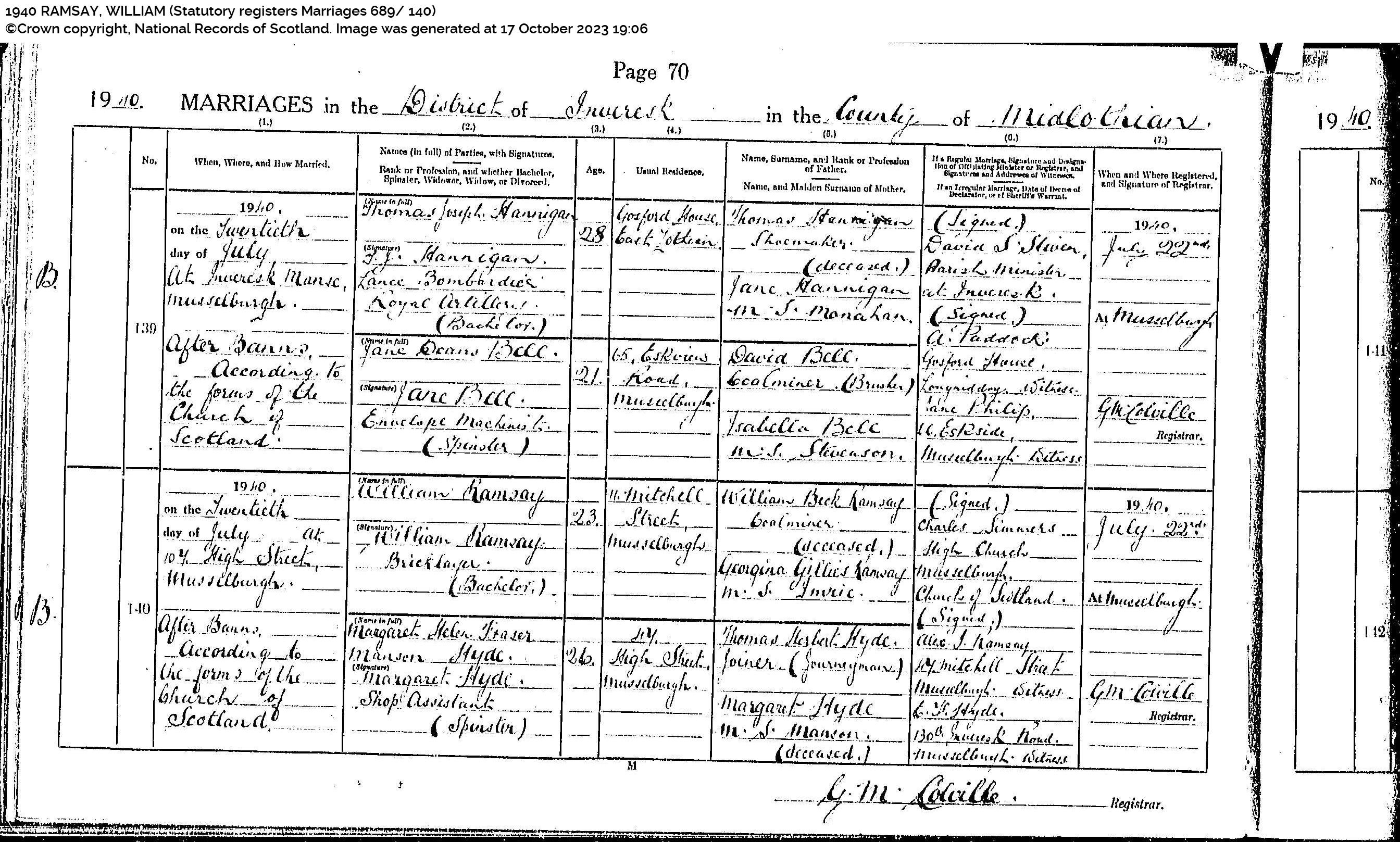 | 345 | SP | STAT | MAR | 1940 | R313.jpg | 1940-07-20 MAR William Ramsay + Margaret Helen Fraser Manson Hyde – Musselburgh [[R313]] | LOCAL | ONLINE |