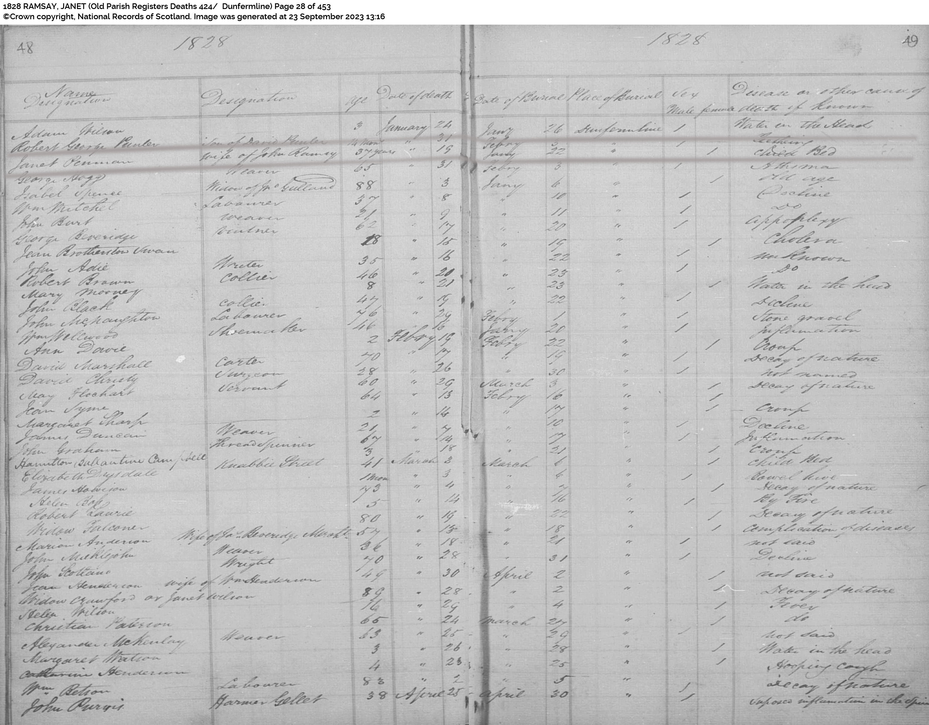 | 49 | SP | CH | DEA | 1828 | R047.jpg | 1828-01-19 DEA Janet Penman wife of John Ramsay [[R047]] | LOCAL | ONLINE |
