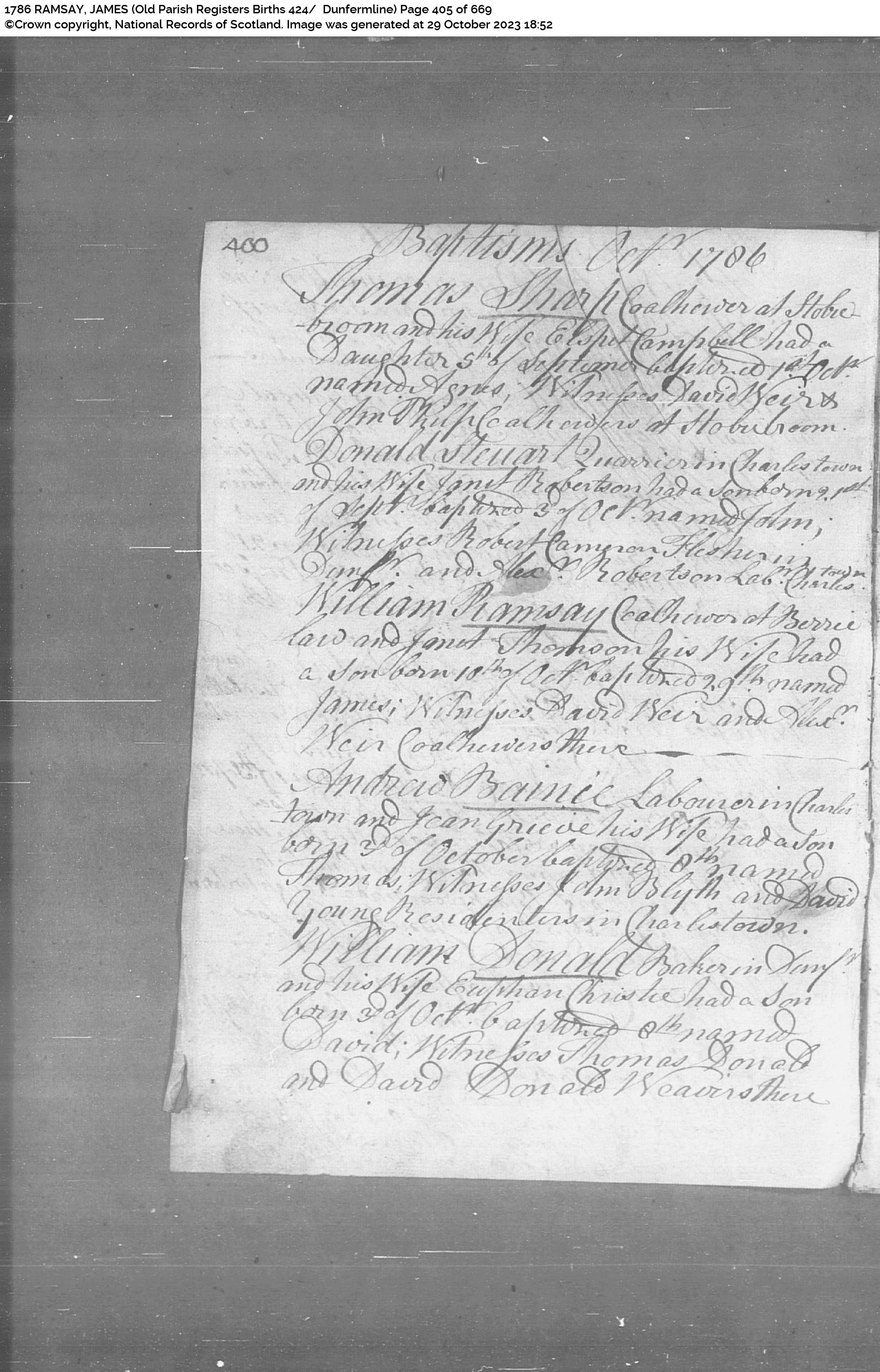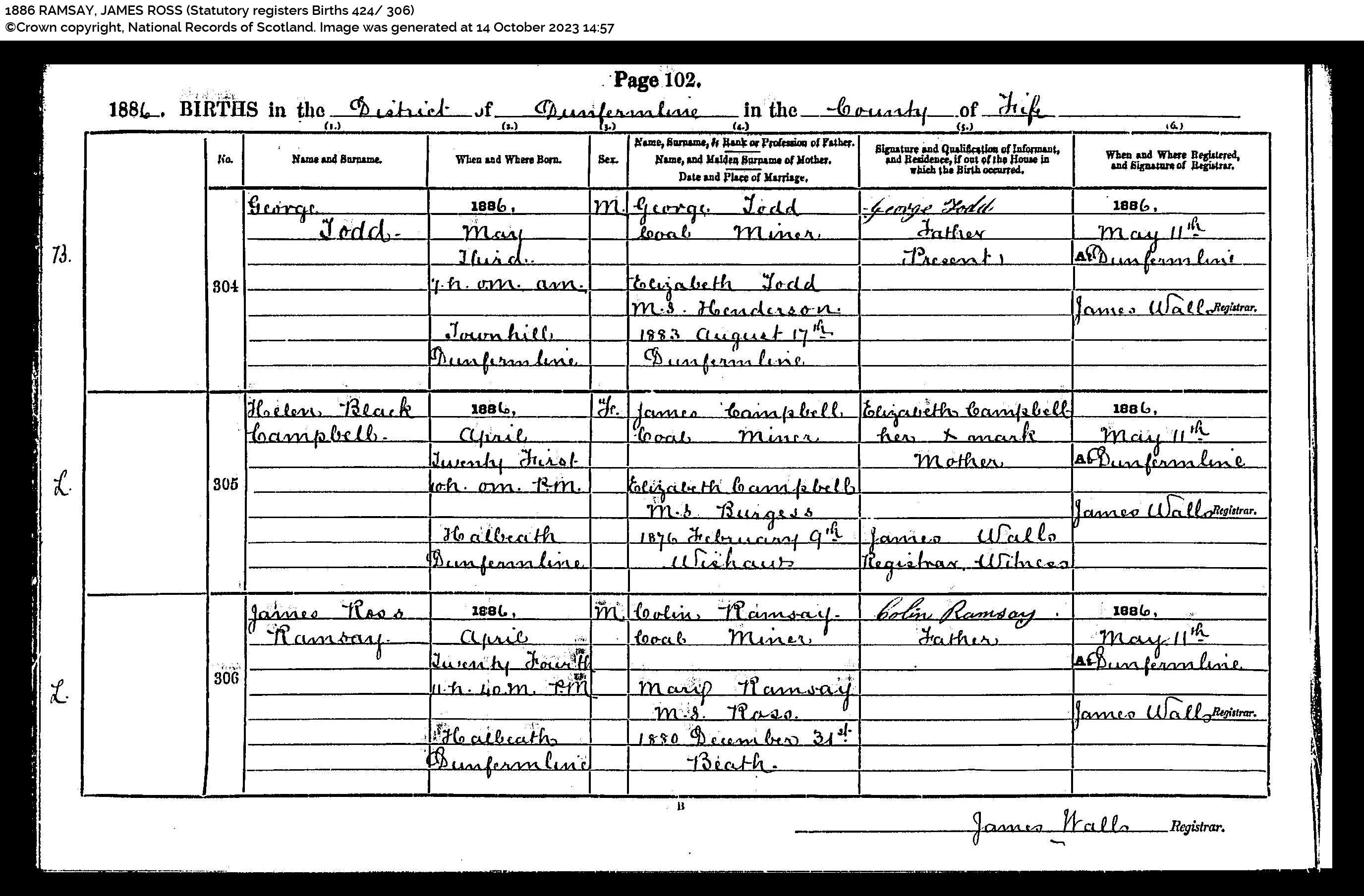| 53 | SP | CH | BIR BAP | 1786 | R051.jpg | 1786-10-18 BIR BAP James Ramsay child of William Ramsay + Janet Thomson – Dunfermline Parish [[R051]] | LOCAL | ONLINE |