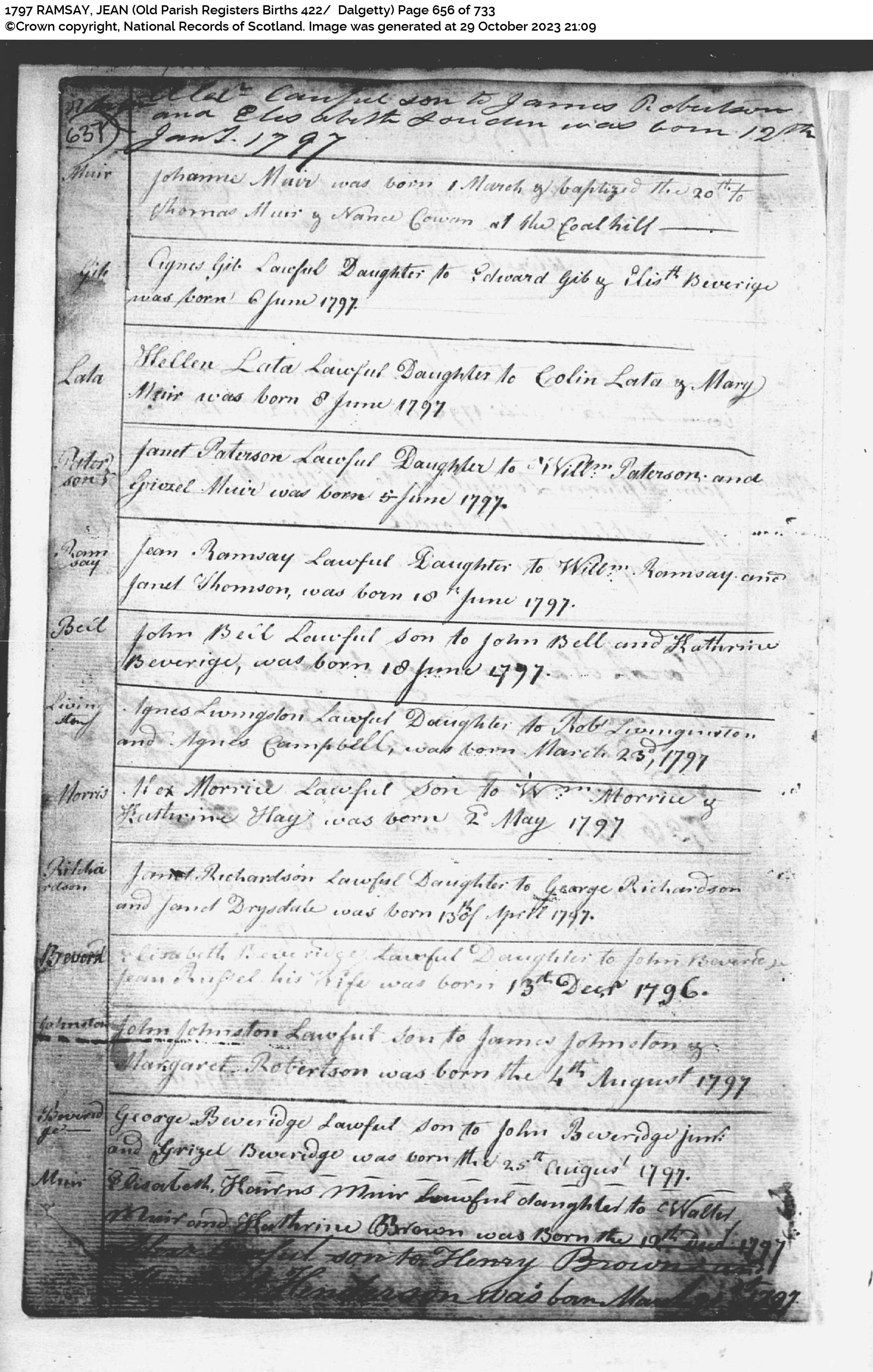 | 57 | SP | CH | BIR | 1797 | R055.jpg | 1797-06-10 BIR Jean Ramsay child of William Ramsay + Janet Thomson – Dalgetty Parish [[R055] | LOCAL | ONLINE |