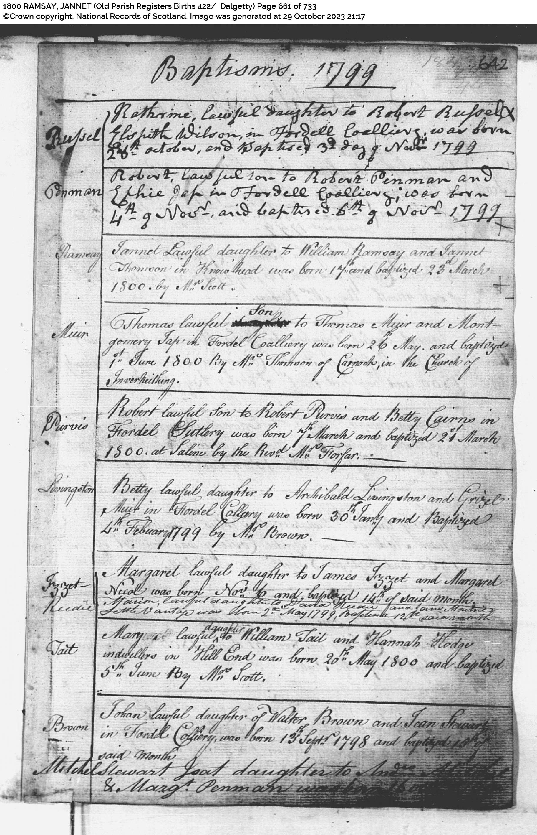 | 58 | SP | CH | BIR BAP | 1800 | R056.jpg | 1800-03-17 BIR BAP Jannet Ramsay child of William Ramsay + Janet Thomson – Dalgetty Parish [[R056] | LOCAL | ONLINE |