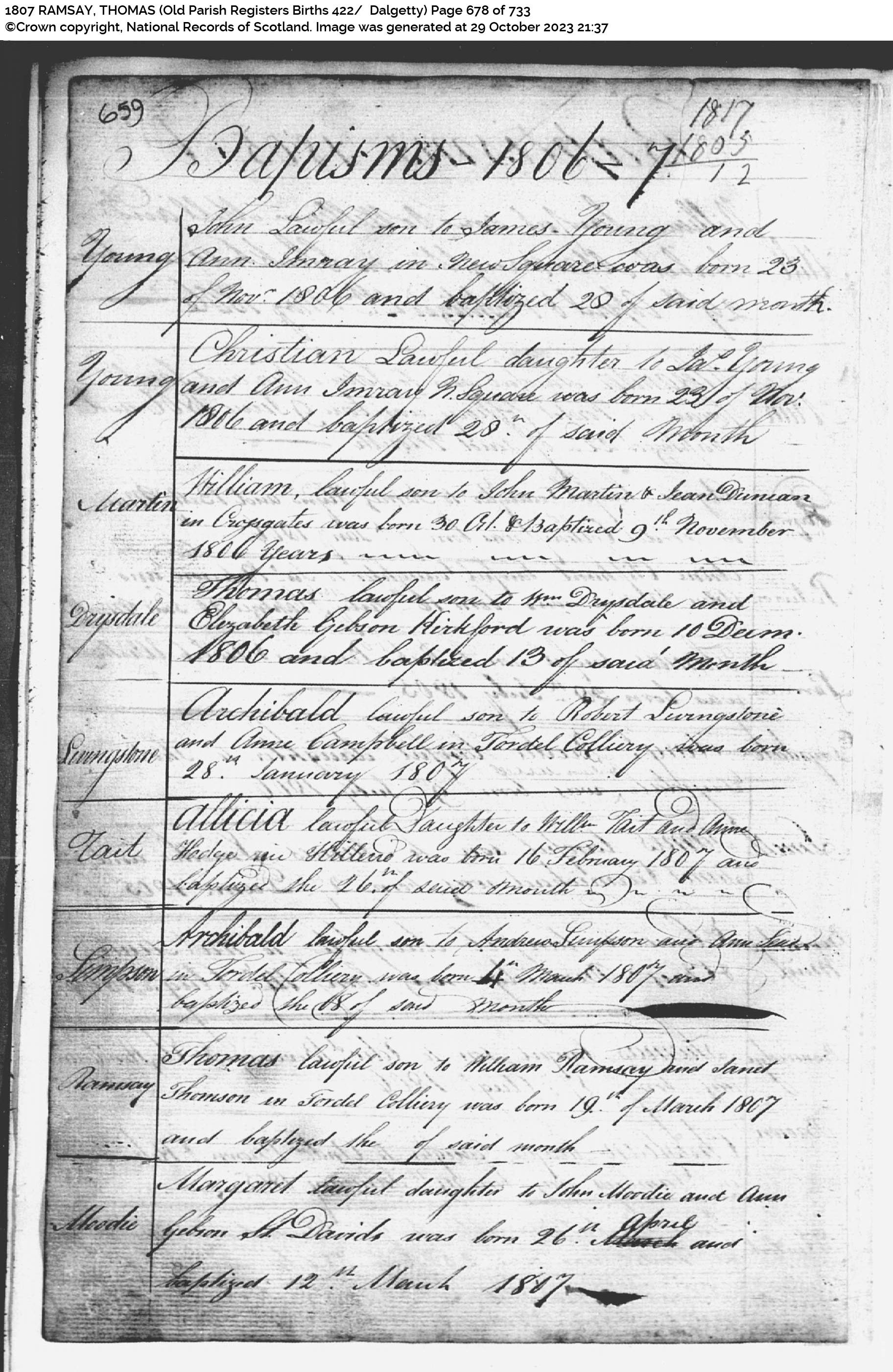 | 59 | SP | CH | BIR BAP | 1803 | R057.jpg | 1803-01-01 BIR BAP Alexander Ramsay child of William Ramsay + Janet Thomson – Dalgetty Parish [[R057] | LOCAL | ONLINE |