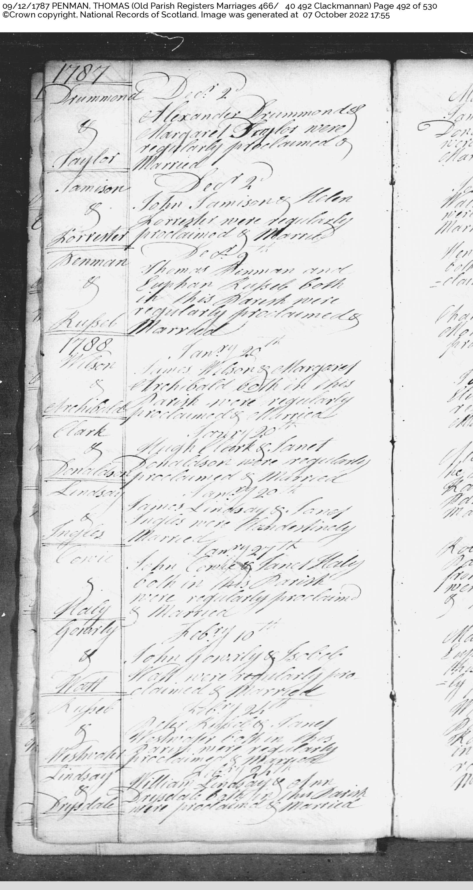 | 61 | SP | CH | MAR | 1787 | R059.jpg | 1787-12-09 MAR Thomas Penman + Euphan Russel, Clackmannan [[R059]] | LOCAL | ONLINE |