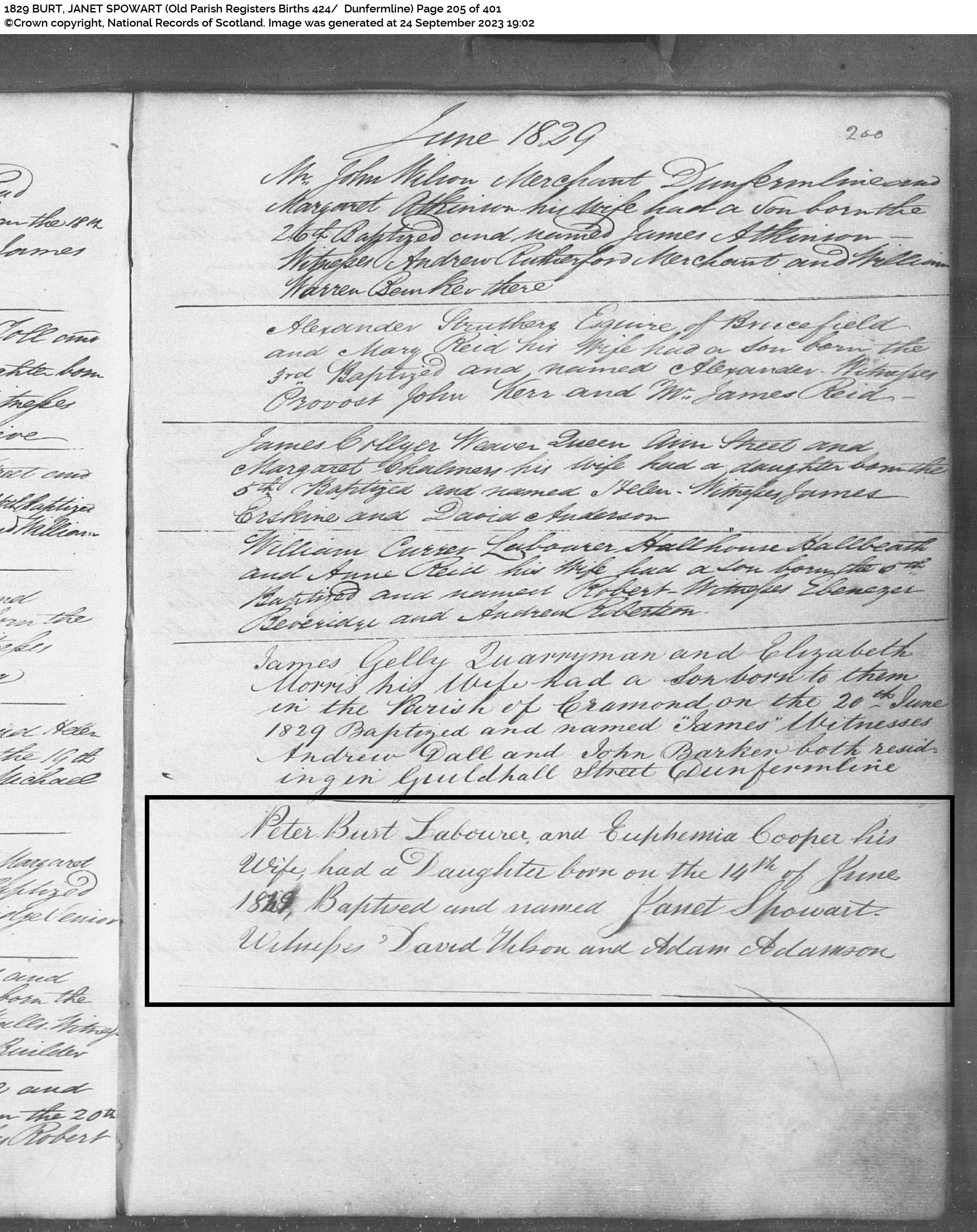 | 71 | SP | CH | BIR BAP | 1829 | R069.jpg | 1829-06-14 BIR BAP Janet Spowart Burt – dau of Peter Burt + Euphemia Cooper [[R069]] | LOCAL | ONLINE |