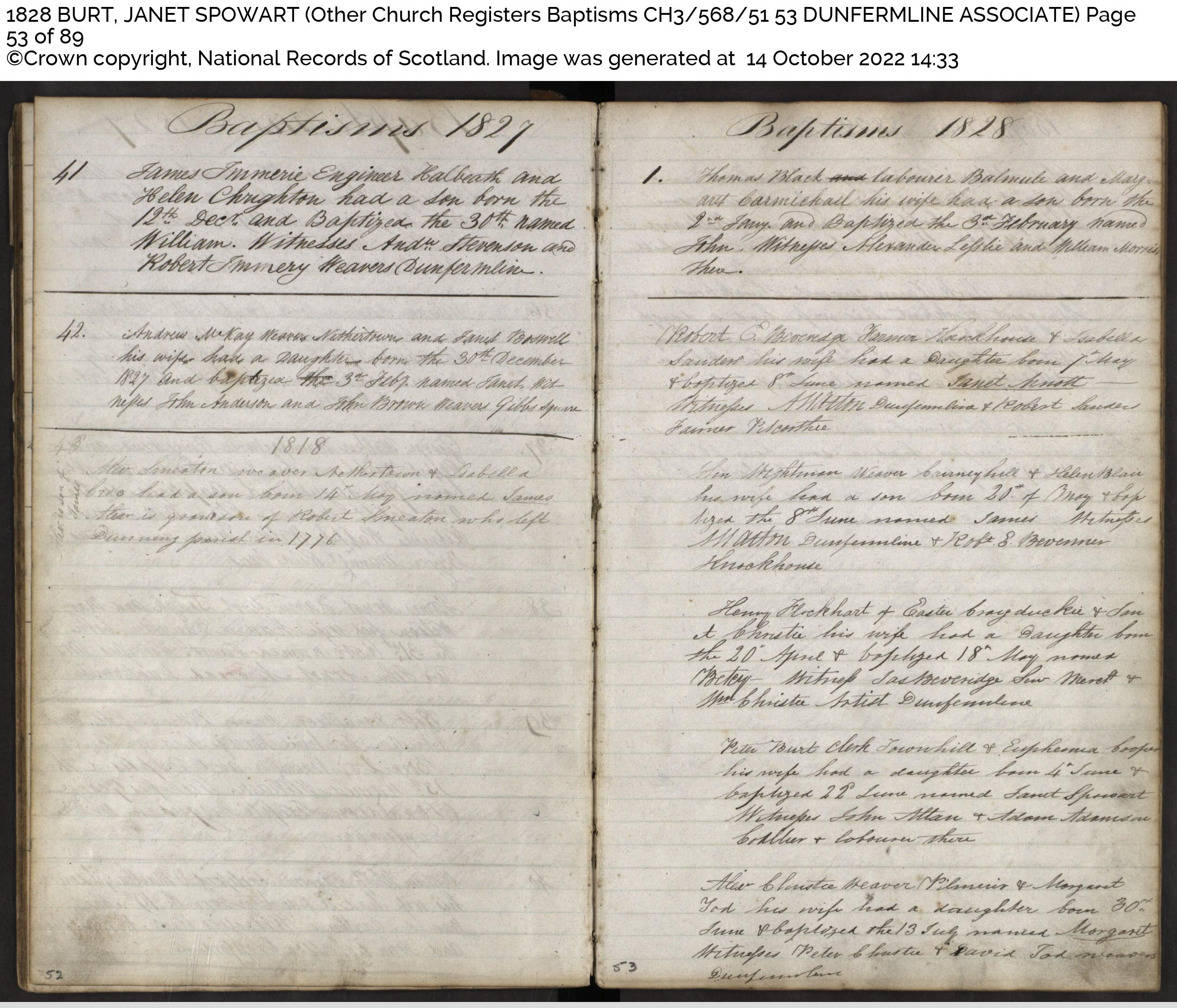 | 82 | SP | CH | BIR BAP | 1828 | R074.jpg | 1829-06-14 BIR BAP Janet Spowart Burt – dau of Peter Burt + Euphemia Cooper (not ours despite name) [[R074]] | LOCAL | ONLINE |