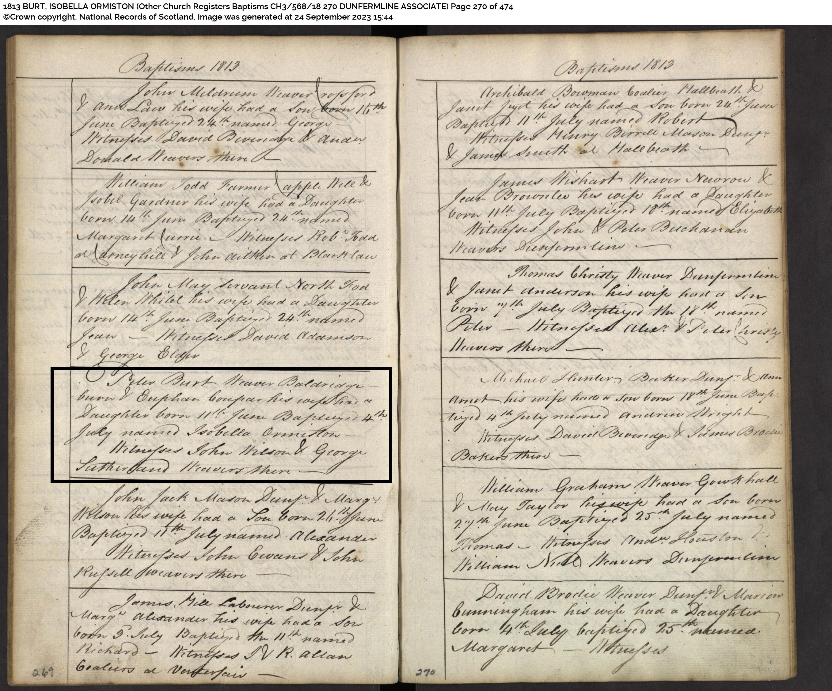 | 85 | SP | CH | BIR BAP | 1813 | R076a.jpg | 1813-06-11 BIR-BAP Isabella Ormiston Burt – dau of Peter Burt + Euphan Couper [[R076a]] | LOCAL | ONLINE |