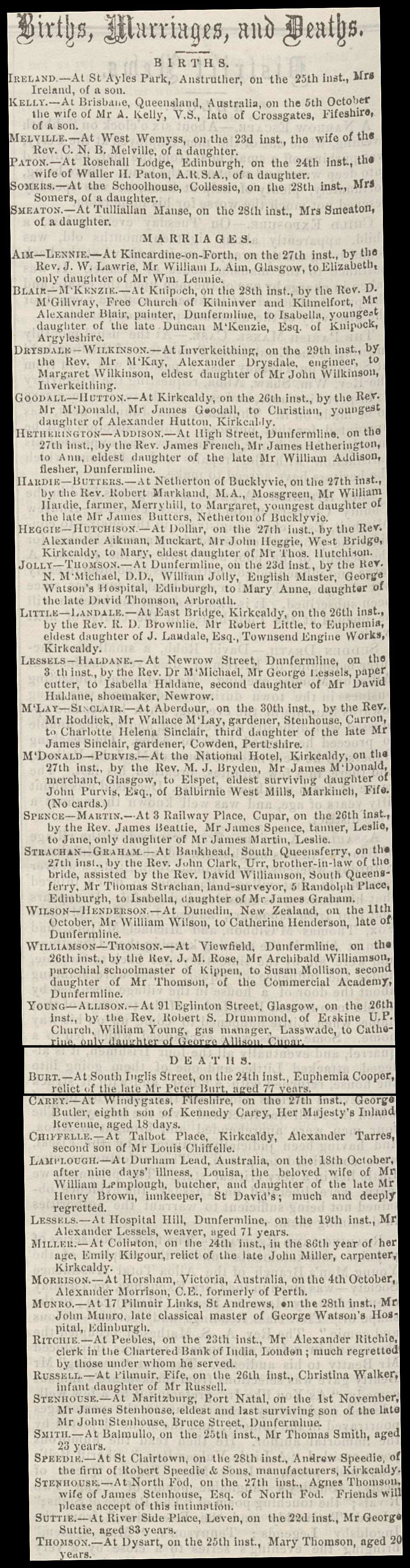 | 77 | SP | STAT | CEN | 1861 | R072-header1.jpg | 1861-04-07 CEN Peter Burt – South Inglis Street, Dunfermline [[R072-header1]] | LOCAL | ONLINE |