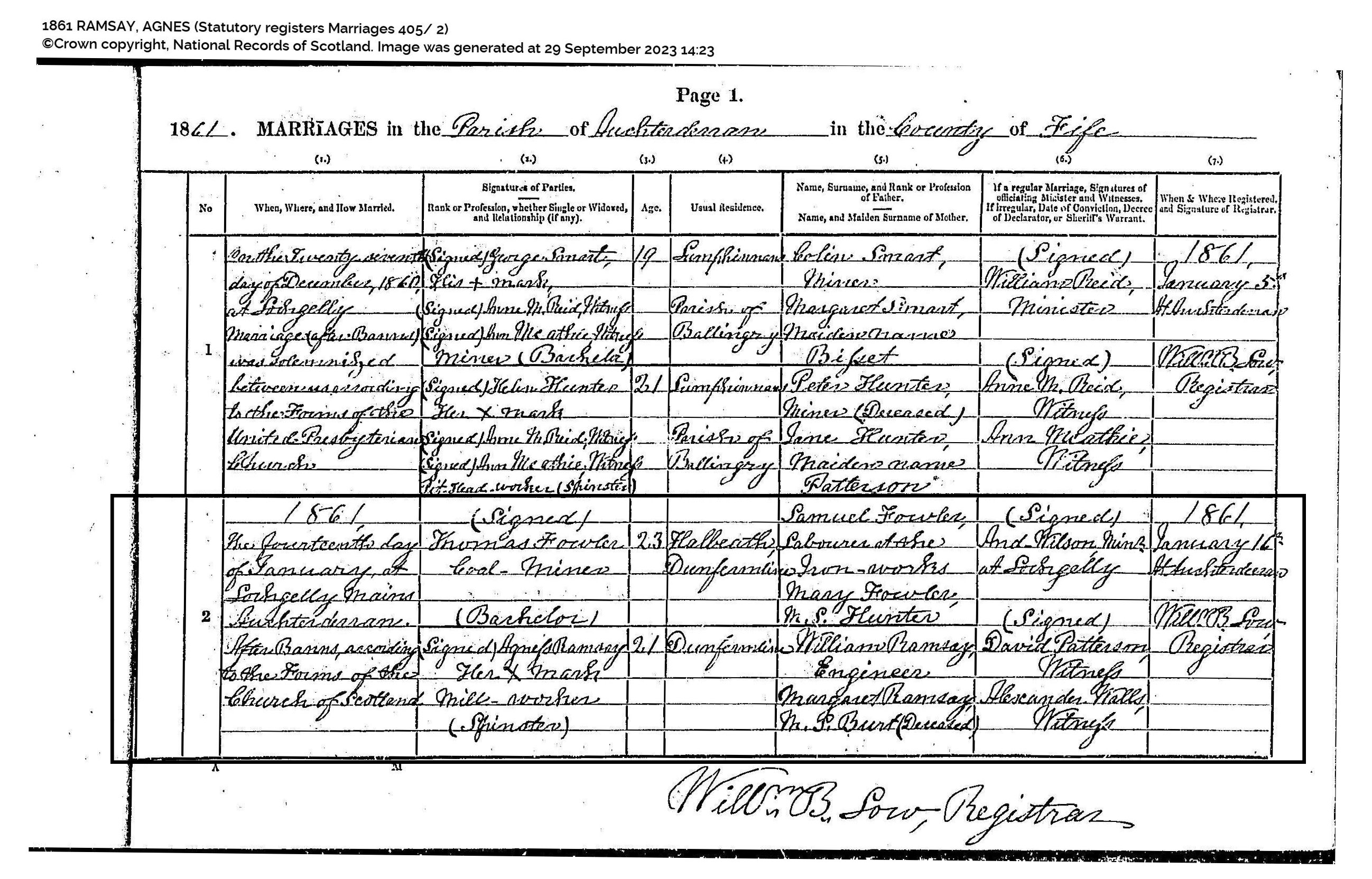 | 90 | SP | STAT | MAR | 1861 | R081.jpg | 1861-01-14 MAR Agnes Ramsay + Thomas Fowler, Auchterderran,Fife,Scotland [[R081]] | LOCAL | ONLINE |