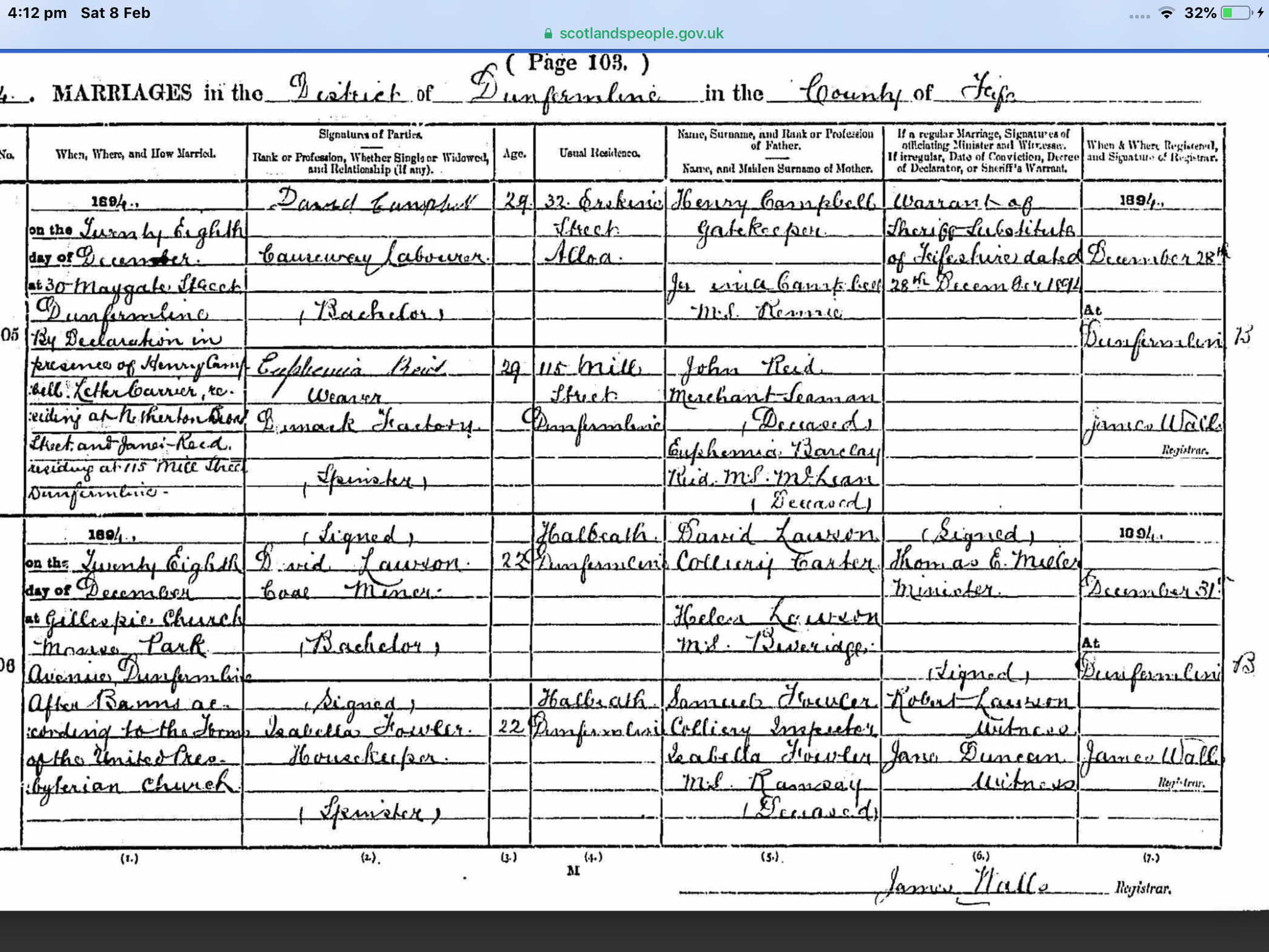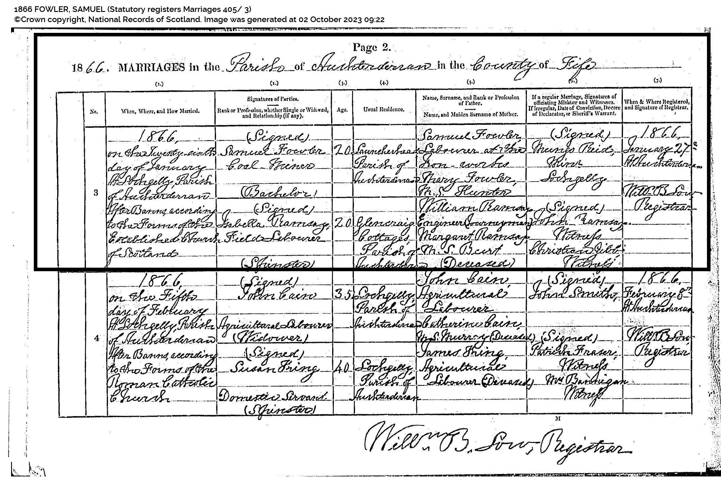 | 64 | FMP | STAT | CEN | 1861 | R062.pdf | 1861-04-07 CEN Samuel Fowler + Mary Hunter , Old Engine House, Auchterderran, Fife, Scotland | LOCAL | n/a |