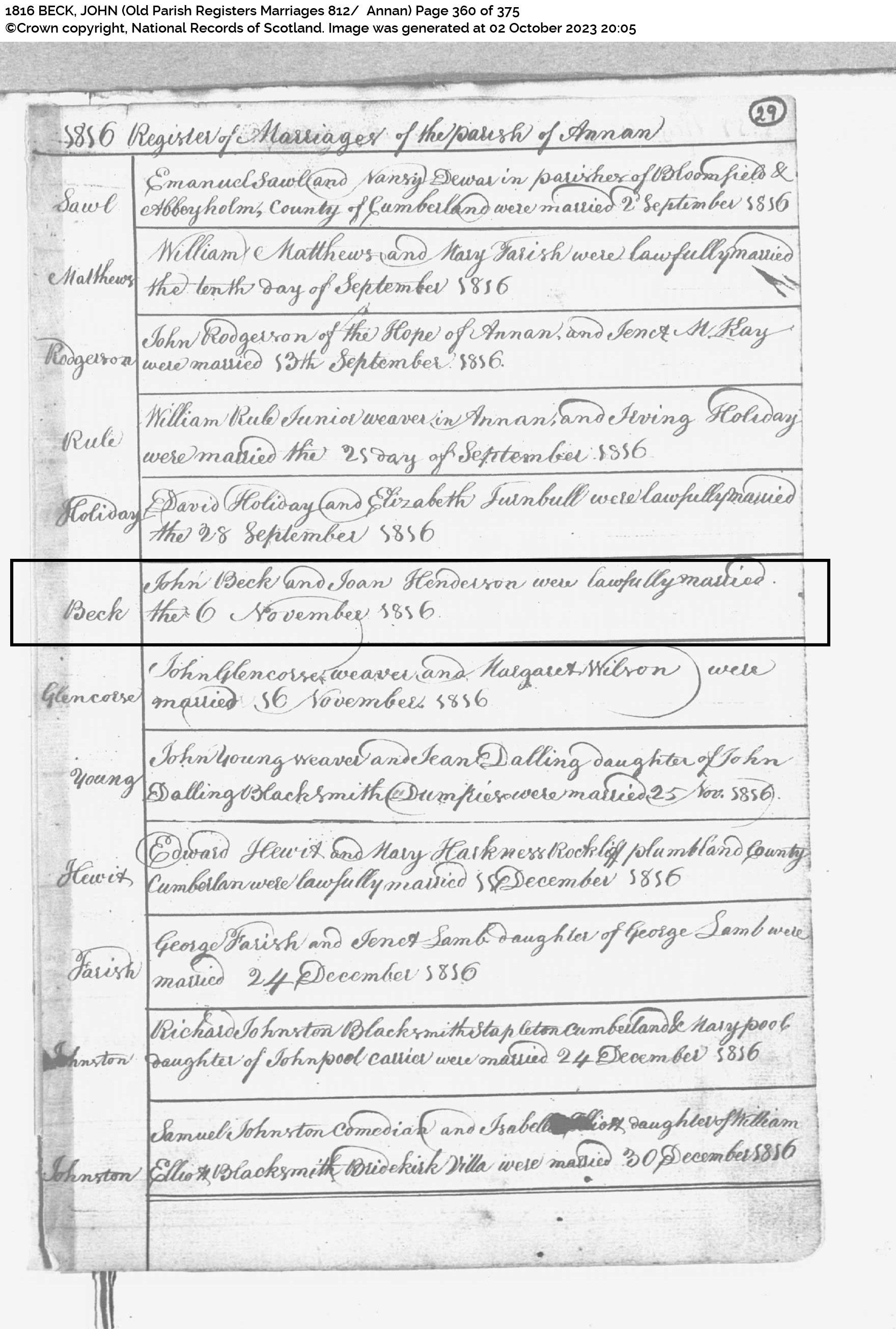 | 92 | SP | CH | MAR | 1816 | R083.jpg | 1816-11-06 MAR John Beck + Joan Henderson, Annan [[R083]] | LOCAL | ONLINE |
