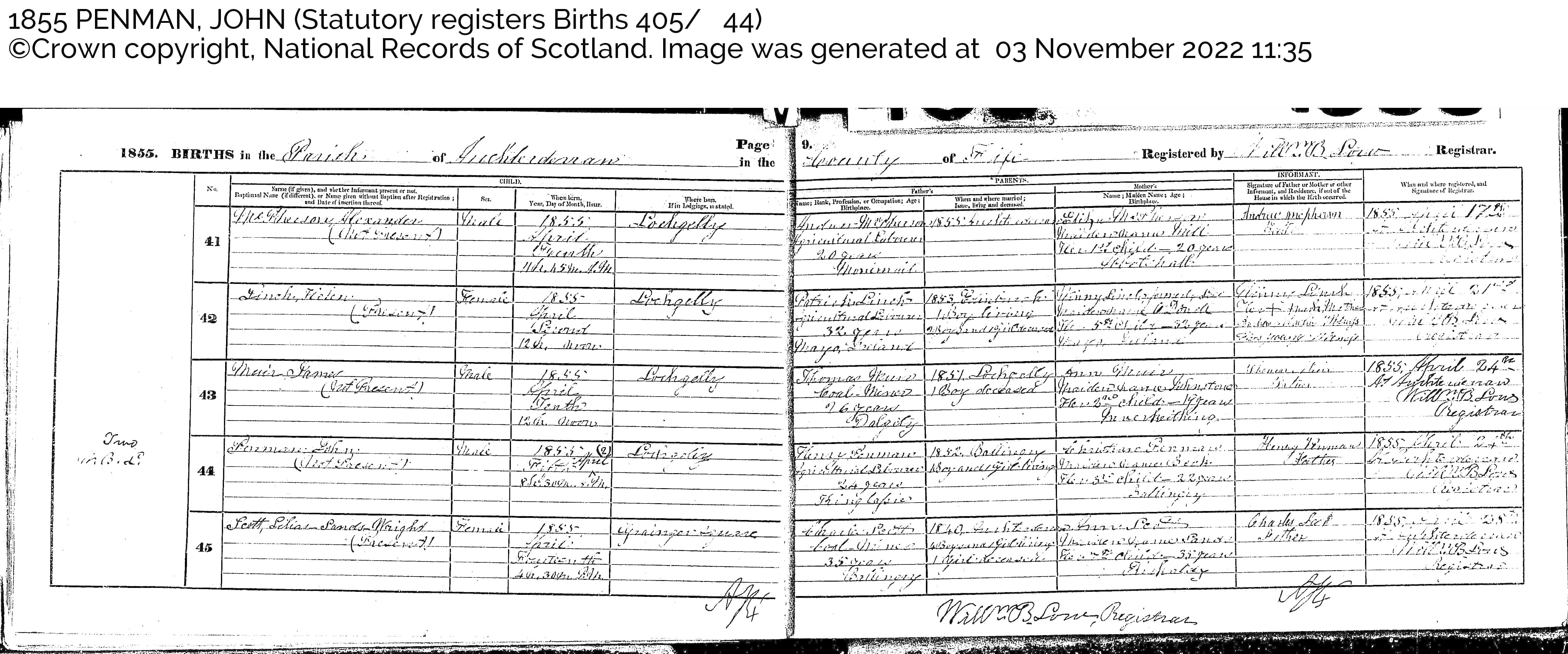 | 93 | SP | STAT | BIR | 1855 | R084.jpg | 1855-04-05 BIR John Penman – child of Henry Penman + Christine Beck [[R084]] | LOCAL | ONLINE |