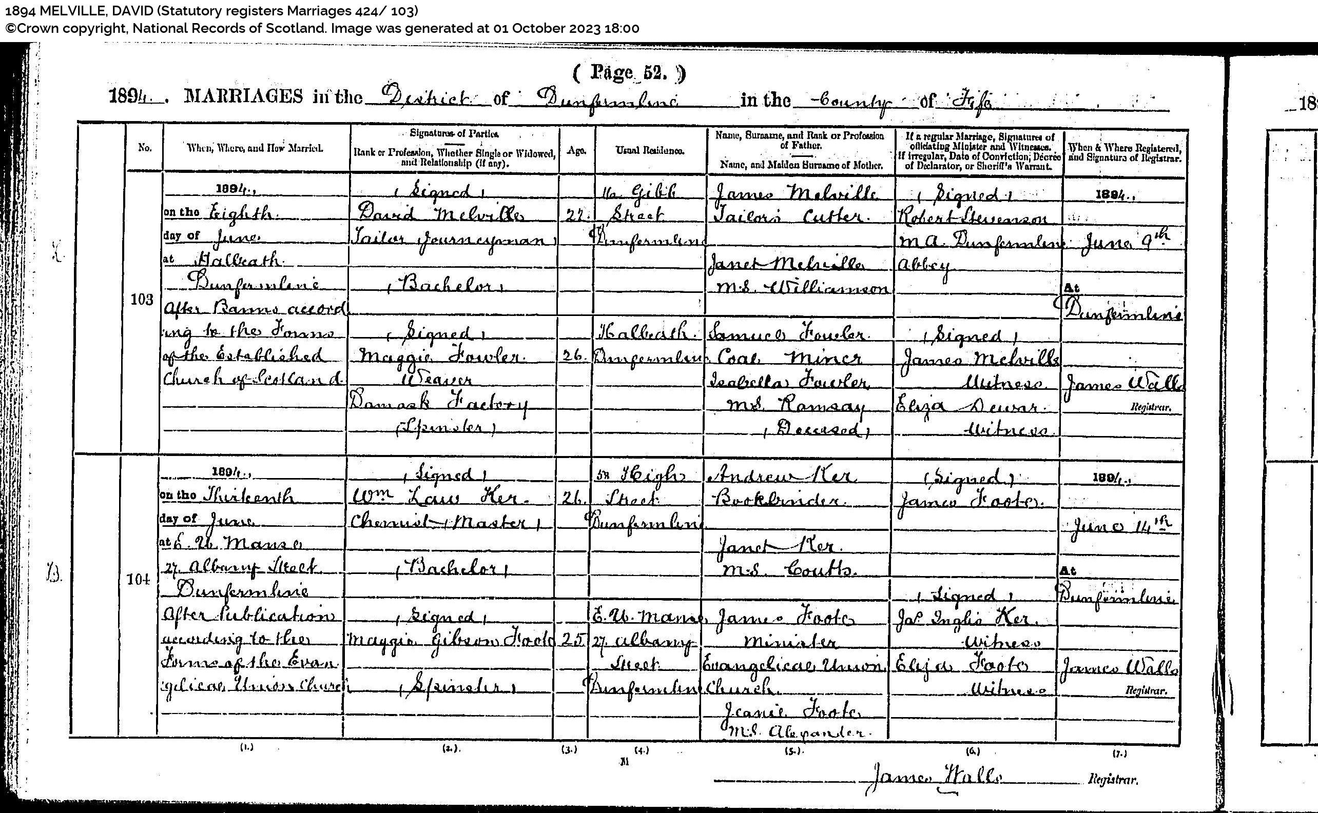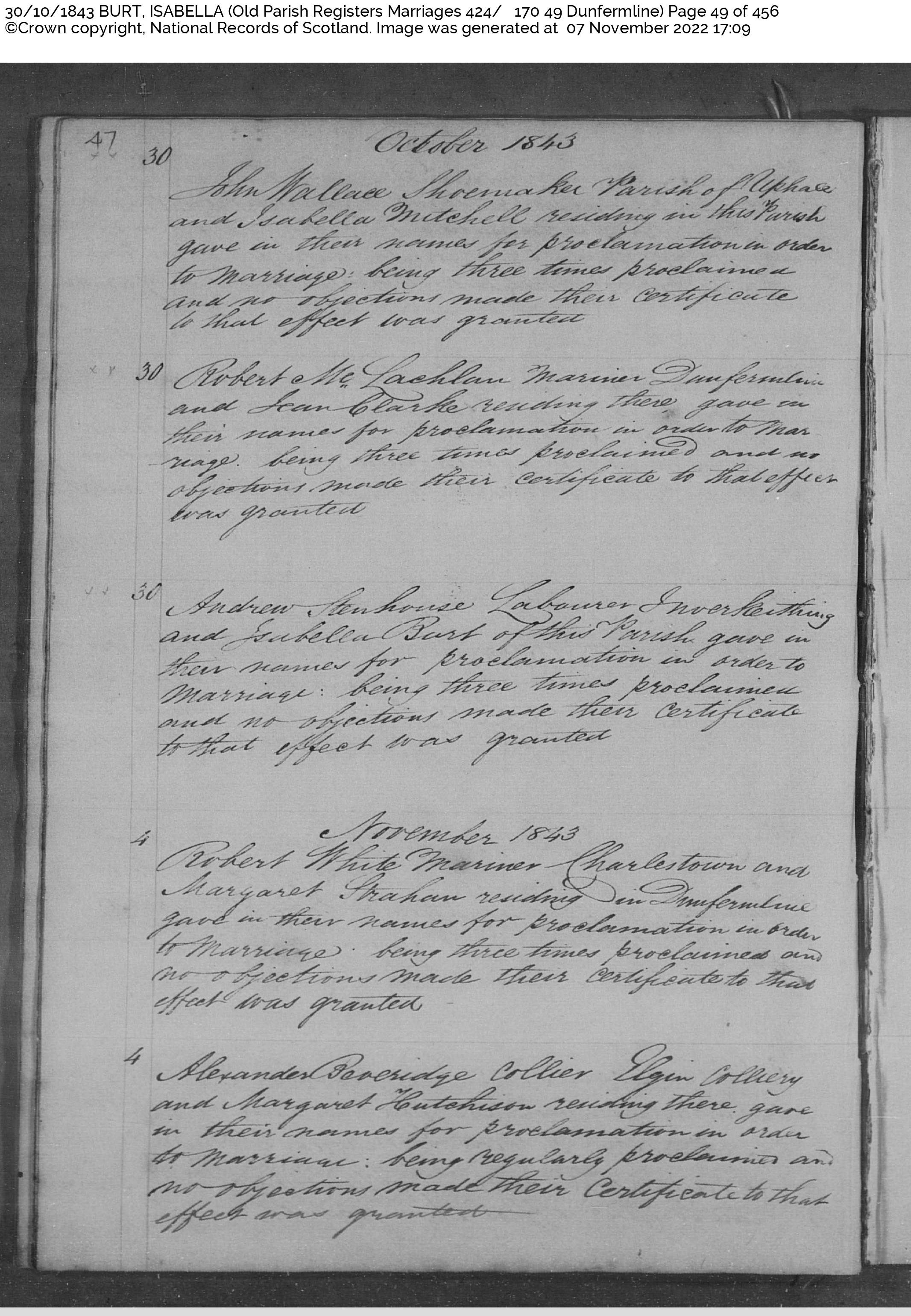 | 104 | SP | CH | MAR | 1843 | R095.jpg | 1843-10-20 MAR Isabella Burt + Andrew Stenhouse – Dunfermline and Inverkeithing [[R095]] | LOCAL | ONLINE |