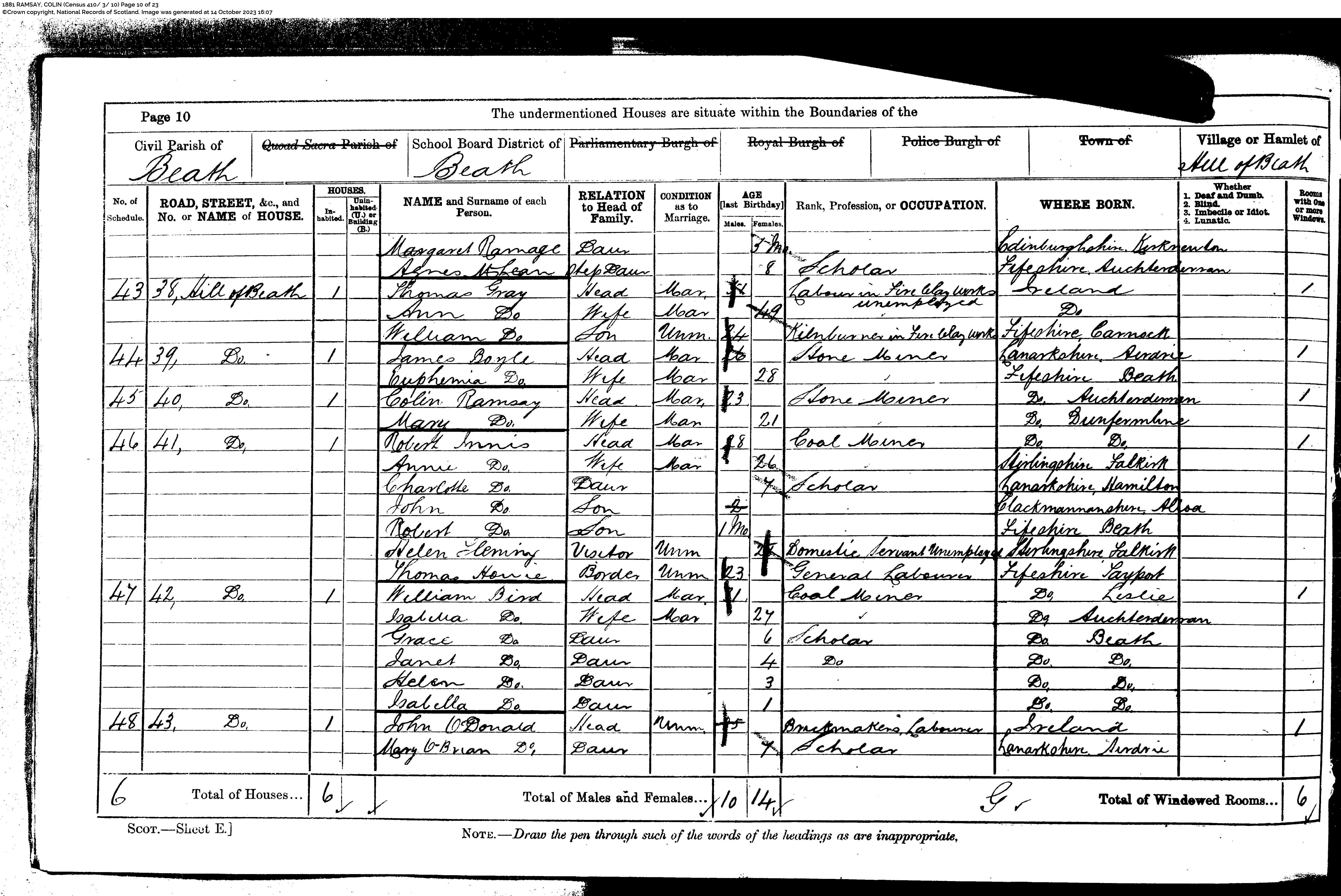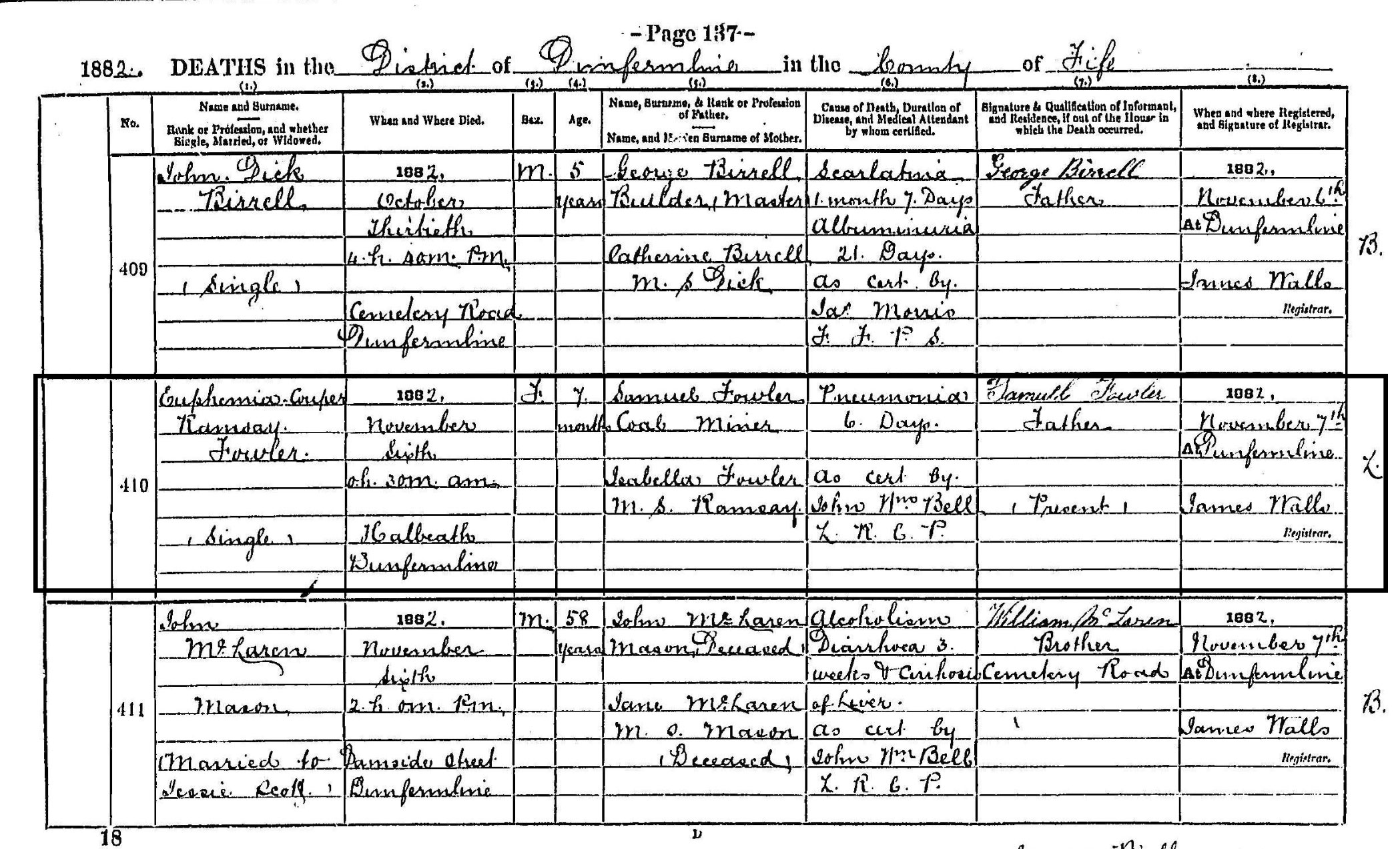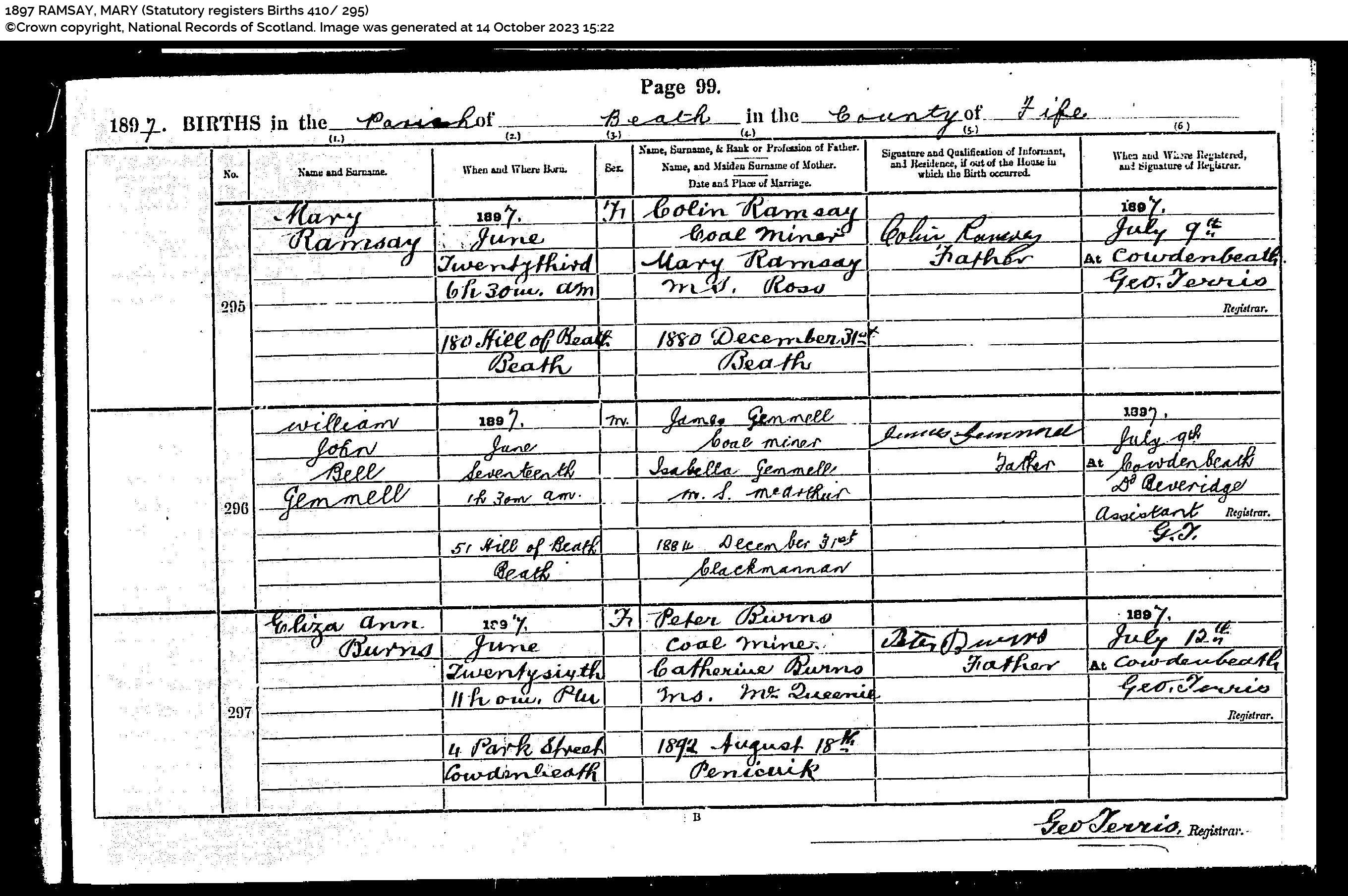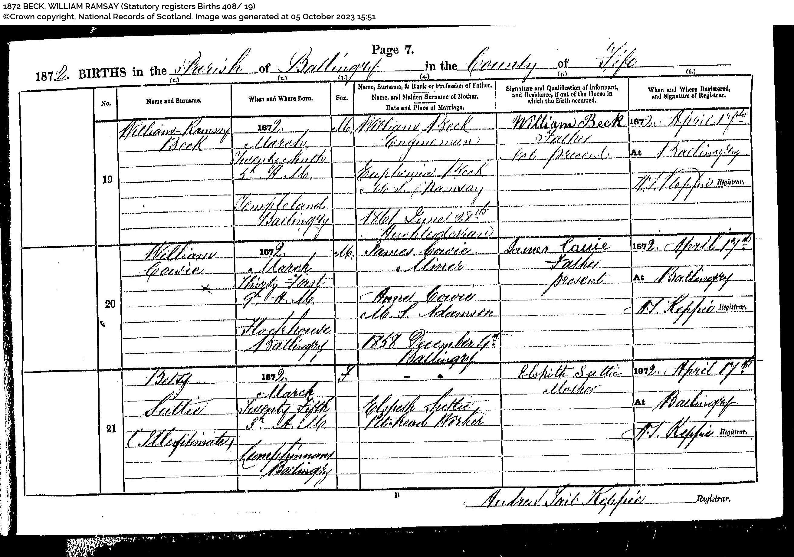 | 5 | SP | STAT | BIR | 1857 | R005.jpg | 1857-04-19 BIR Colin Ramsay child of Euphemia Couper Ramsay – , Glencraig Cottages, Auchterderran, [[R005]] | LOCAL | ONLINE |