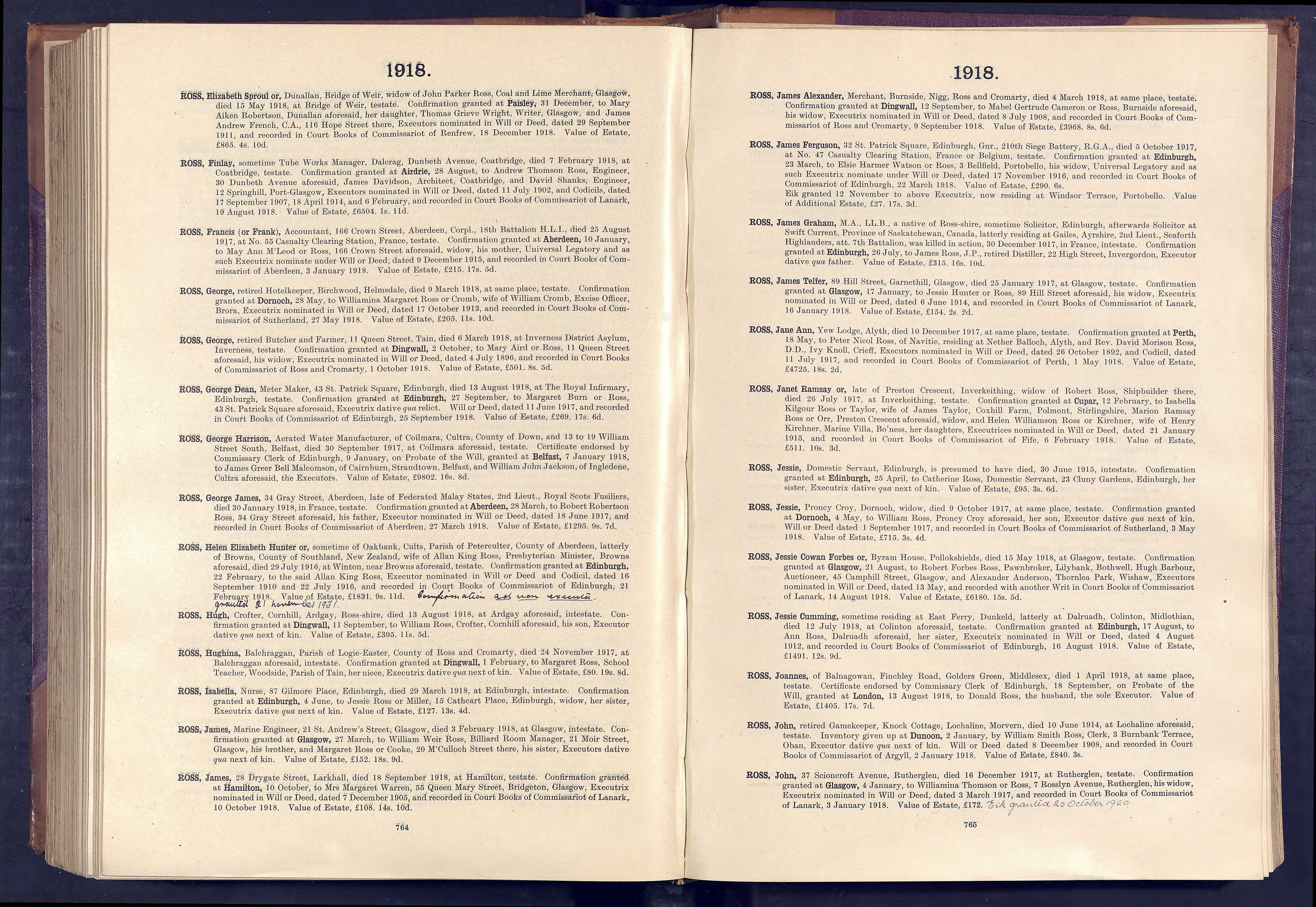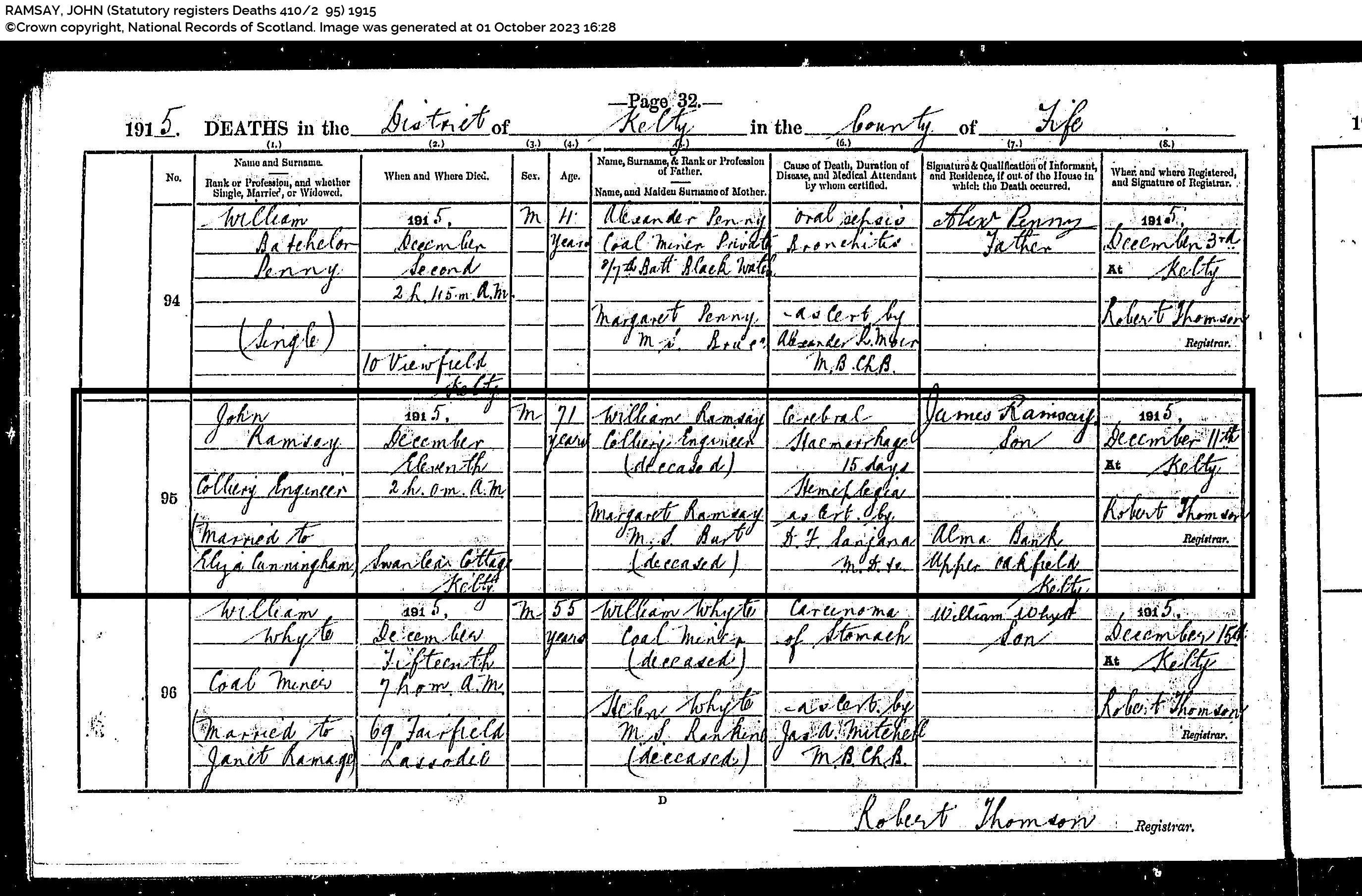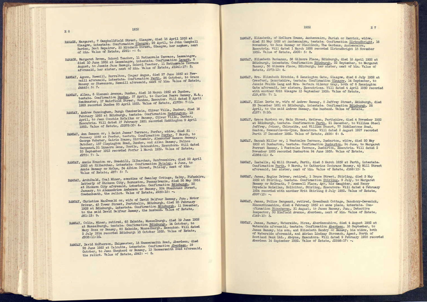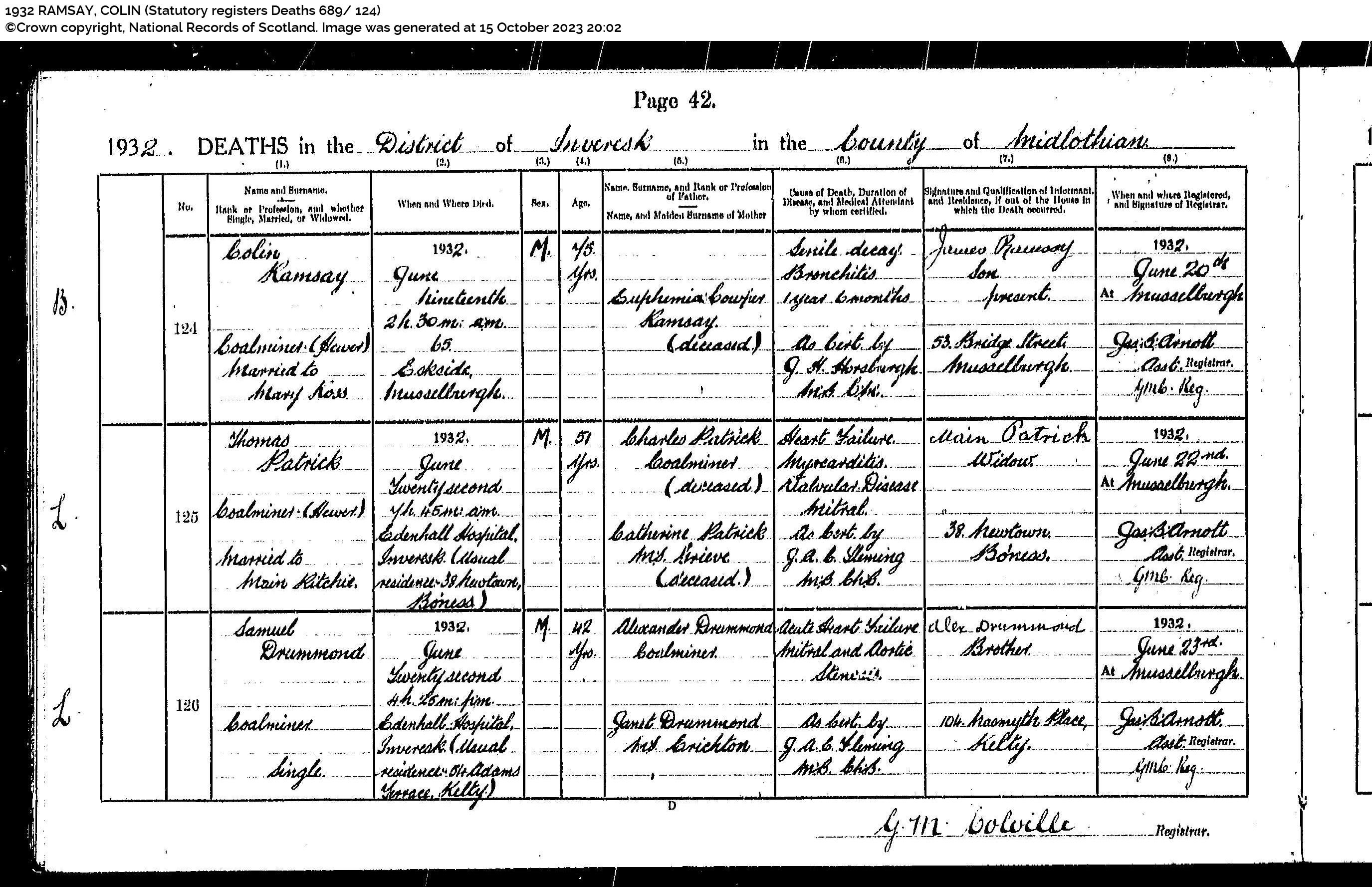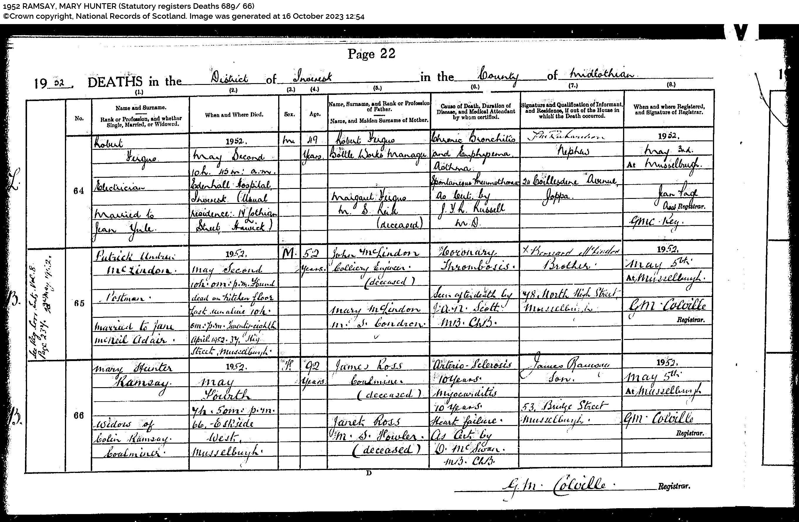 | 103 | SP | STAT | DEA | 1932 | R094.jpg | 1932-06-19 DEA Colin Ramsay husband of Mary Hunter Ross – 65 Eskside North, Musselburgh, Midlothian, Scotland [[R094]] | LOCAL | ONLINE |
