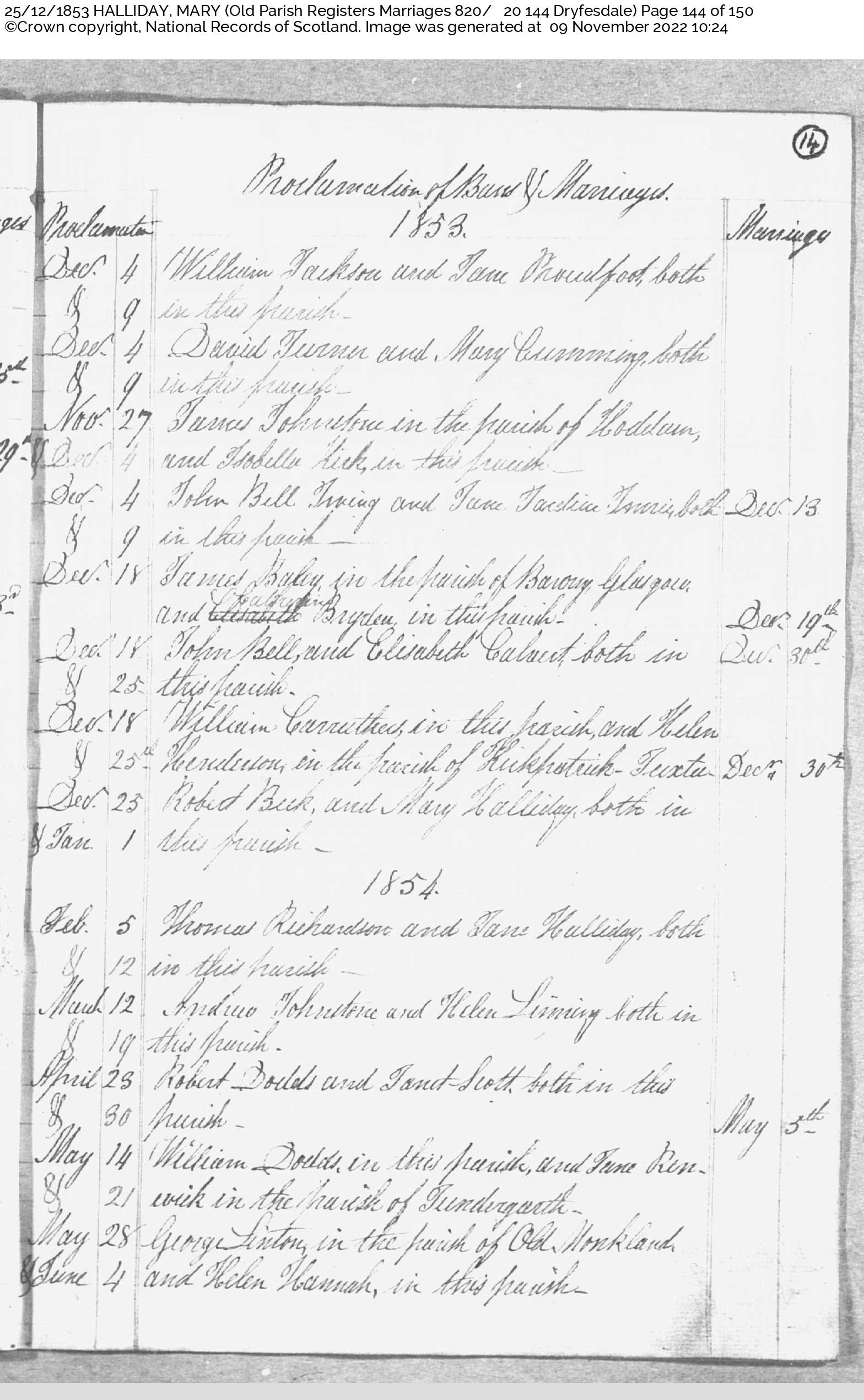 | 109 | SP | CH | MAR | 1853 | R100.jpg | 1853-12-25 MAR Mary Halliday +Thomas Richardson – Dryfesdale [[R100]] | LOCAL | ONLINE |