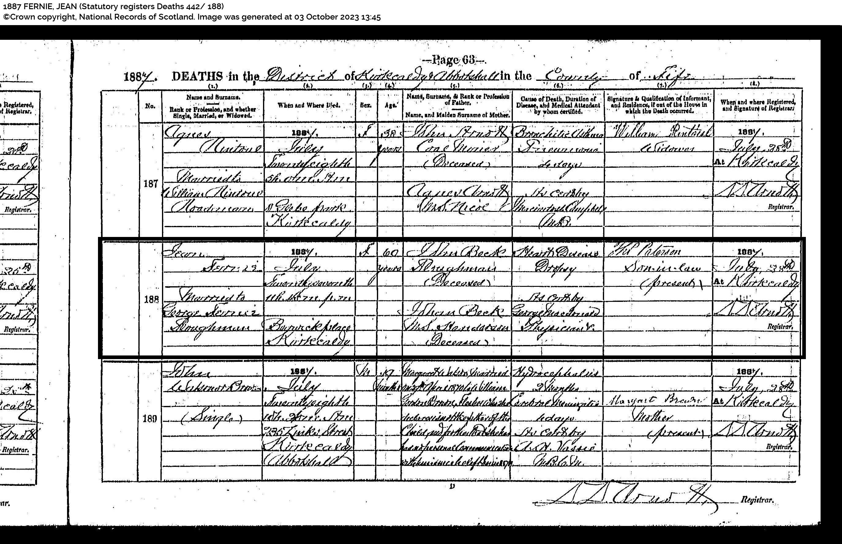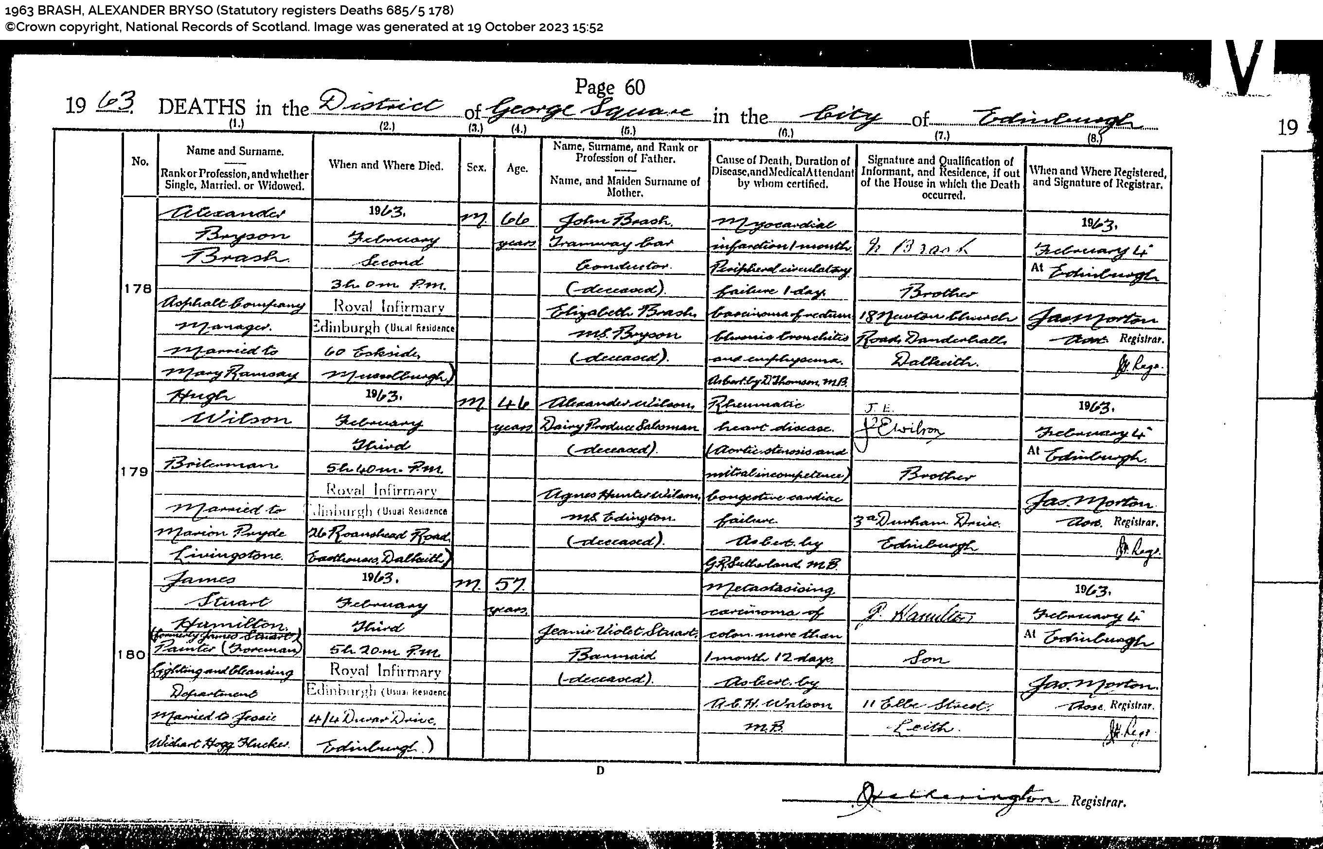 | 203 | SP | STAT | DEA | 1963 | R184.jpg | 1963-02-03 DEA Alexander Bryson Brash husband of Mary Ramsay – Musselburgh [[R184]] | LOCAL | ONLINE |