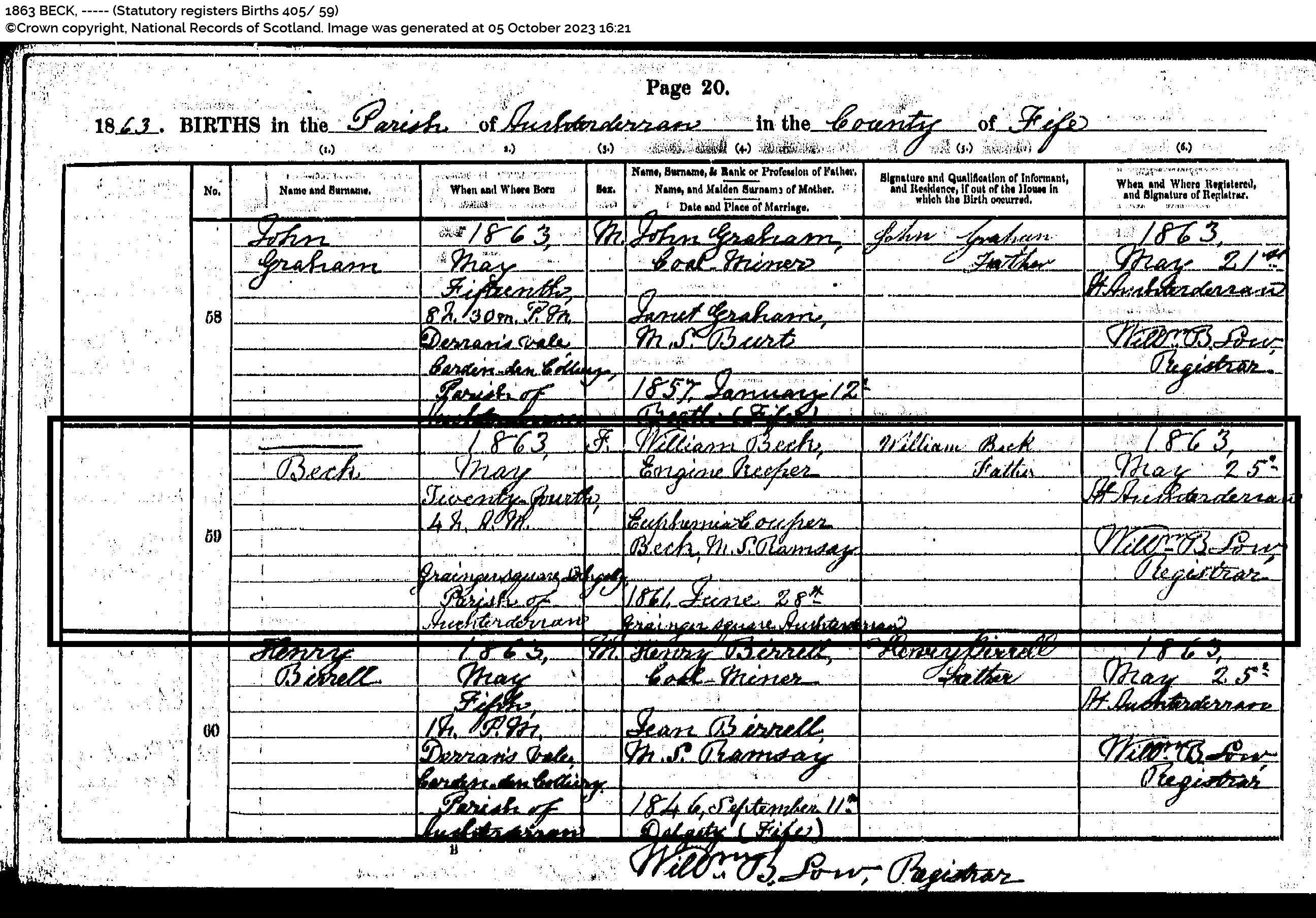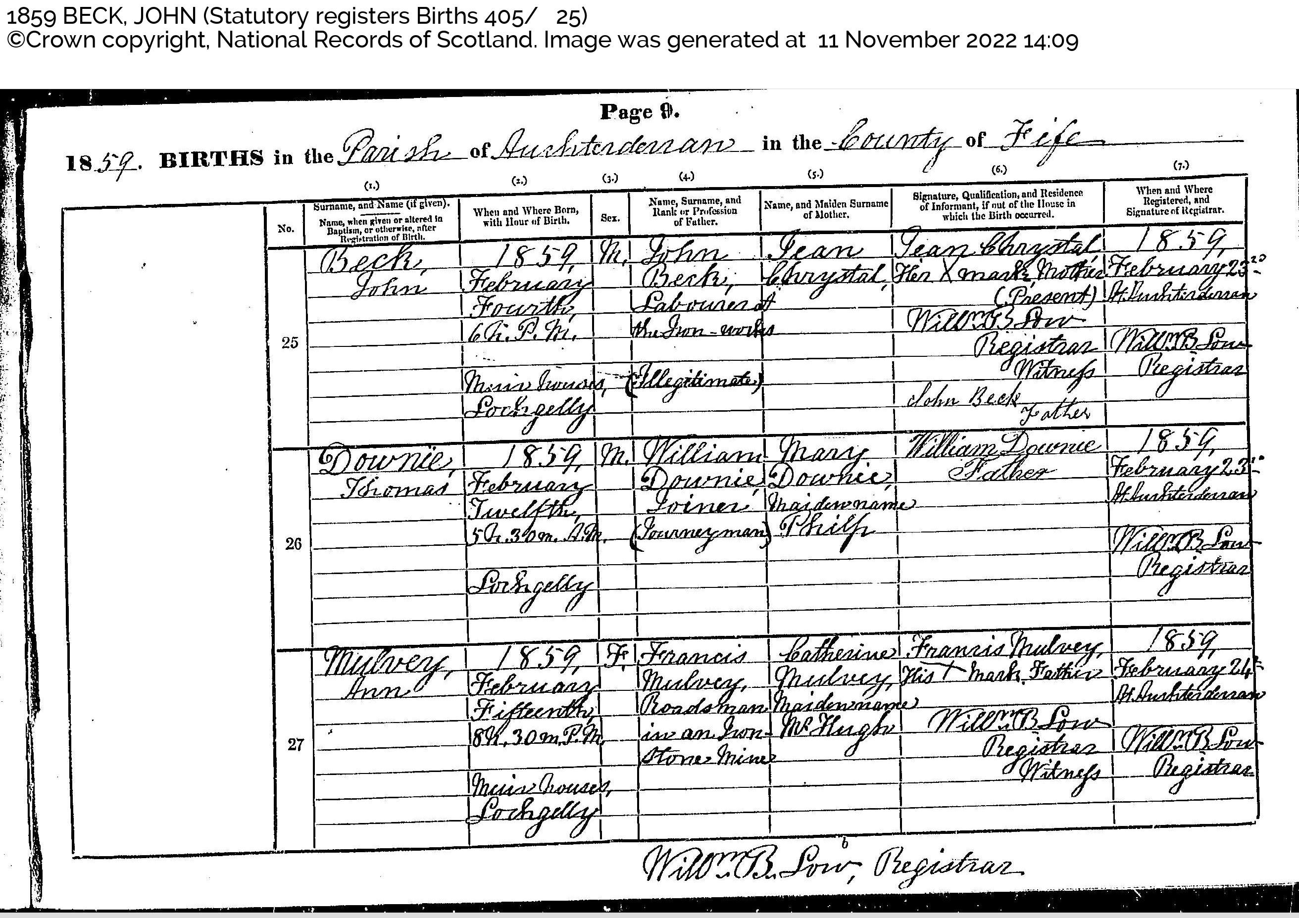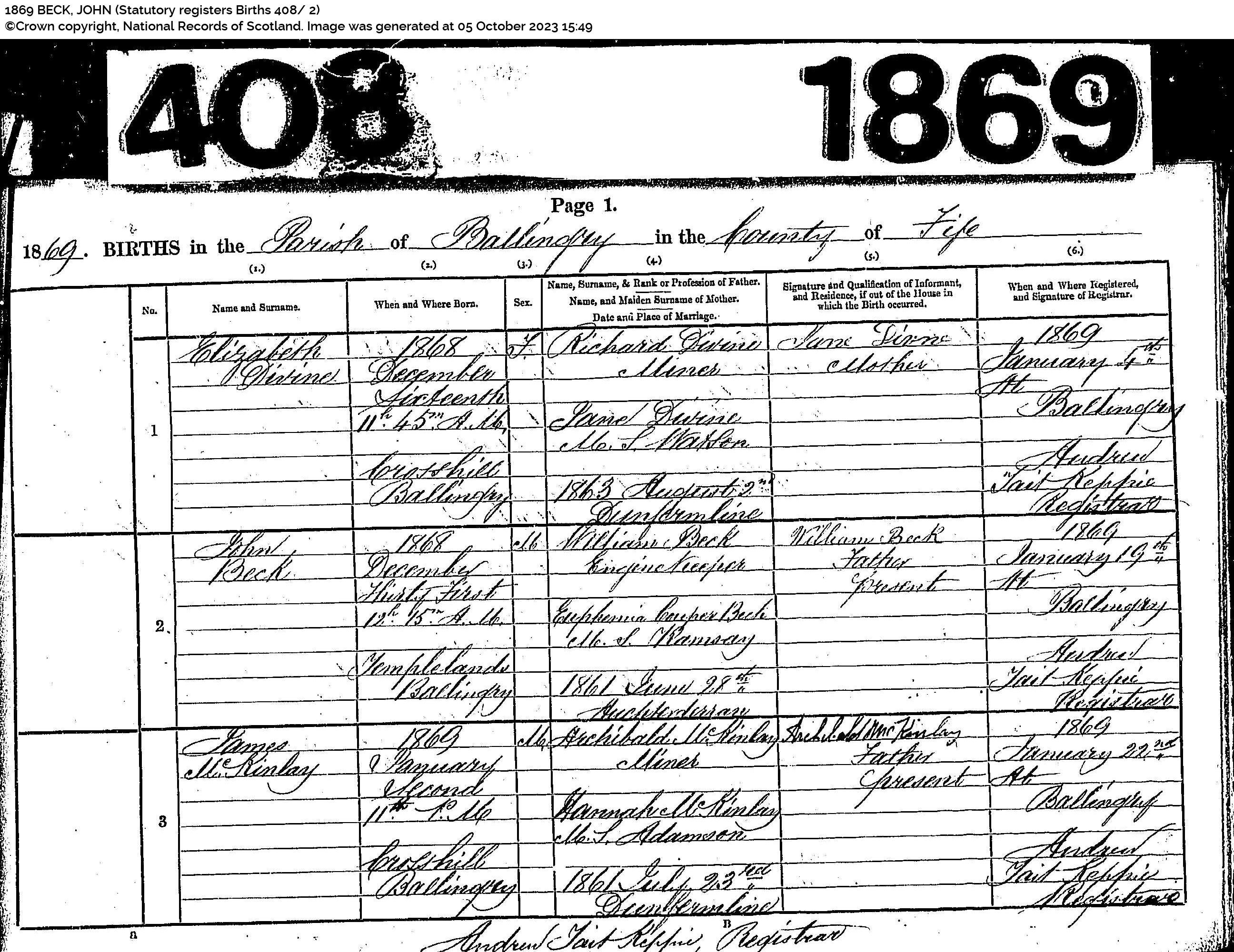 | 118 | SP | STAT | BIR | 1859 | R109.jpg | 1859-02-04 John Beck child of John Beck + Jean Chrystal, Lochgelly [[R109]] | LOCAL | ONLINE |