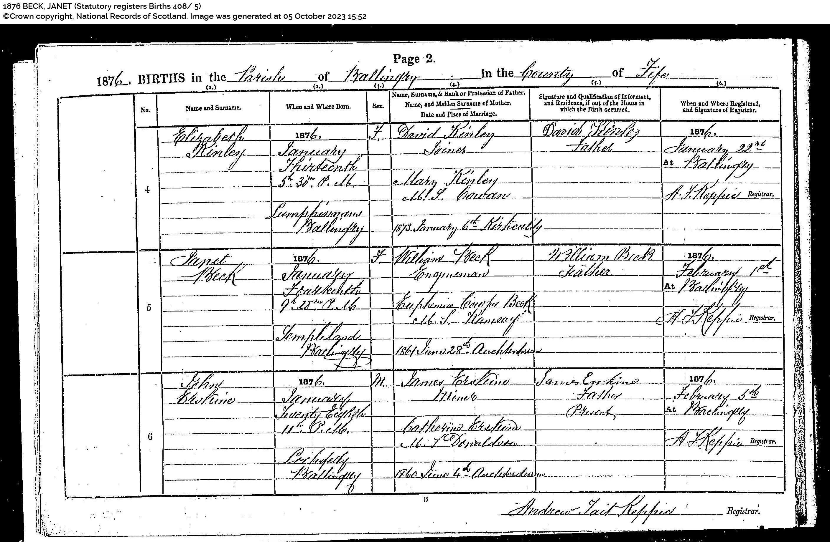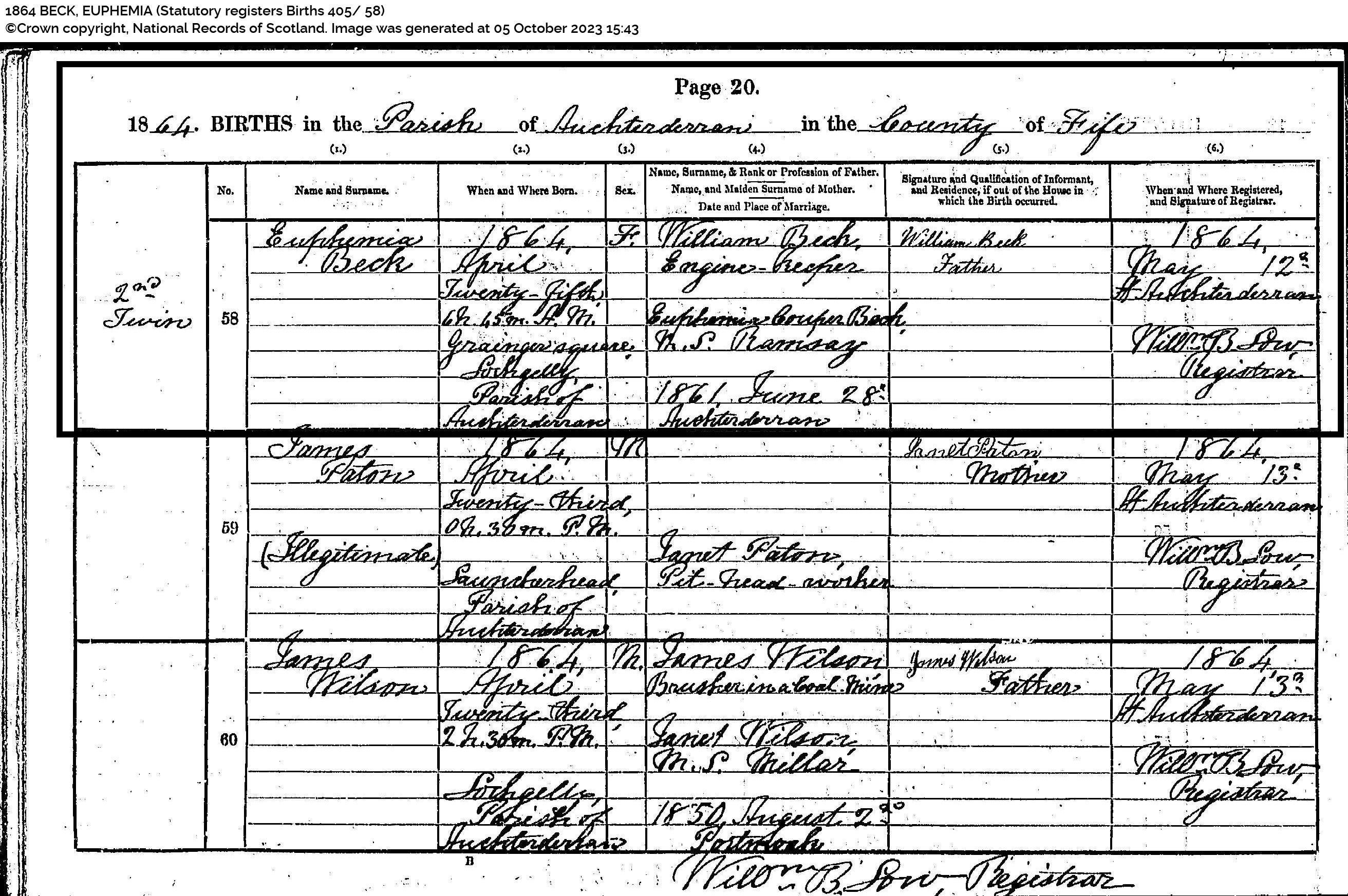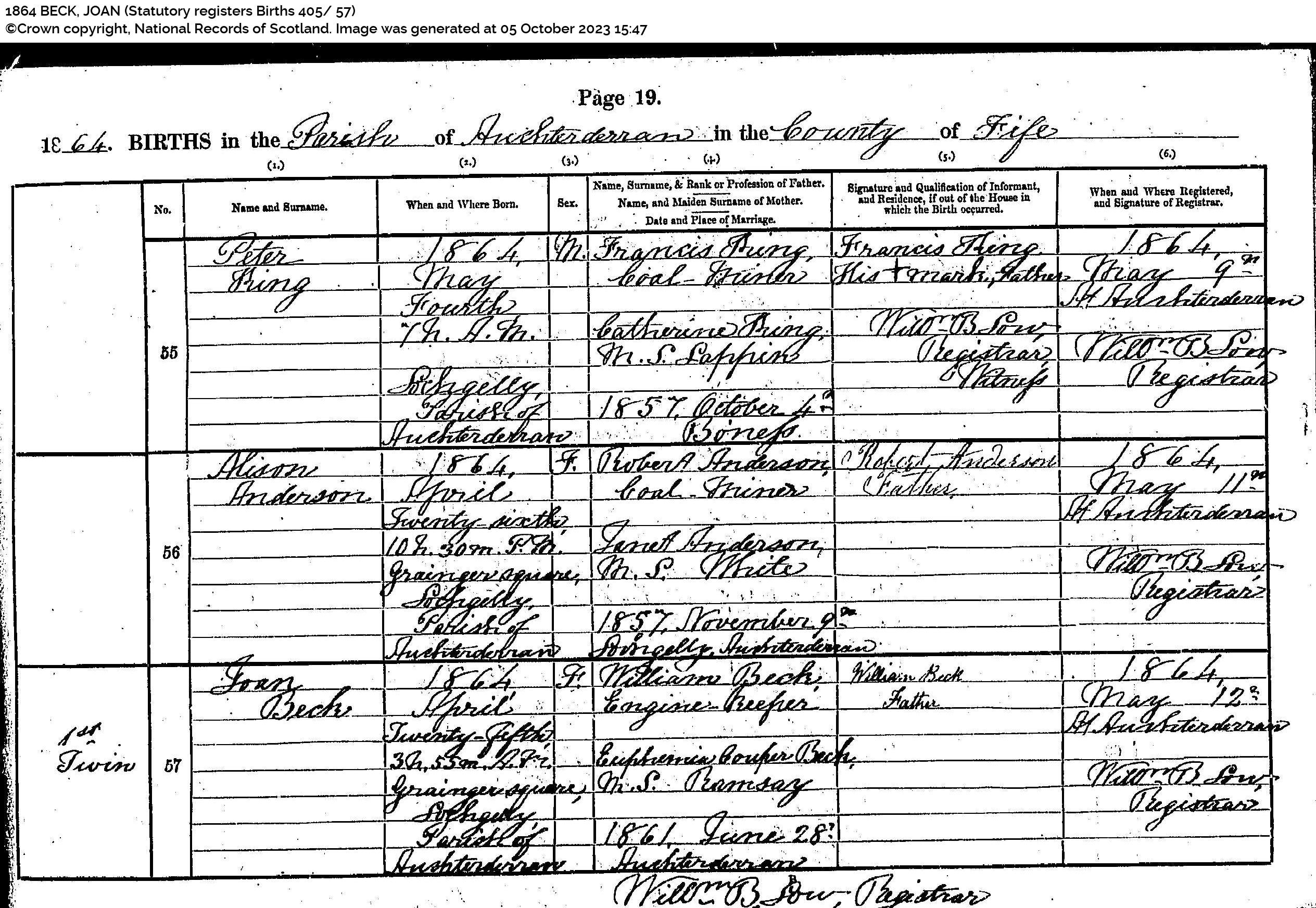 | 118 | SP | STAT | BIR | 1859 | R109.jpg | 1859-02-04 John Beck child of John Beck + Jean Chrystal, Lochgelly [[R109]] | LOCAL | ONLINE |