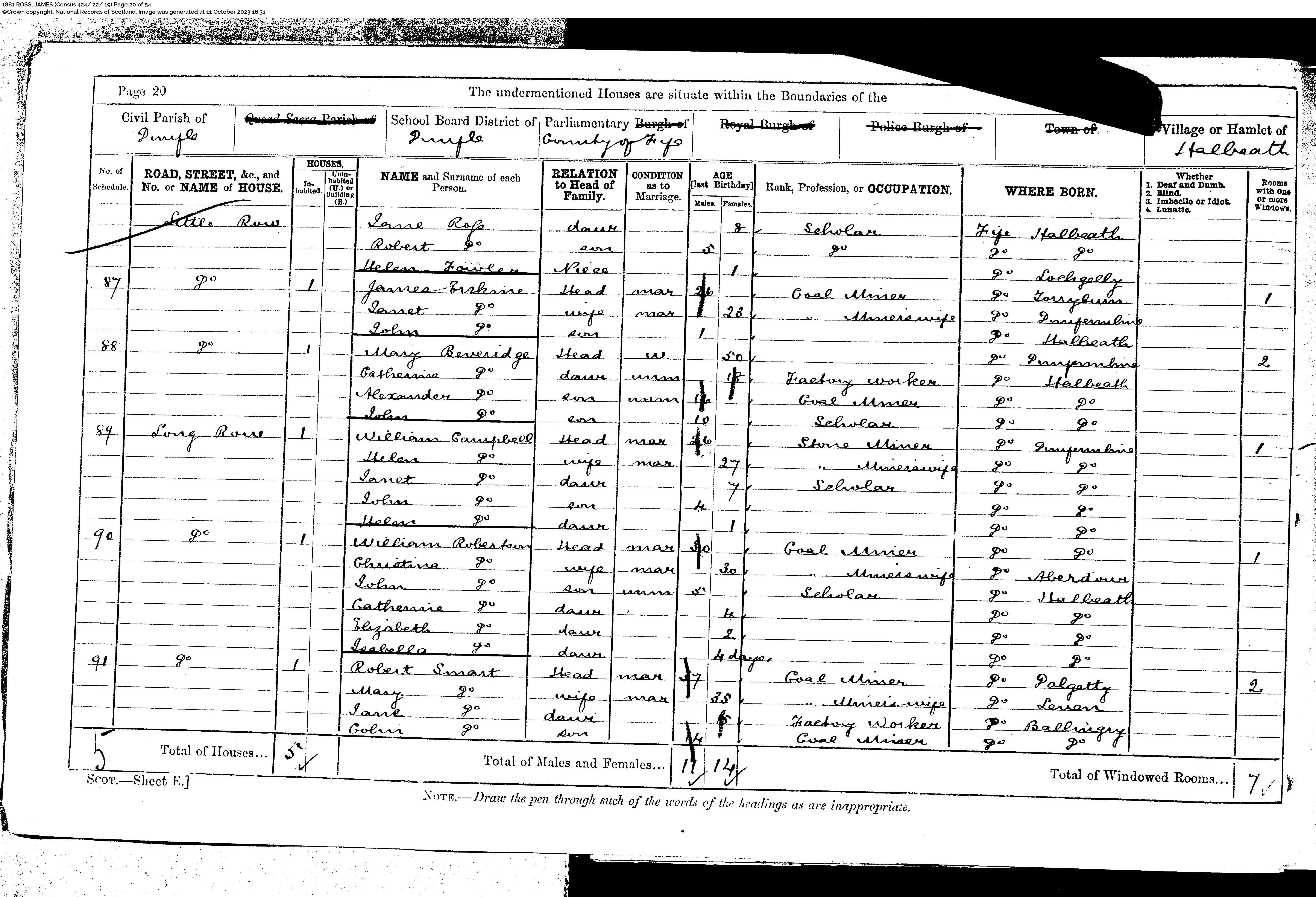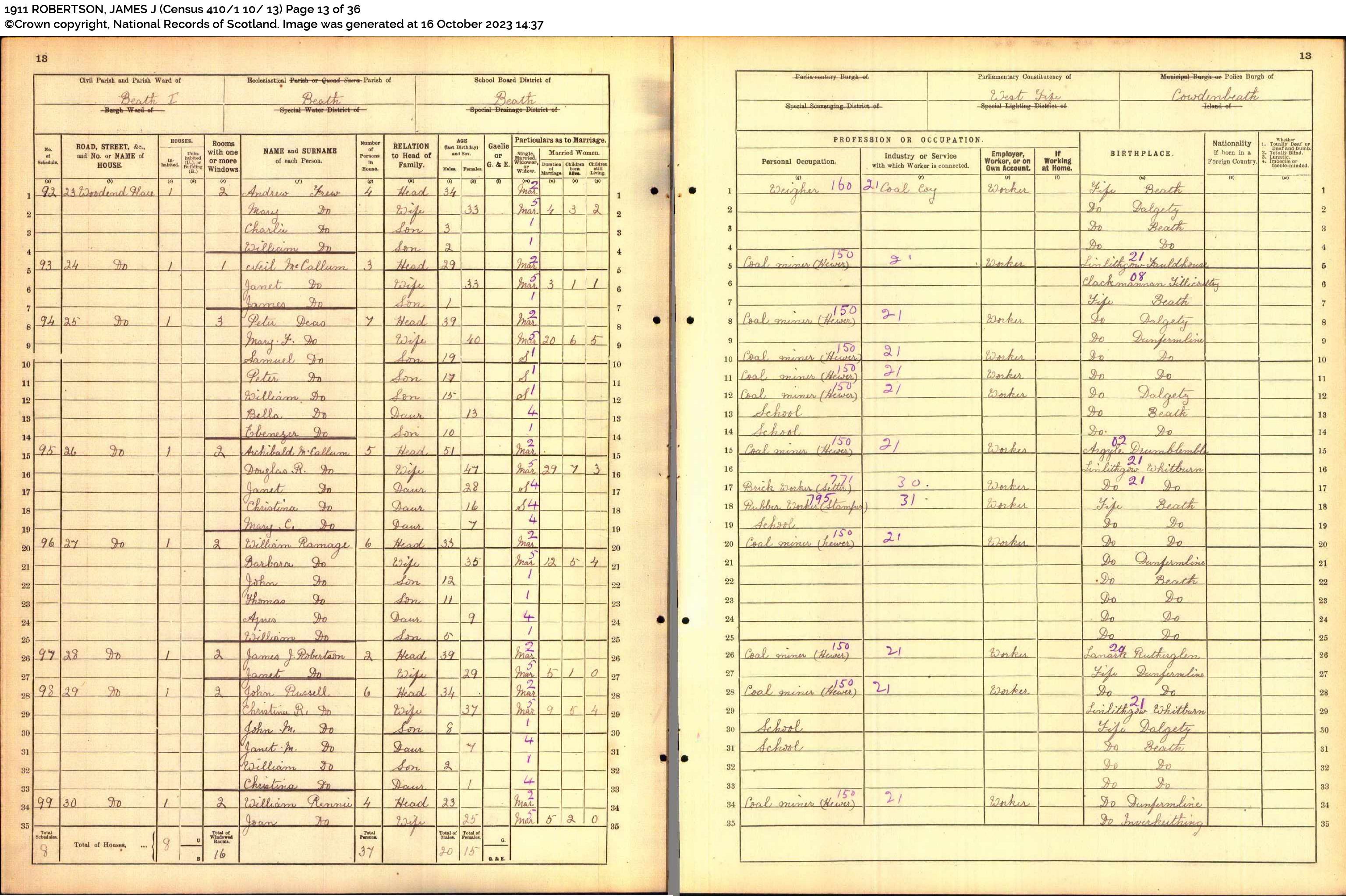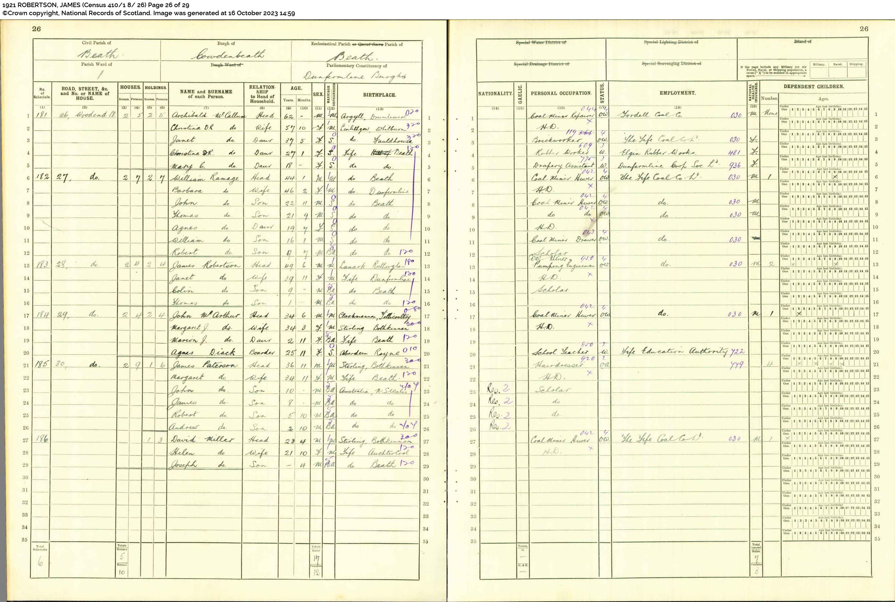 | 189 | SP | STAT | CEN | 1921 | R171-h1.jpg | 1921-06-19 CEN James John Robertson + Janet Fowler Ramsay – 28 Woodend Place, Beath, Fife, Scotland [[R171-h1]] | LOCAL | ONLINE |