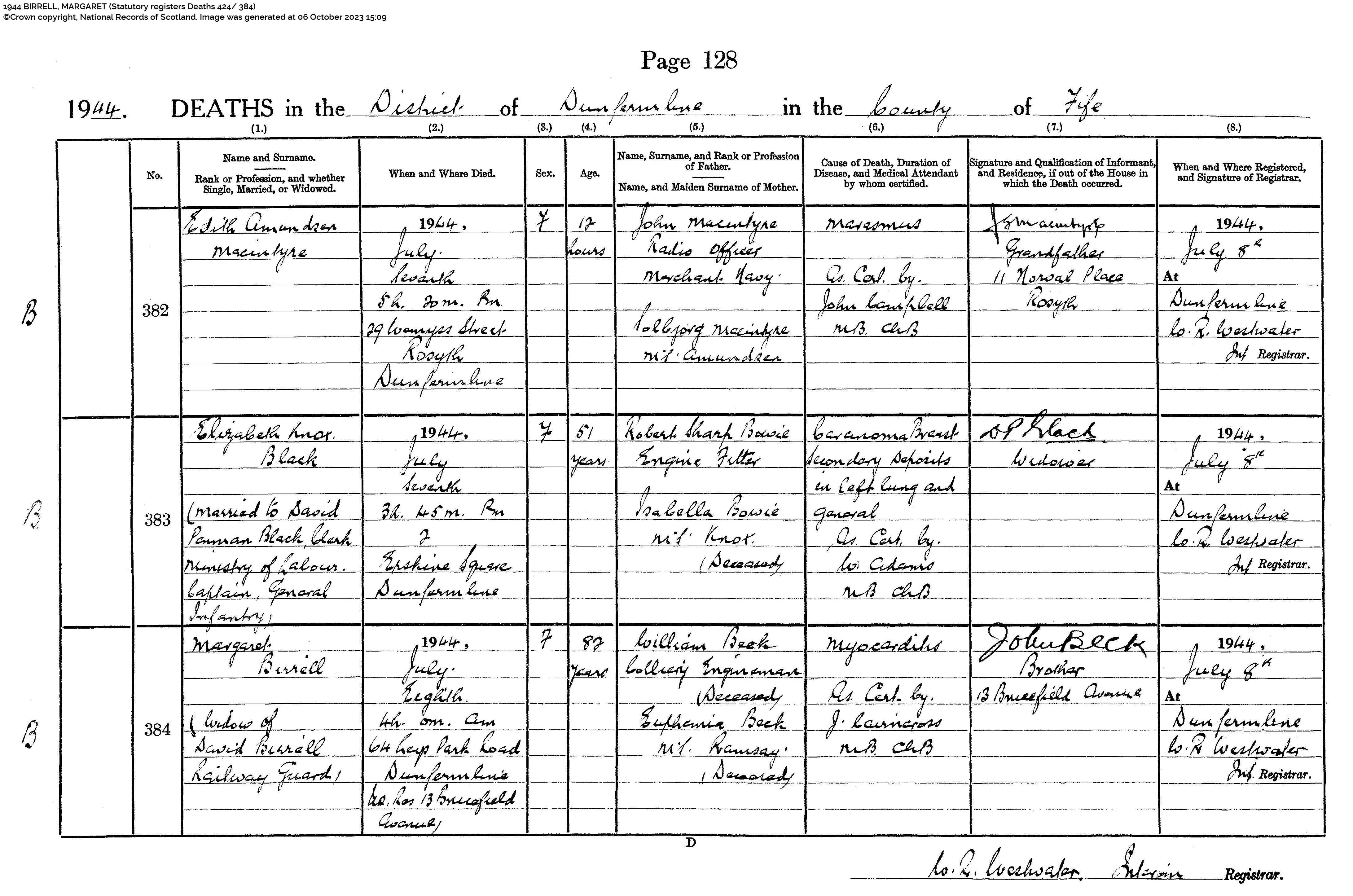| 137 | SP | STAT | DEA | 1944 | R129.jpg | 1944-07-08 DEA Margaret Birrell or Beck – Dunfermline [[R129]] | LOCAL | ONLINE |