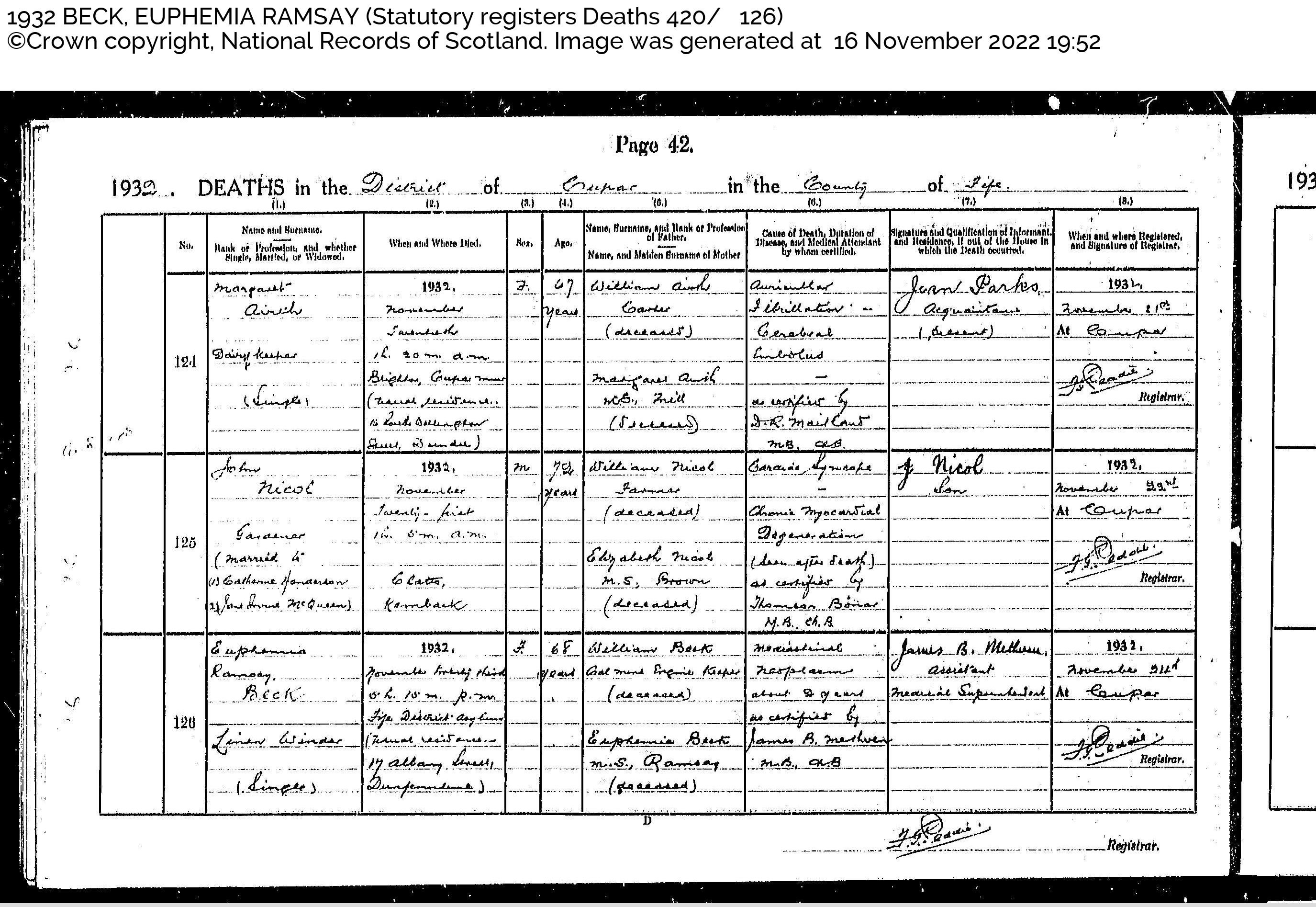 | 148 | SP | STAT | DEA | 1932 | R137.jpg | 1932-11-23 DEA Euphemia Ramsay Beck – Fife District Asylum [[R137]] | LOCAL | ONLINE |