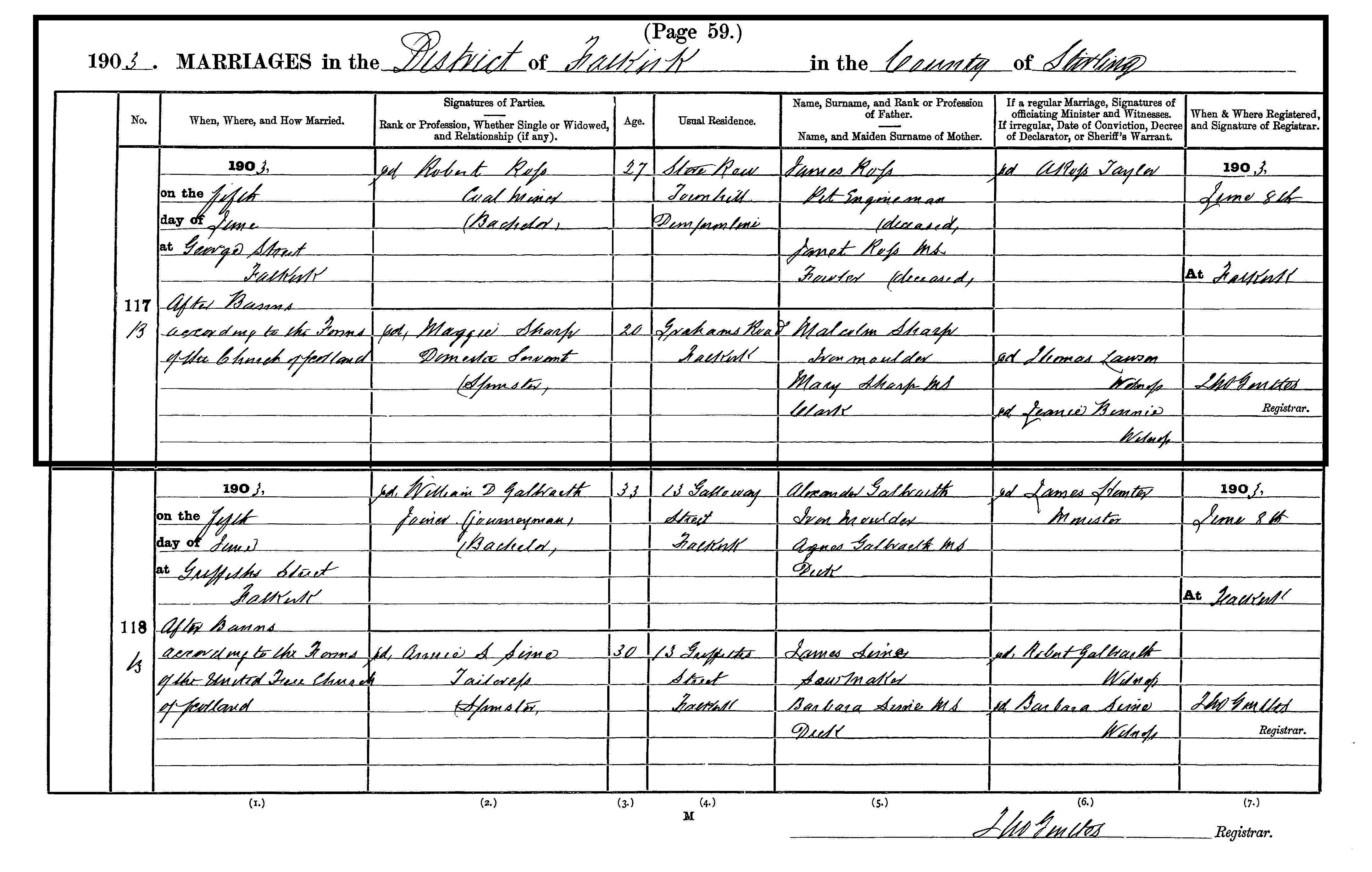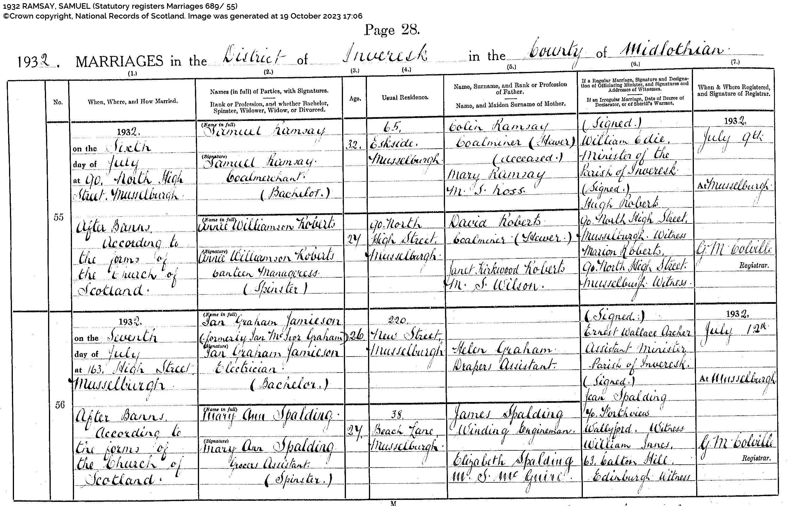 | 206 | SP | STAT | MAR | 1932 | R187.jpg | 1932-07-06 MAR Samuel Ramsay + Annie Williamson Roberts – Musselburgh [[R187]] | LOCAL | ONLINE |