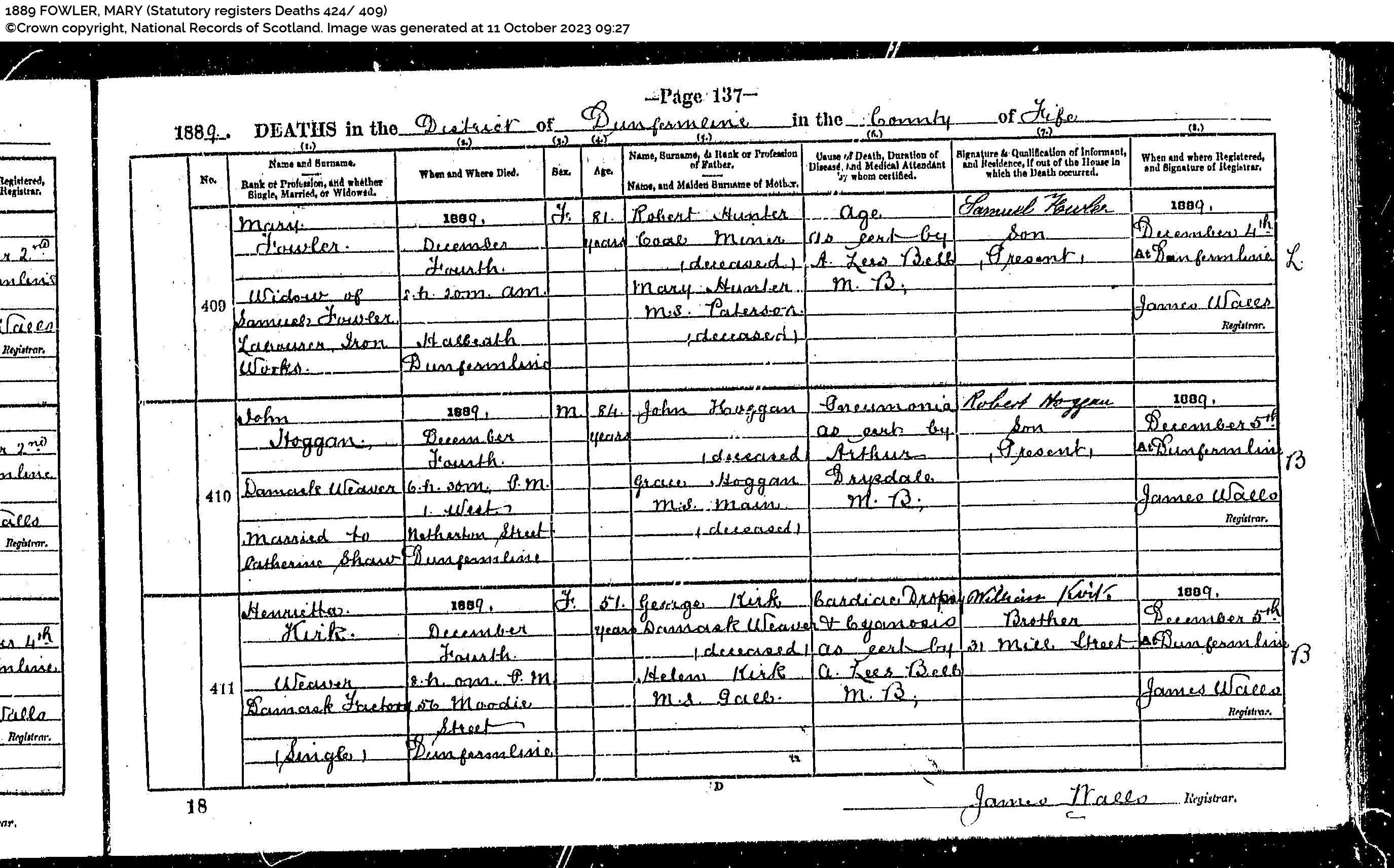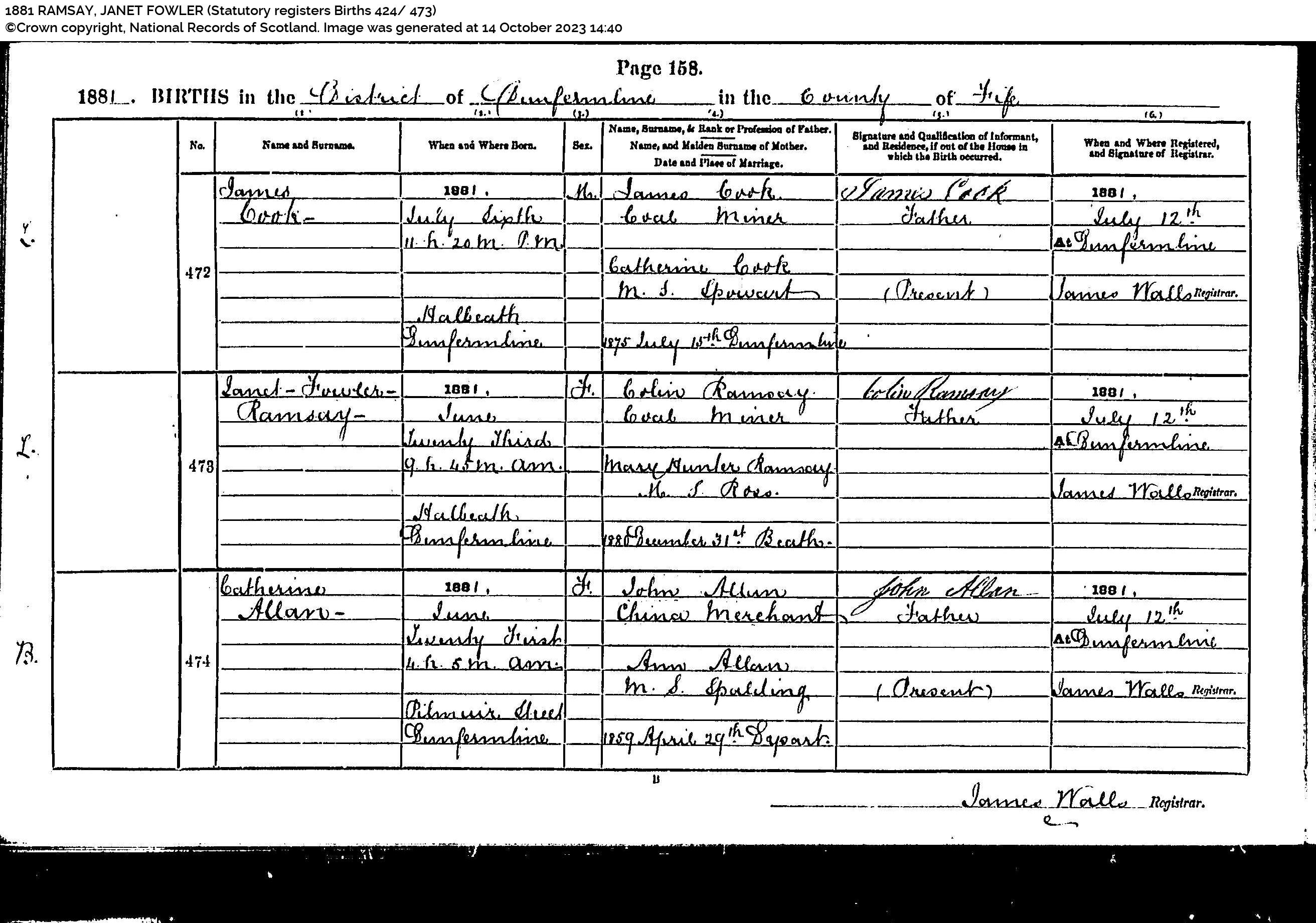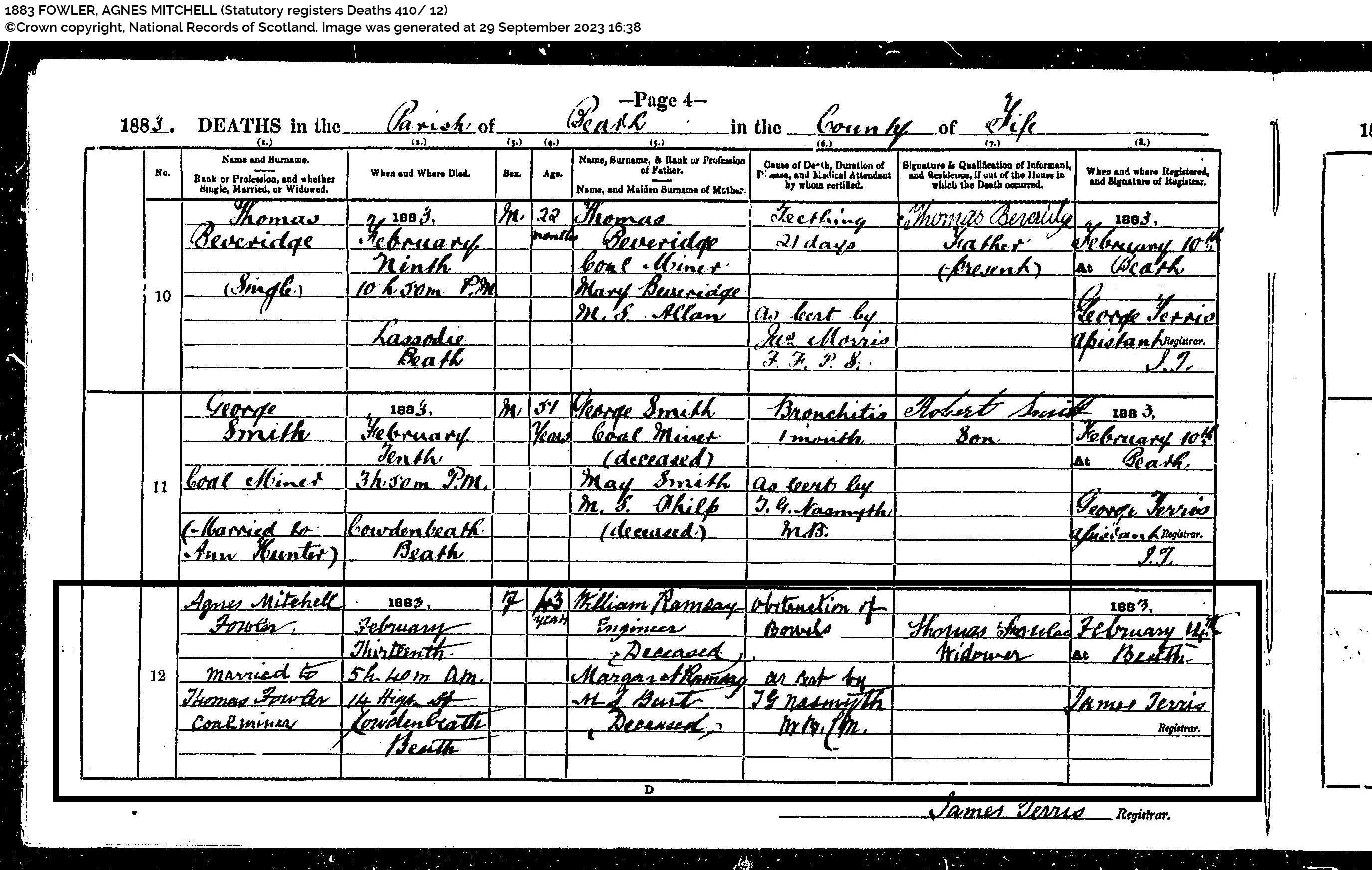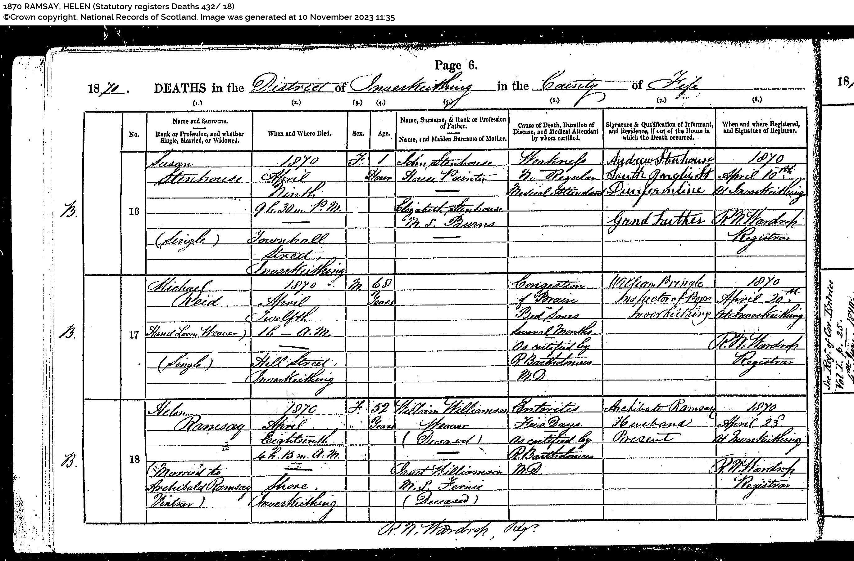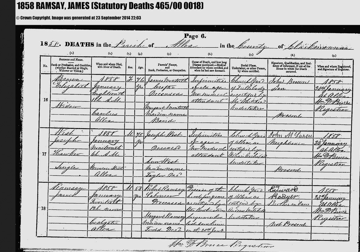 | 349 | ANC | STAT | DEA | 1858 | R317.jpg | 1858-01-20 DEA James Ramsay child of Robert Ramsay + Margaret Todd, Coalgate, Alloa [[R317]] | LOCAL | ONLINE |