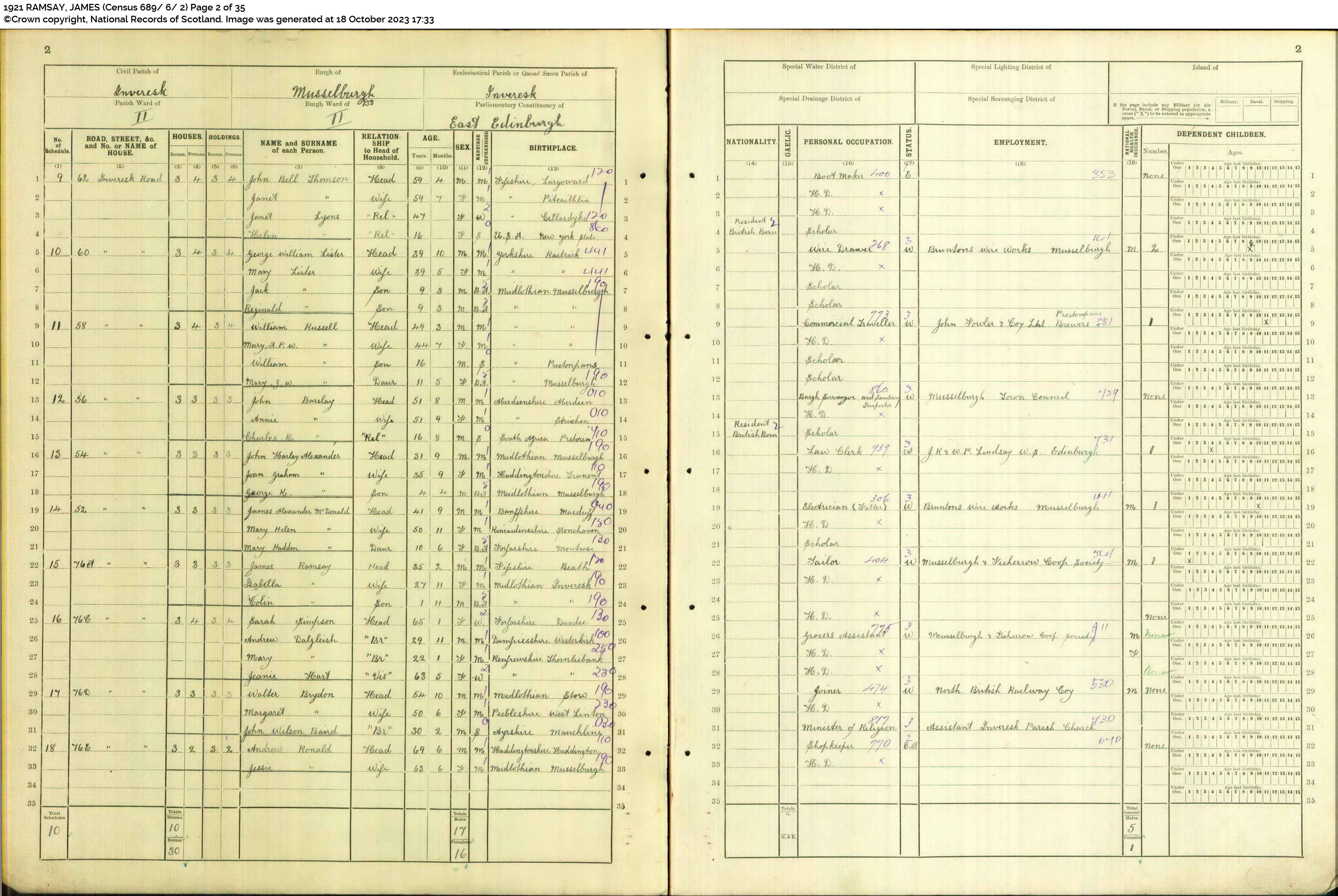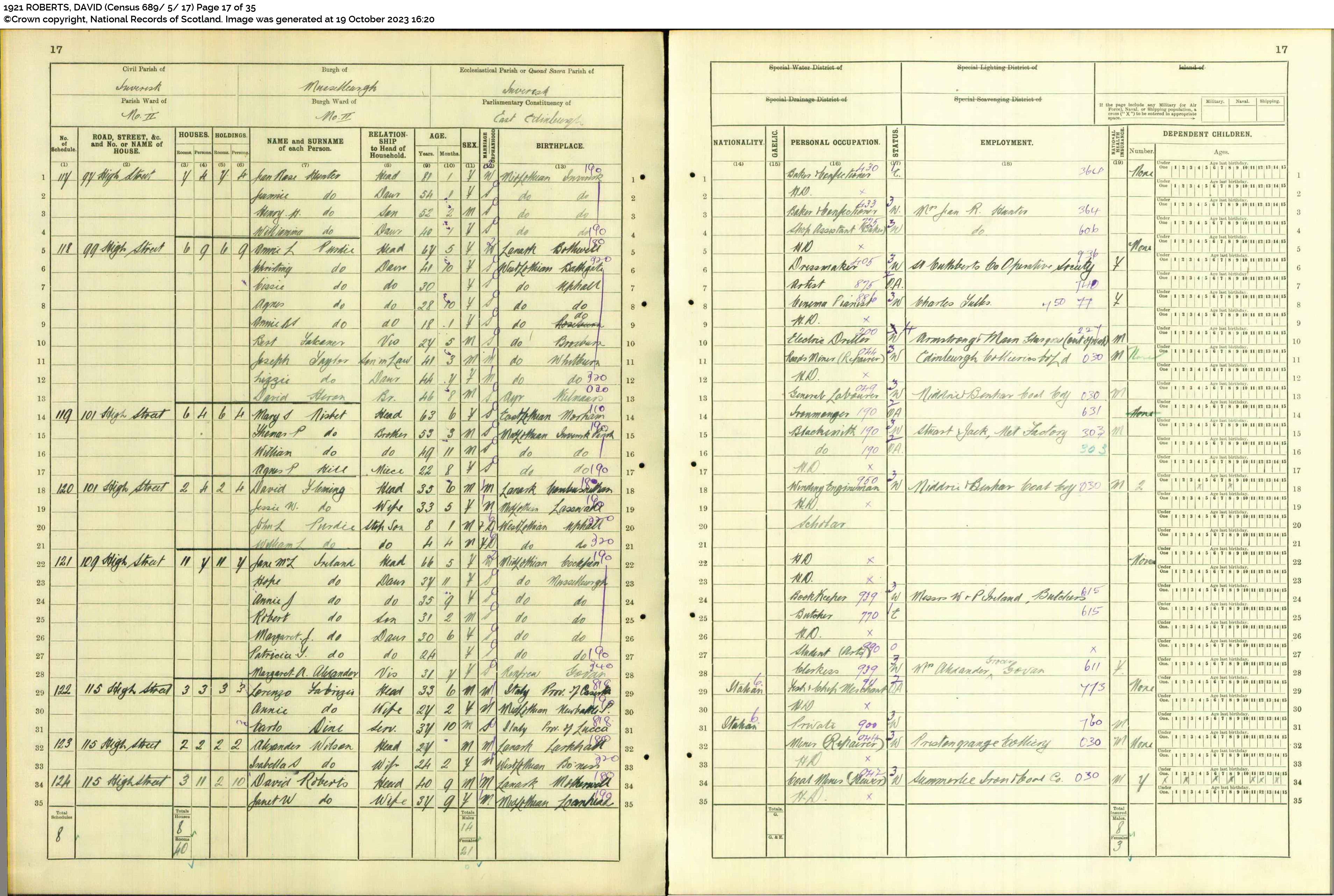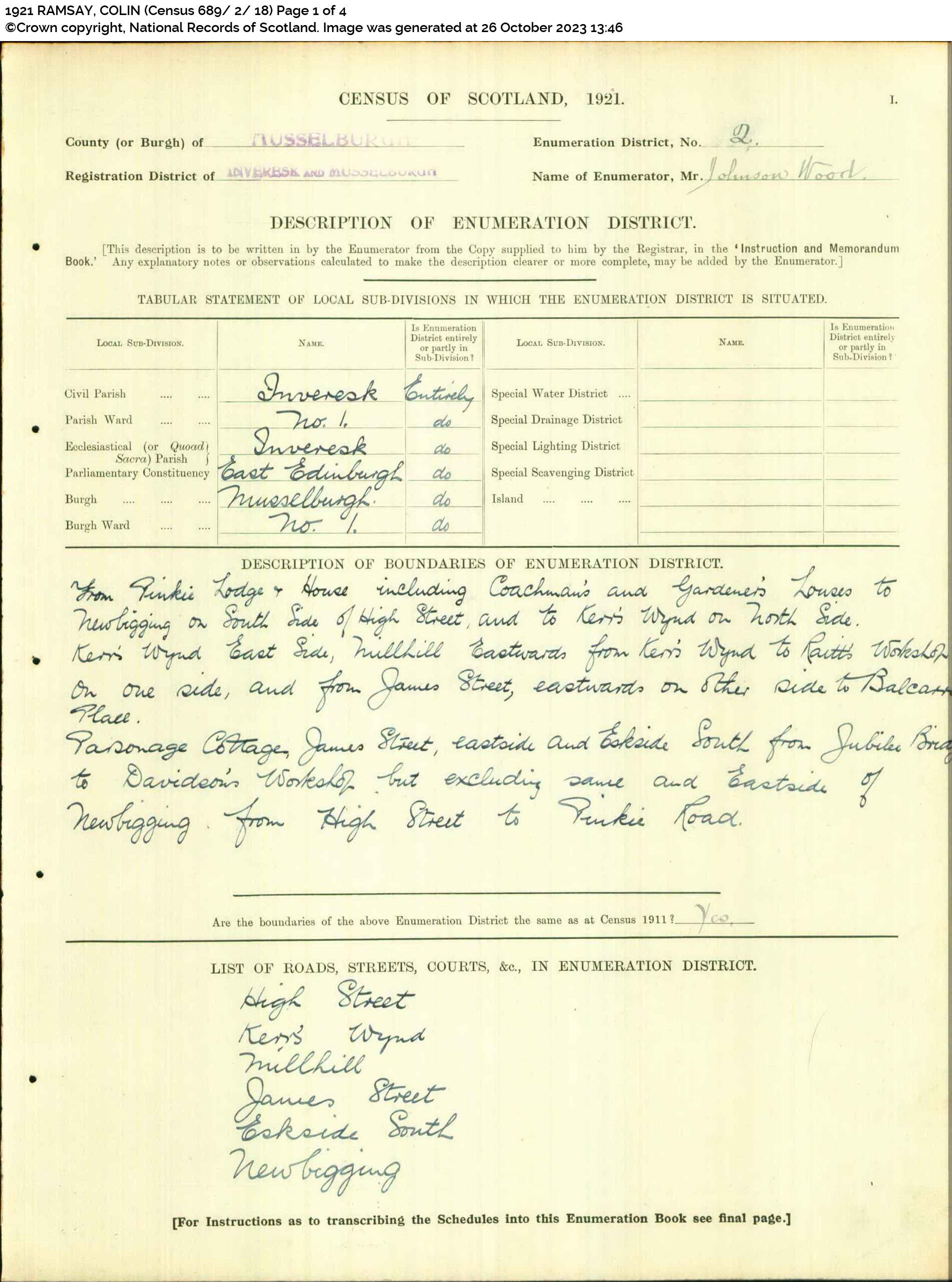 | 209 | SP | STAT | CEN | 1921 | R189.jpg | 1921-06-19 CEN David Roberts + Janet Kirkwood Wilson – 15 High Street, Musselburgh [[R189]] | LOCAL | ONLINE |