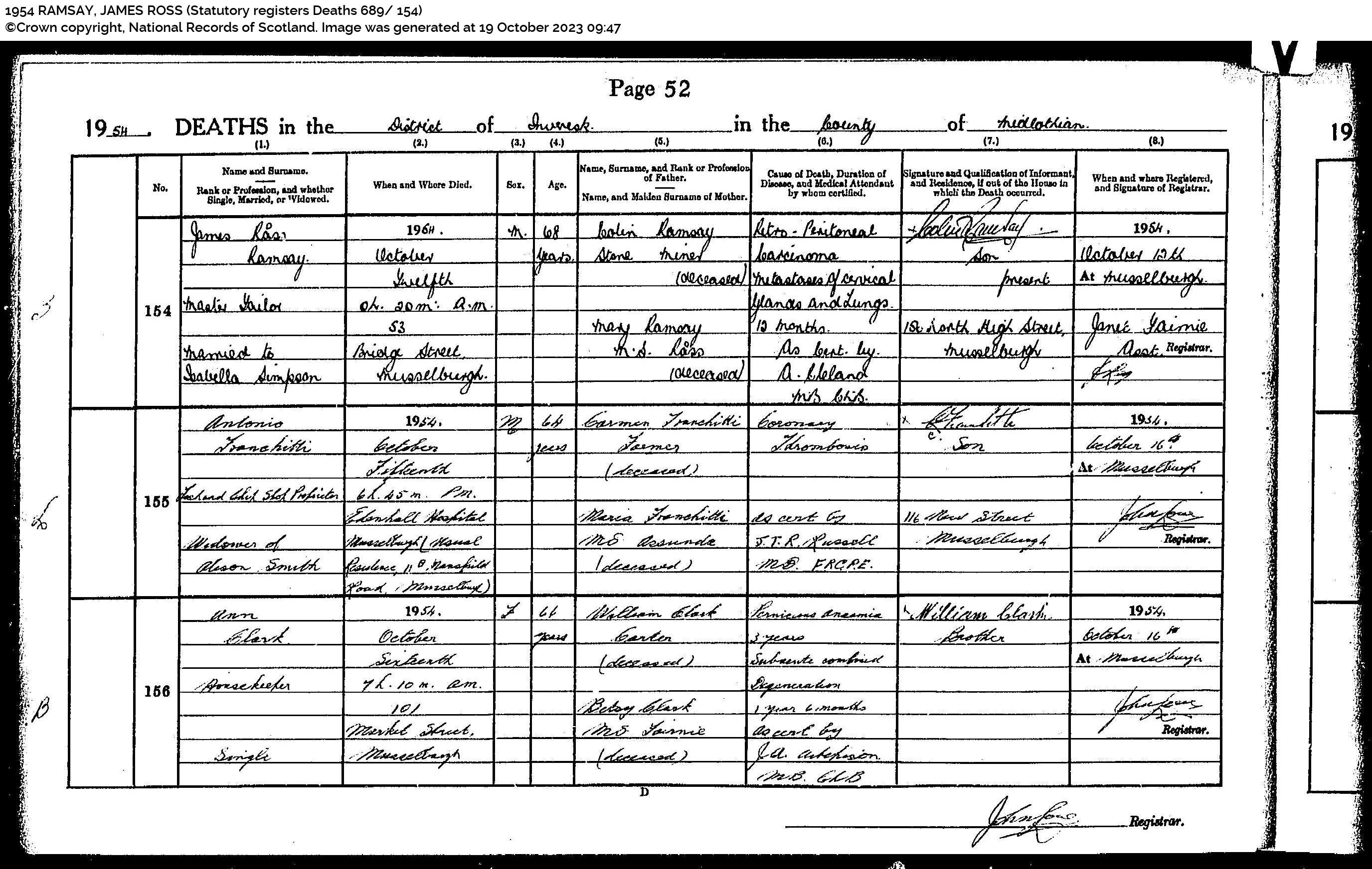 | 197 | SP | STAT | DEA | 1954 | R176.jpg | 1954-10-12 DEA James Ross Ramsay husband of Isabella Martin Simpson – Musselburgh [[R176]] | LOCAL | ONLINE |