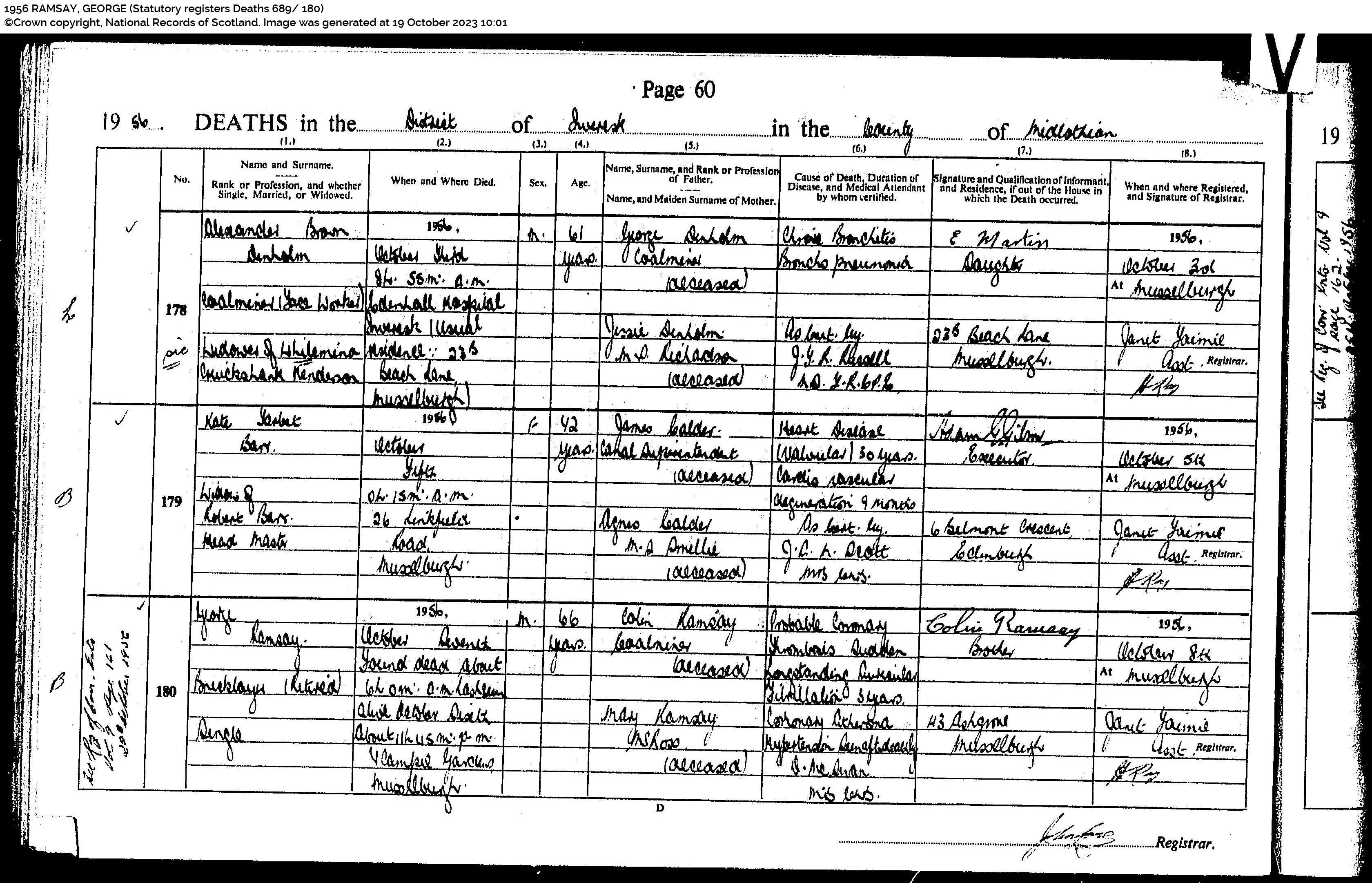 | 199 | SP | STAT | DEA | 1956 | R179.jpg | 1956-10-07 DEA George Ramsay son of Colin Ramsay and Mary Hunter Ross – 4 Campie Gardens, Musselburgh [[R179]] | LOCAL | ONLINE |