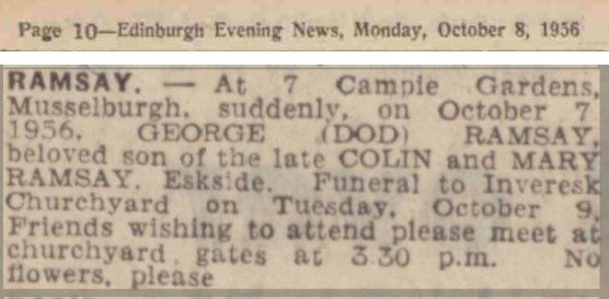 | 221 | BNA | NEWS | NEW | 1956 | R203.jpg | 1956-10-08 NEW Death of George Ramsay – 4 Campie Gardens, Musselburgh [[R203]] | LOCAL | ONLINE |